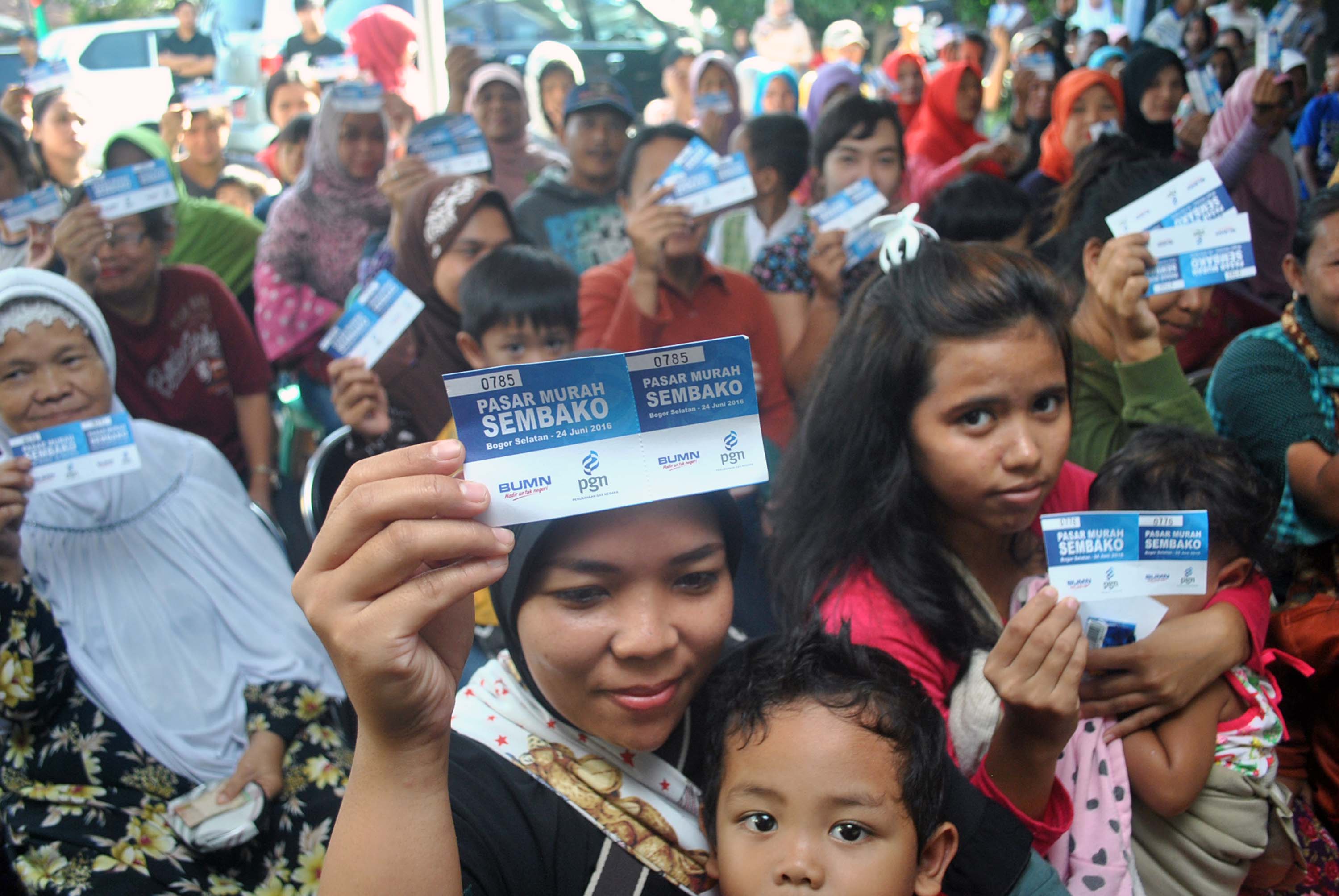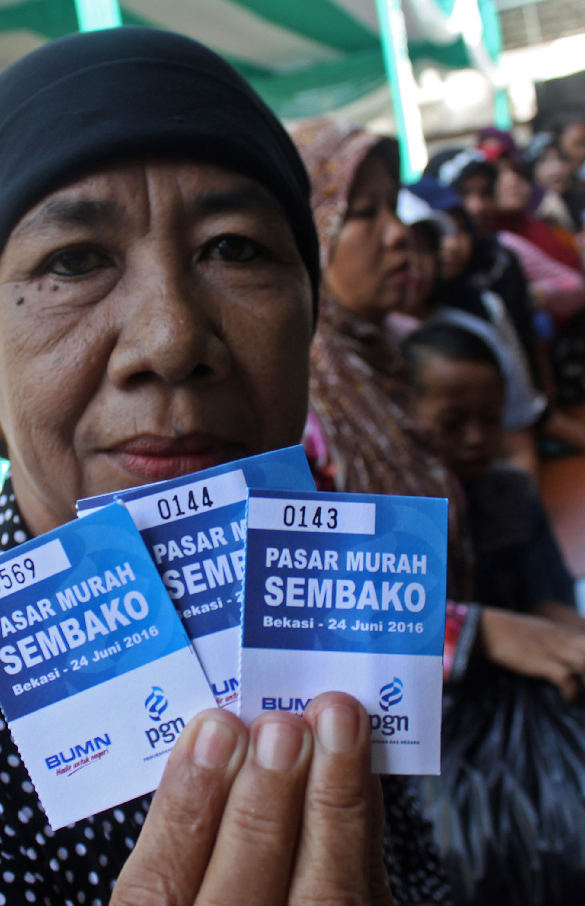 Seorang warga menunjukan kupon penukaran paket sembako di pasar murah yang digelar PT Perusahaan Gas Negara (PGN) di Kantor Desa Segarajaya, Tarumajaya, Kabupaten Bekasi, Jawa Barat, Jumat (24/6). Sebanyak dua ribu paket sembako dibagikan PT Perusahaan Gas Negara (PGN) melalui pasar murah sembako tersebut yang diperuntukan bagi warga yang berada di wilayah pembangunan pipa gas PGN khusunya bagi warga yang kurang mampu agar memudahkan mendapatkan kebutuhan sembako menjelang Idul Fitri. ANTARA FOTO/Risky Andrianto/foc/16.