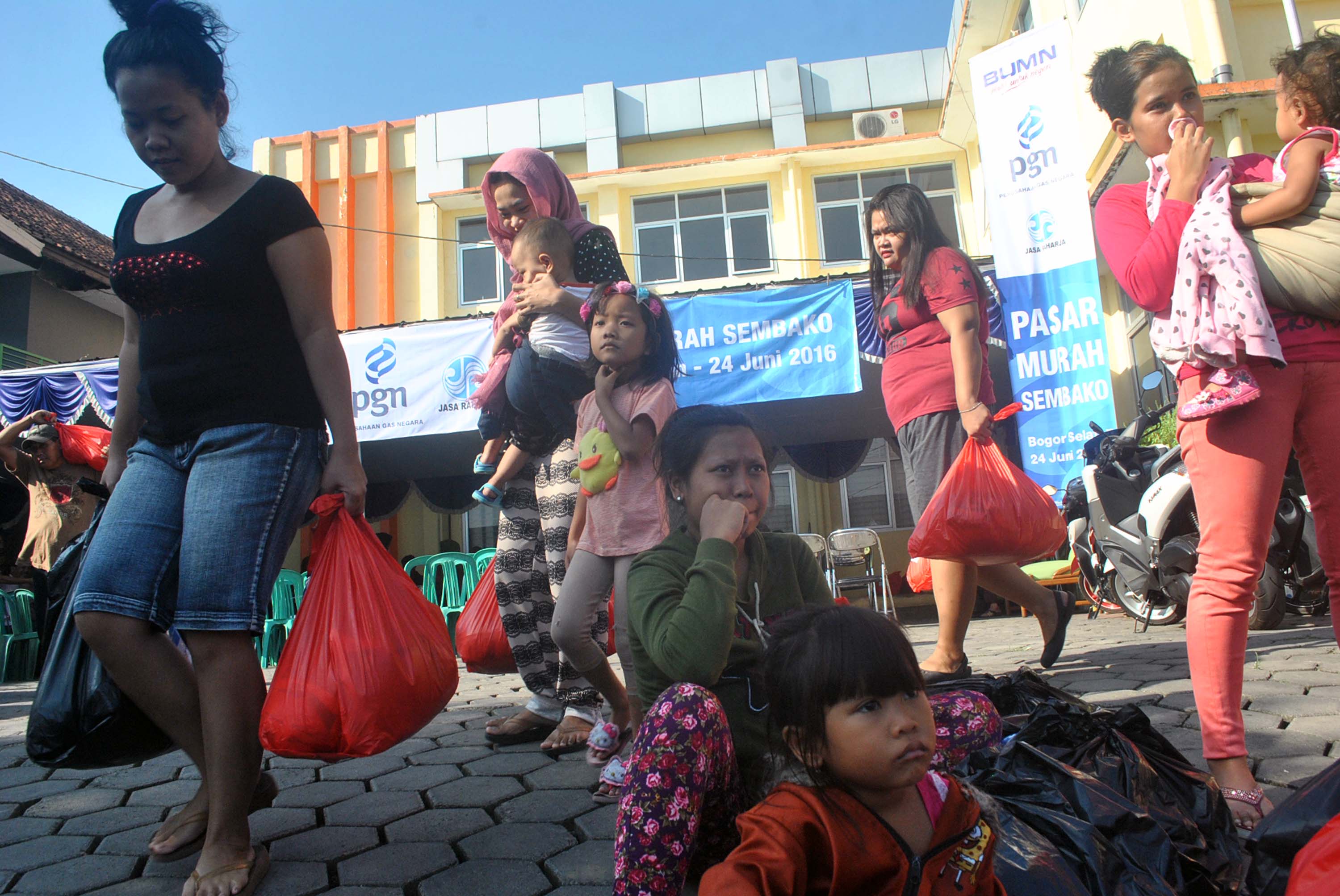 Sejumlah warga membawa paket sembako saat pasar murah sembako di halaman kantor Kecamatan Bogor Selatan, jalan Layungsari, Kota Bogor, Jawa Barat, Jum'at (24/6). Pasar murah sembako yang diselenggarakan Perusahaan Gas Negara (PGN) dengan membagikan 1000 paket sembako yang berisi beras 10 liter, gula 2 kg dan minyak goreng 2 liter yang dijual dengan harga Rp. 25 ribu tersebut sebagai bentuk kepedulian untuk masyarakat yang membutuhkan di bulan Ramadan. ANTARA FOTO/Arif Firmansyah/pd/16