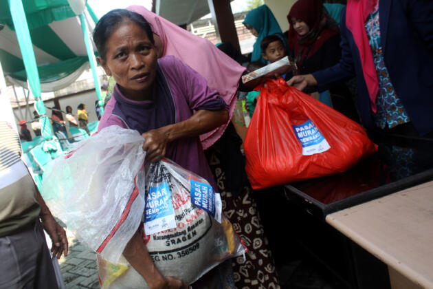 Warga mengangkat karung berisi bahan bahan kebutuhan pokok usai menukarkan kupon pasar murah sembako yang digelar PT Perusahaan Gas Negara (PGN) di Kantor Desa Segarajaya, Tarumajaya, Kabupaten Bekasi, Jawa Barat, Jumat (24/6). Sebanyak dua ribu paket sembako dibagikan PT Perusahaan Gas Negara (PGN) melalui pasar murah sembako tersebut yang diperuntukan bagi warga yang berada di wilayah pembangunan pipa gas PGN khusunya bagi warga yang kurang mampu agar memudahkan mendapatkan kebutuhan sembako menjelang Idulfitri. ANTARA FOTO/Risky Andrianto/pd/16