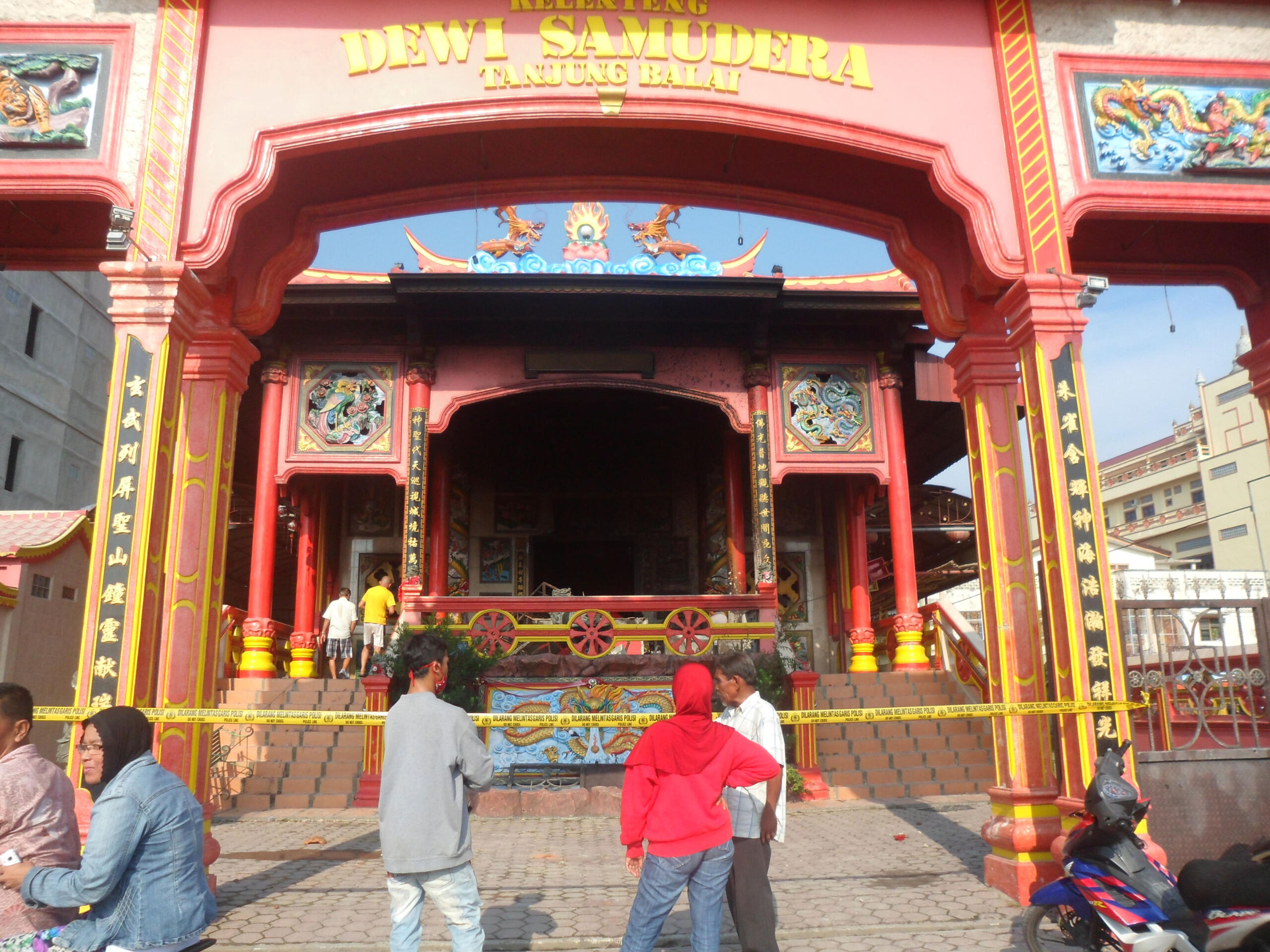 Sejumlah warga melihat kondisi Kelenteng Dewi Samudera yang telah dipasang garis polisi pasca kerusuhan, di Tanjung Balai, Sumatera Utara, Sabtu (30/7). Kerusuhan yang terjadi di Tanjung Balai pada Jumat (29/7) menyebabkan sejumlah vihara dan kelenteng rusak. ANTARA FOTO/Anton/im/nz/16