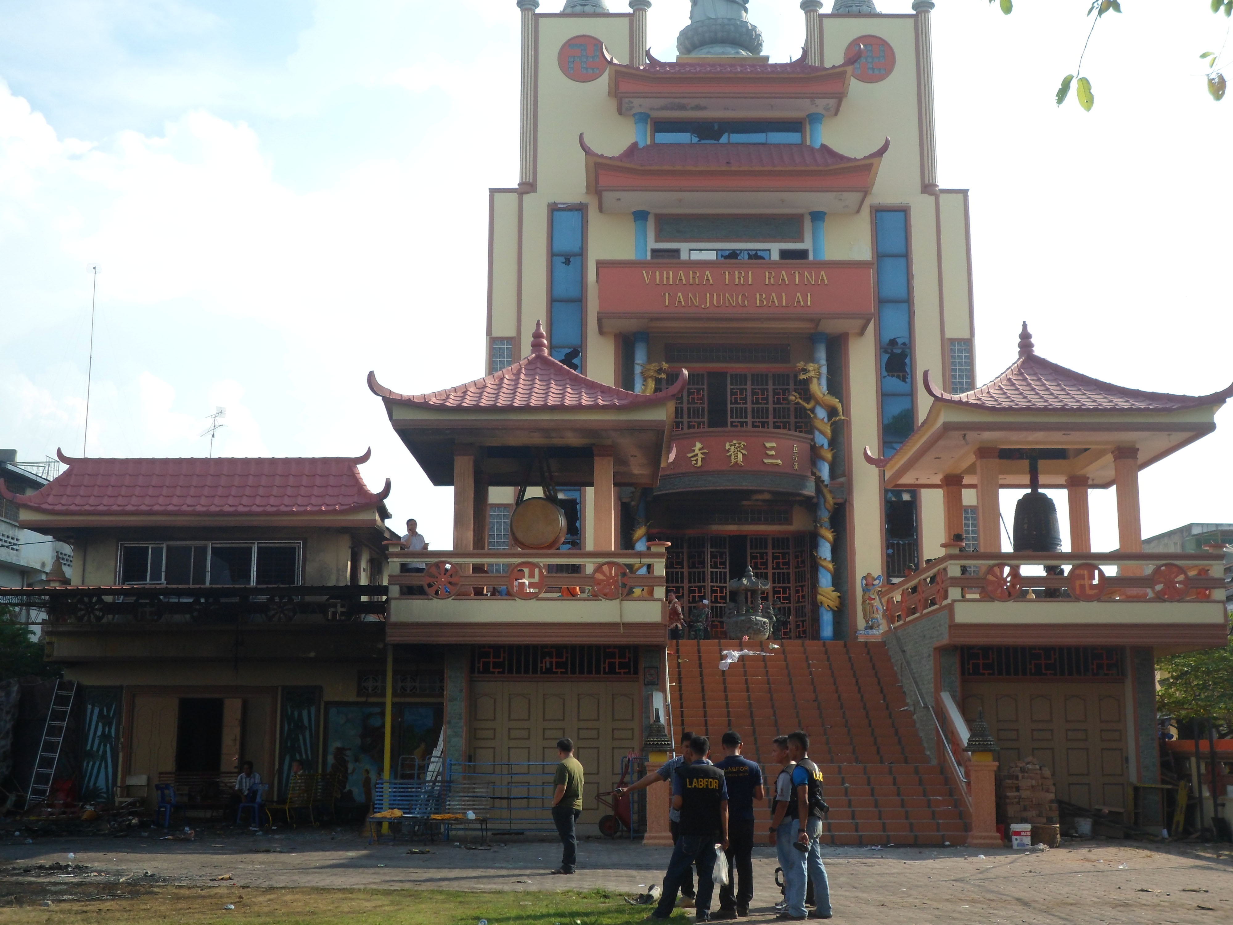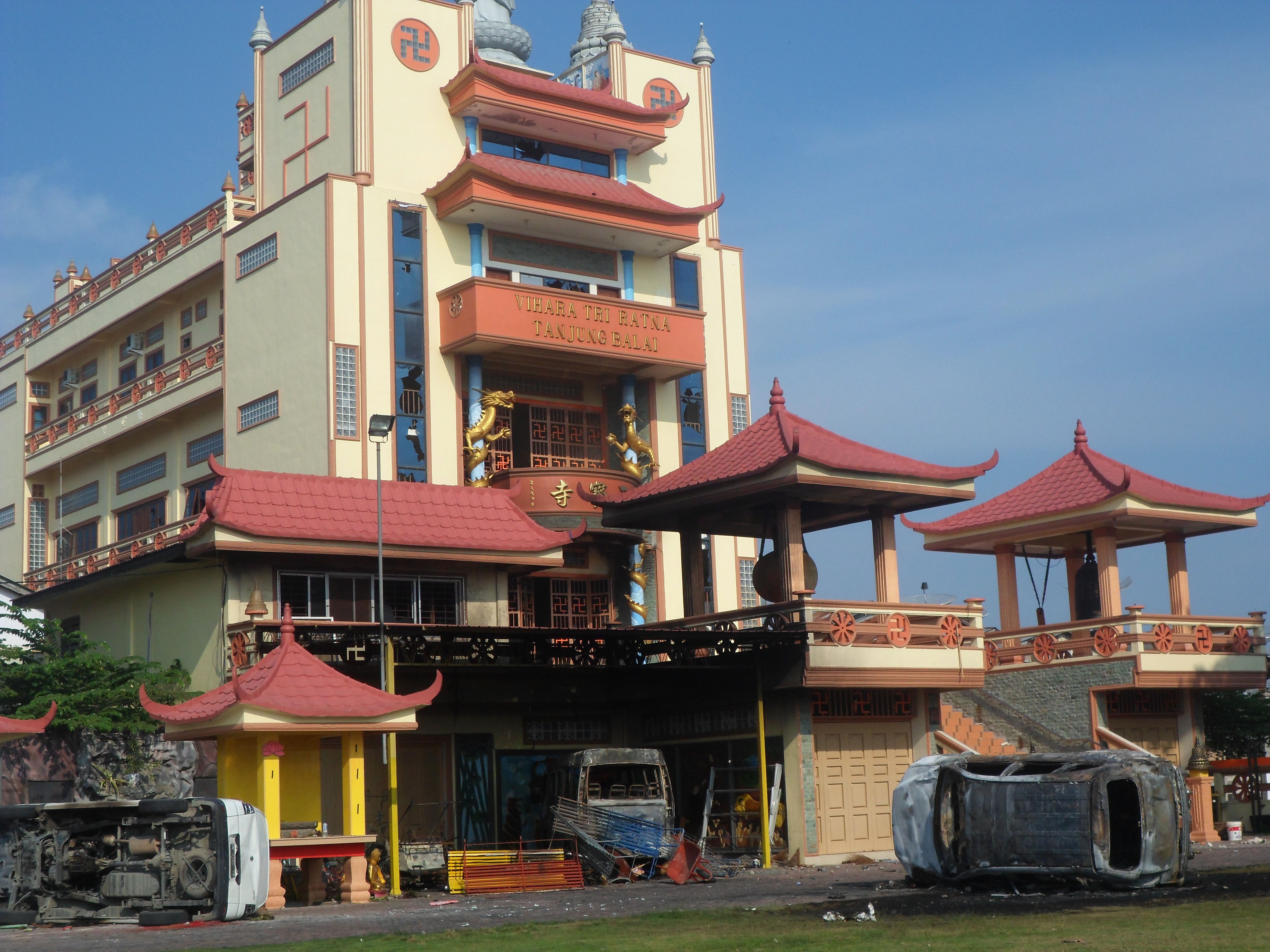 Kondisi Vihara Tri Ratna yang rusak pasca kerusuhan yang terjadi, di Tanjung Balai, Sumatera Utara, Sabtu (30/7). Kerusuhan yang terjadi di Tanjung Balai pada Jumat (29/7) menyebabkan sejumlah vihara dan kelenteng rusak. ANTARA FOTO/Anton/im/NZ/16