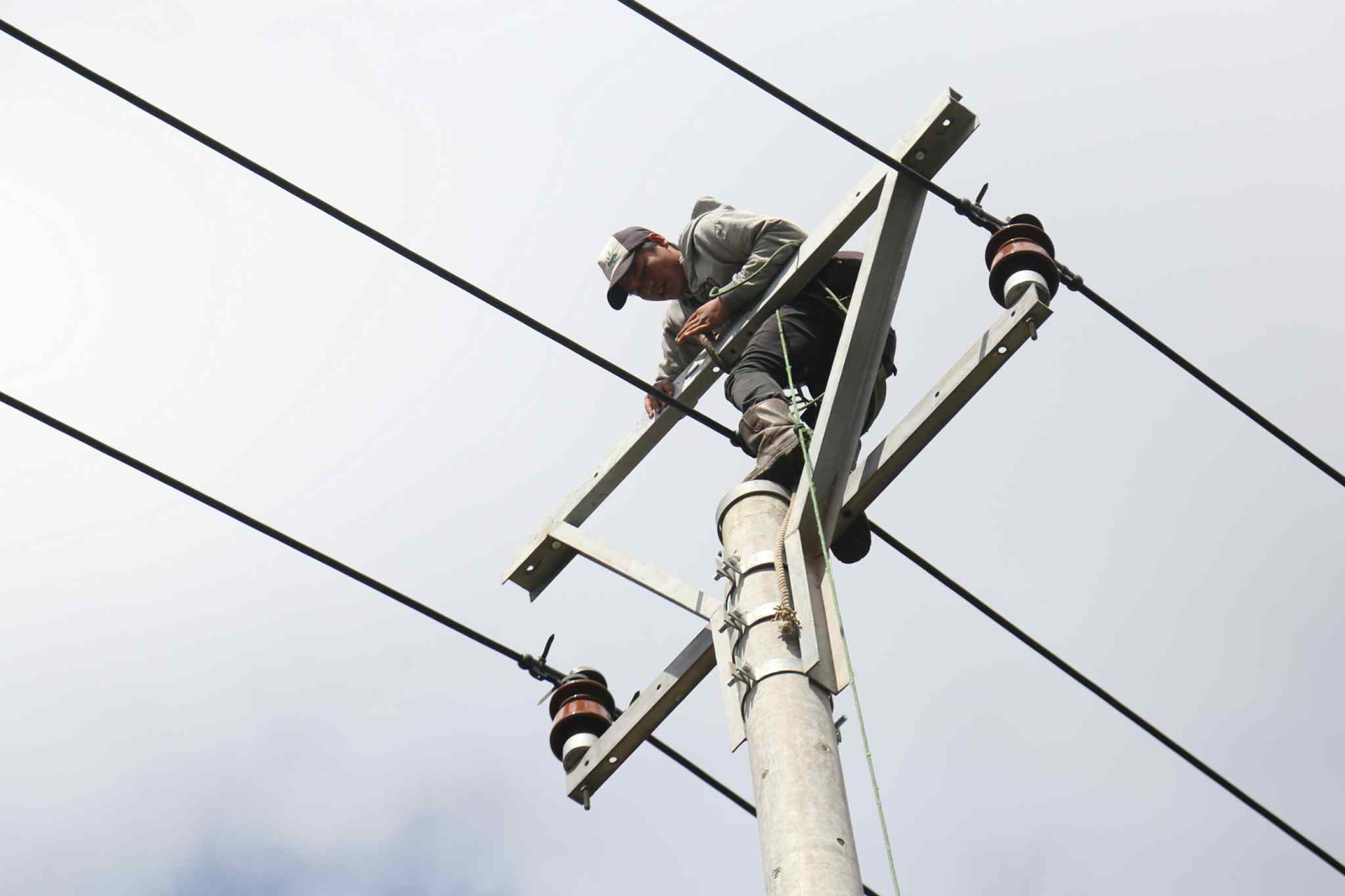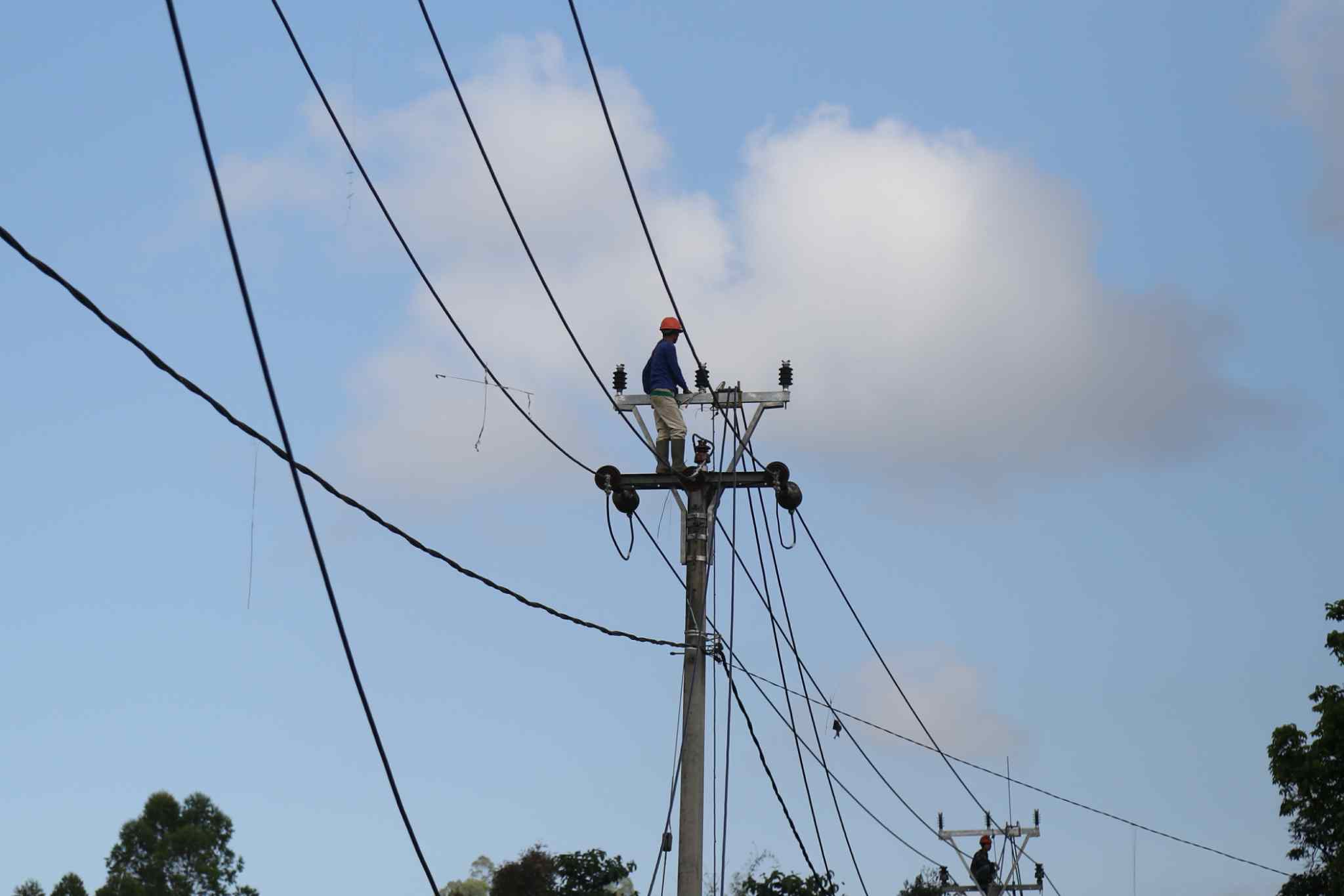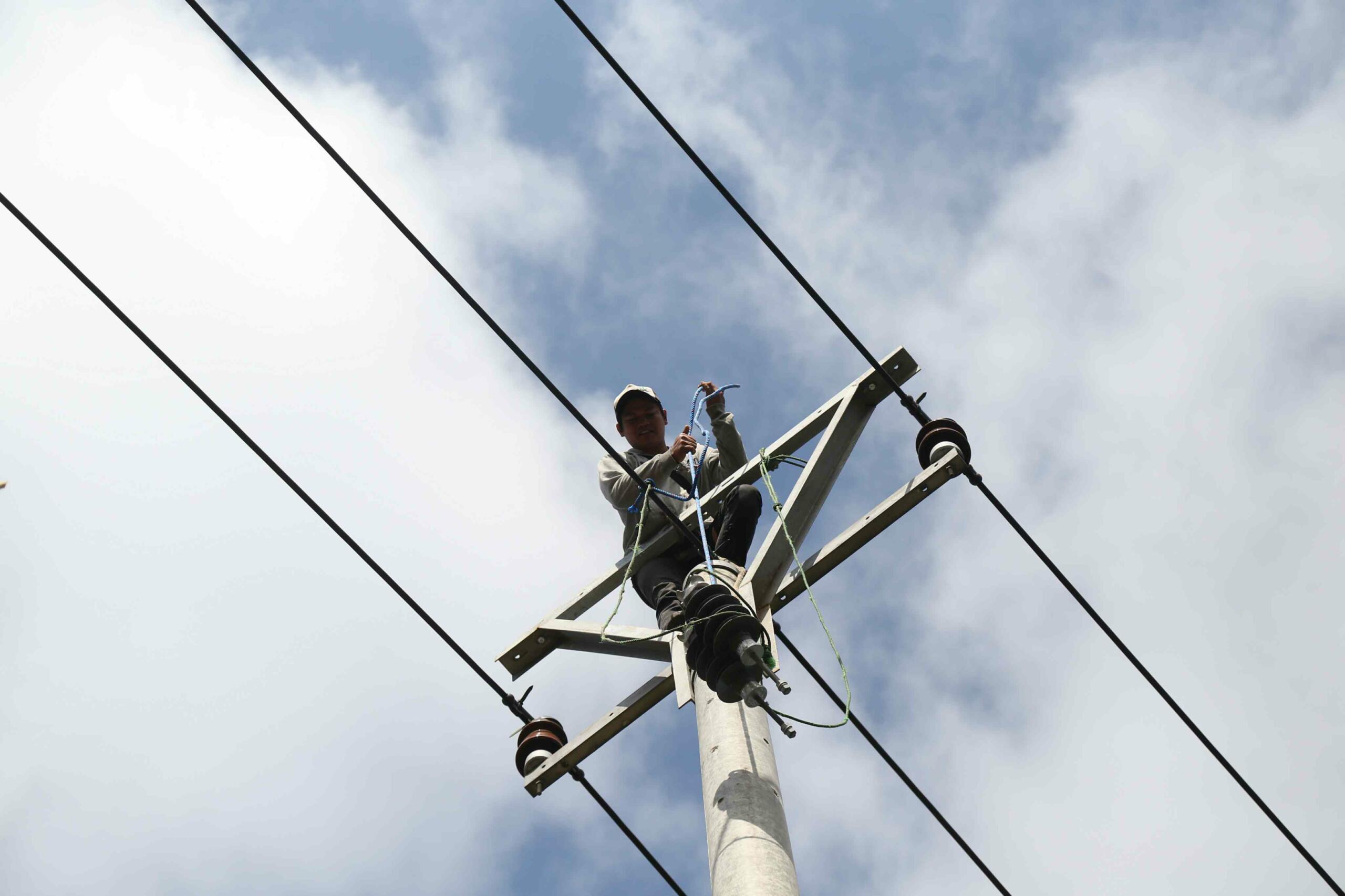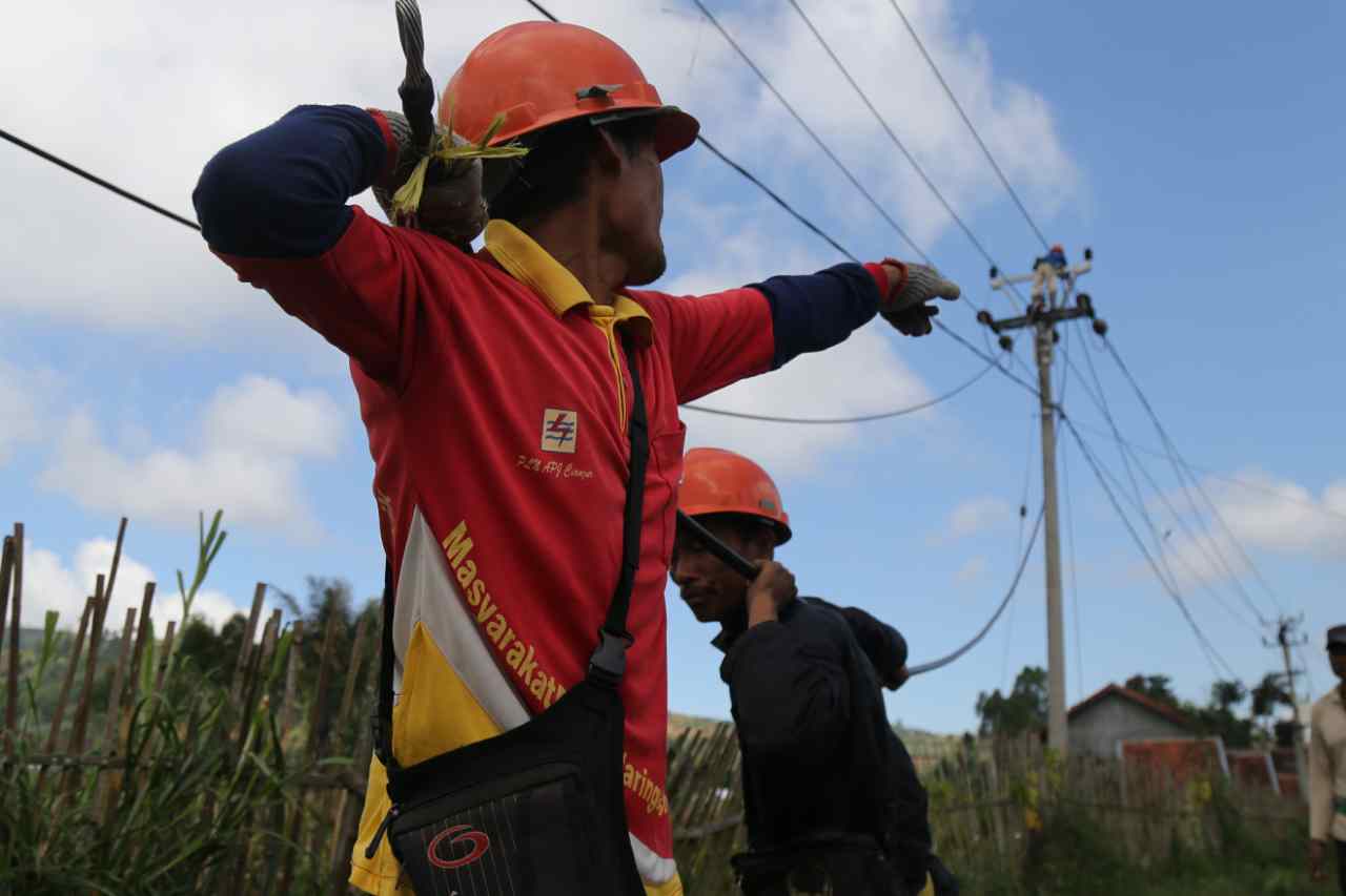 Pekerja melakukan pemasangan kabl listrik Perusahaan Listrik Negara (PLN) di Cikajang, Garut, Kamis (25/8). Presiden Joko Widodo menekankan agar daerah-daerah yang kurang pasokan listrik diberikan prioritas dalam pembangunan kelistrikan. Baik lewat percepatan dengan mobile power plant maupun lewat kapal, sehingga keluhan dari masyarakat bisa diatasi. AKTUAL/TINO OKTAVIANO