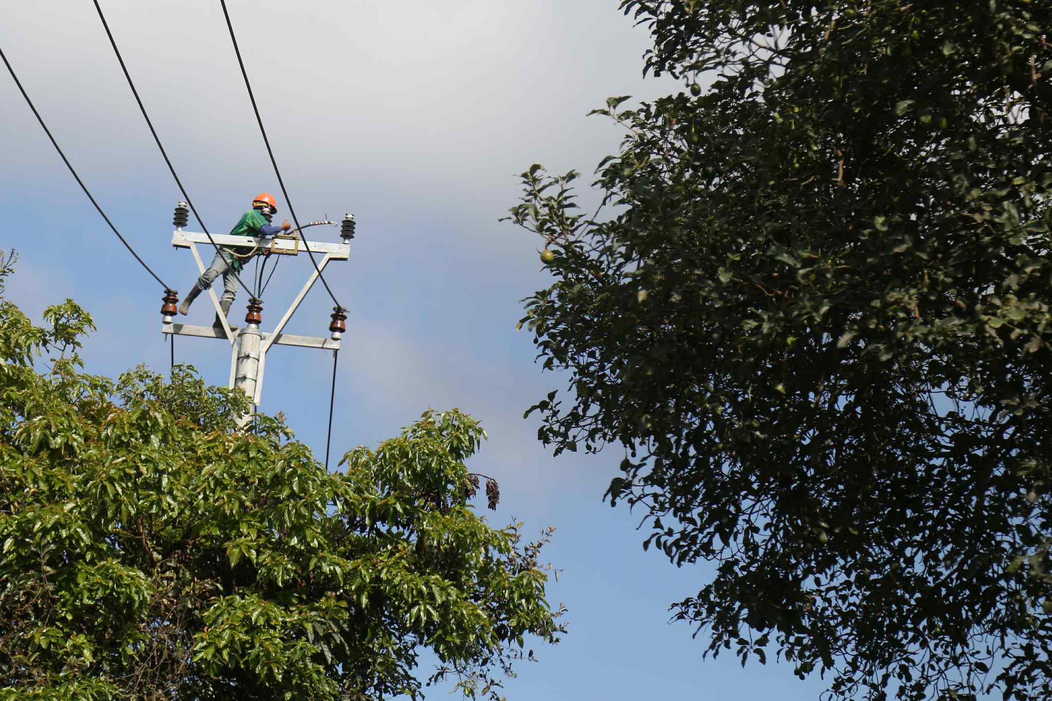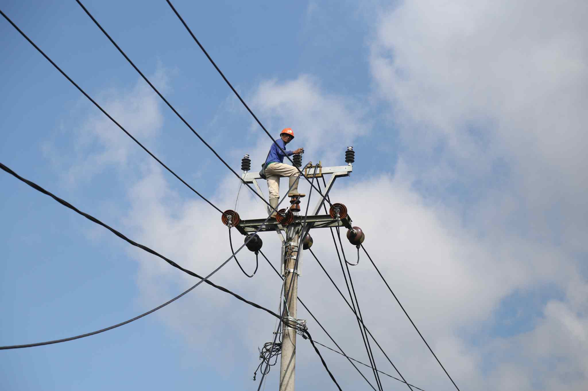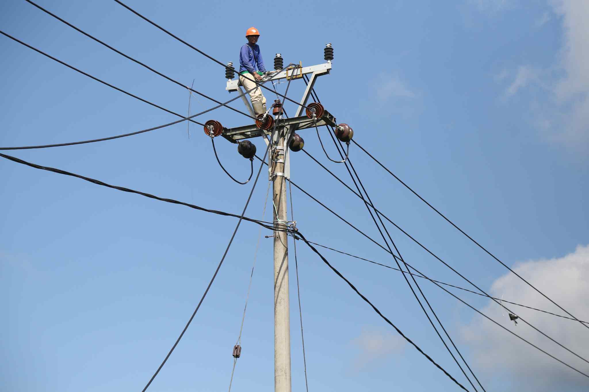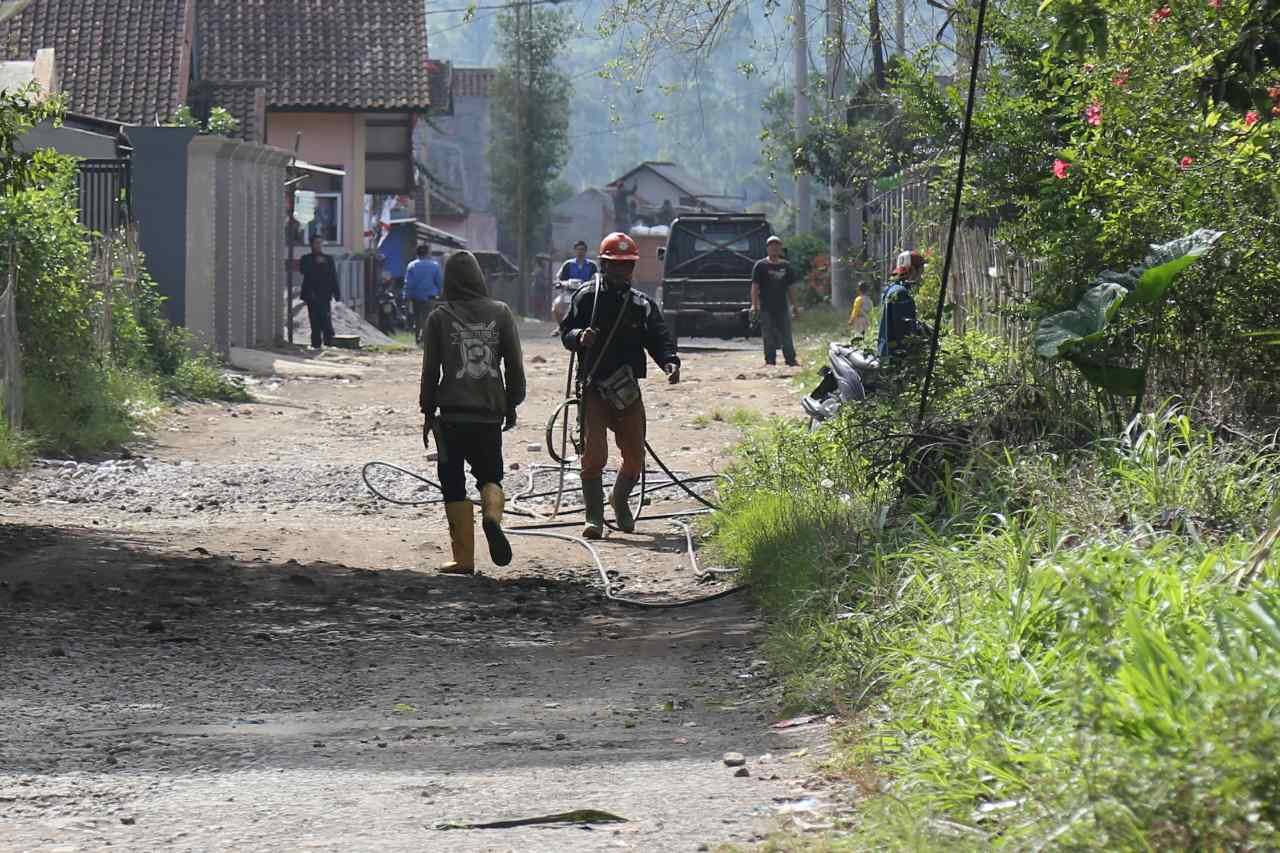 Pekerja melakukan pemasangan kabl listrik Perusahaan Listrik Negara (PLN) di Cikajang, Garut, Kamis (25/8). Presiden Joko Widodo menekankan agar daerah-daerah yang kurang pasokan listrik diberikan prioritas dalam pembangunan kelistrikan. Baik lewat percepatan dengan mobile power plant maupun lewat kapal, sehingga keluhan dari masyarakat bisa diatasi. AKTUAL/TINO OKTAVIANO