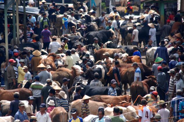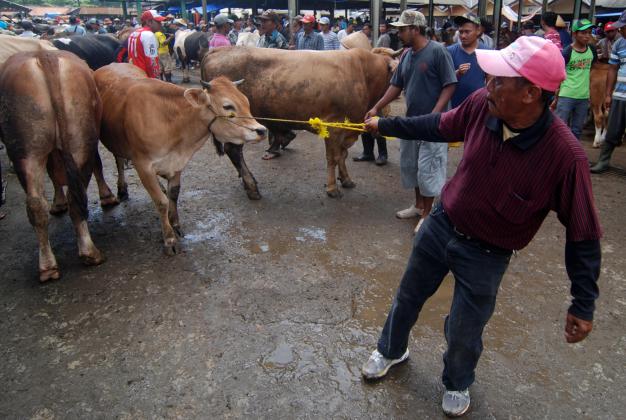 Suasana aktivitas jual beli sapi lokal di Pasar Hewan Ambarawa, Kabupaten Semarang, Jawa Tengah, Selasa (23/2). Kementerian Pertanian menyebutkan total kebutuhan daging sapi di Indonesia pada 2016 mencapai 674.690 ton yang dipasok dari dalam negeri sekitar 2,5 juta ekor per tahun atau 441.761 ton, sementara kekurangannya sekitar 232.929 ton atau setara dengan 600.000 ekor sapi hidup dan daging sapi 112.953 ton harus dipenuhi dari impor. ANTARA FOTO/Aditya Pradana Putra/aww/16.