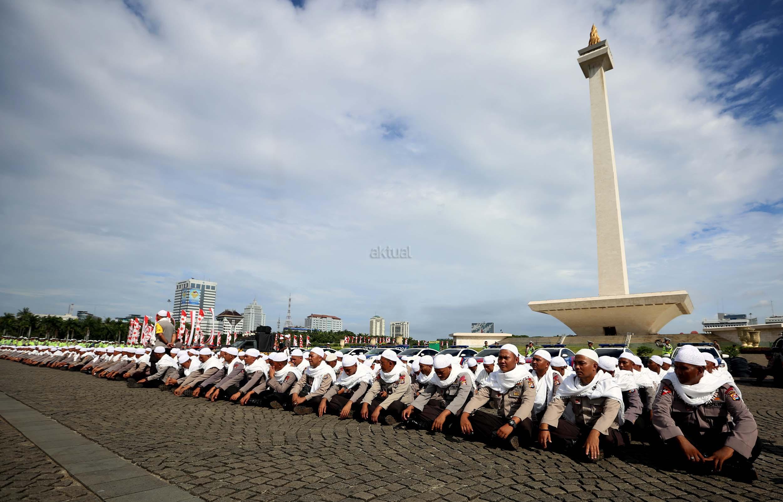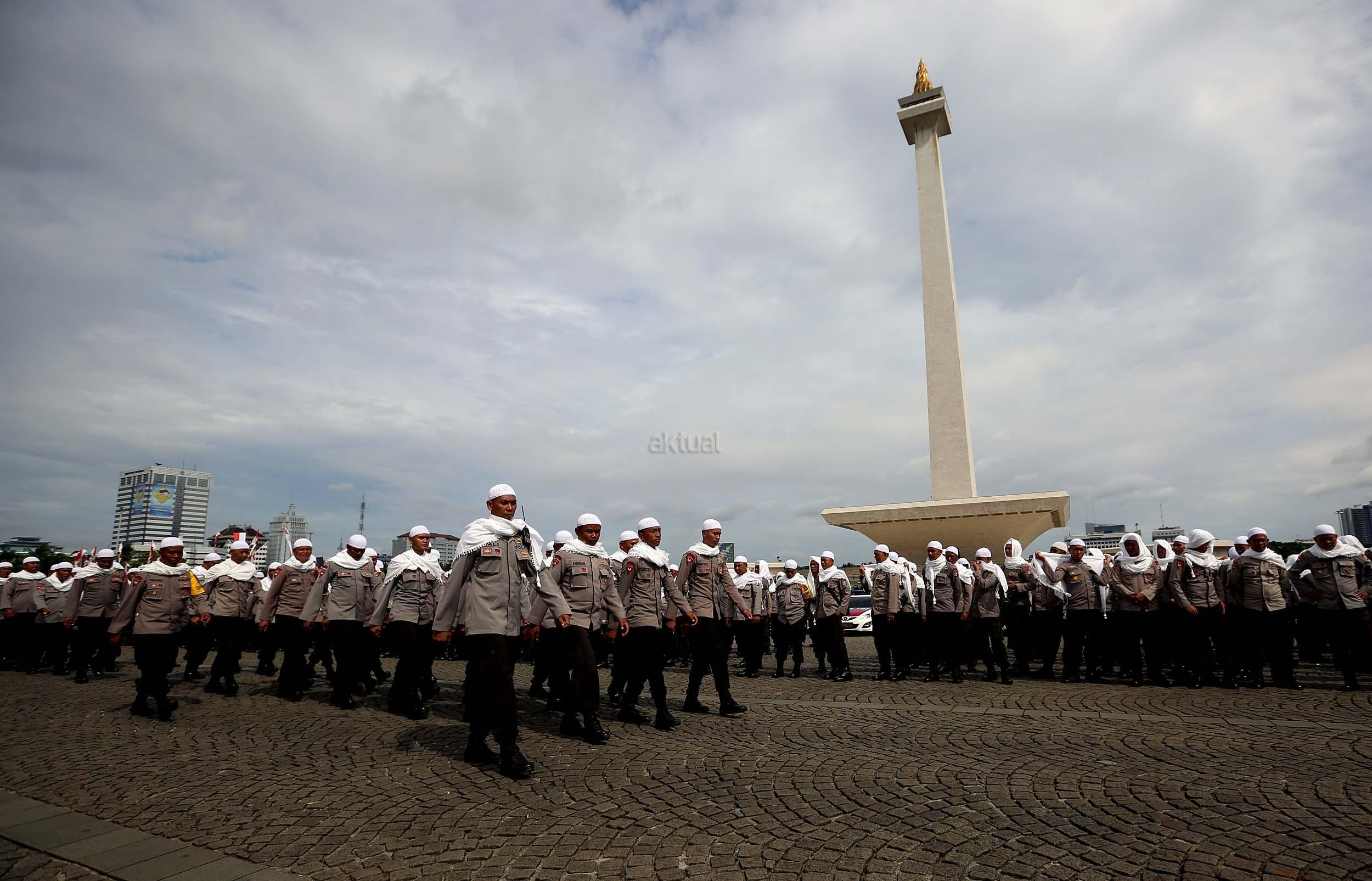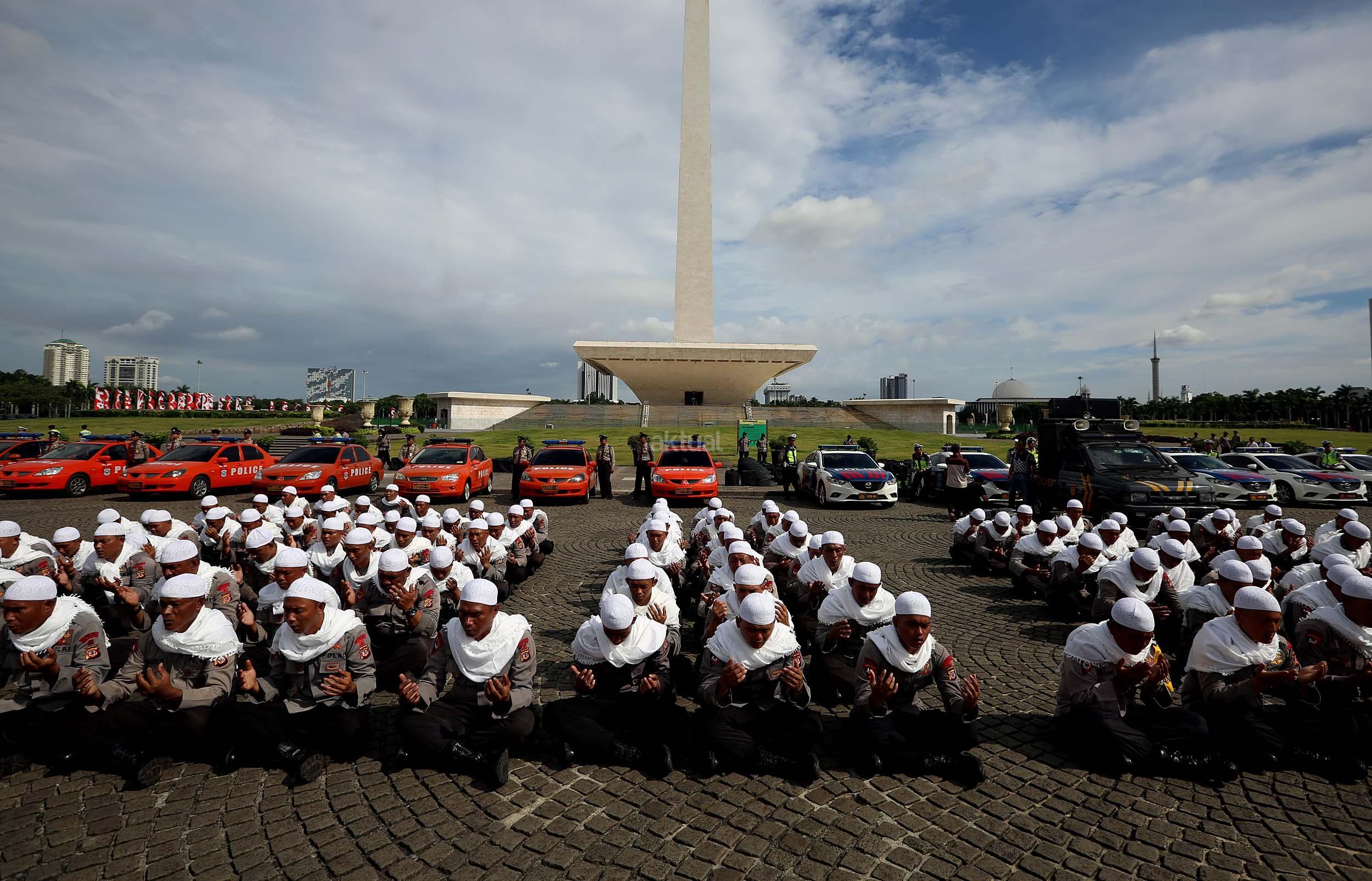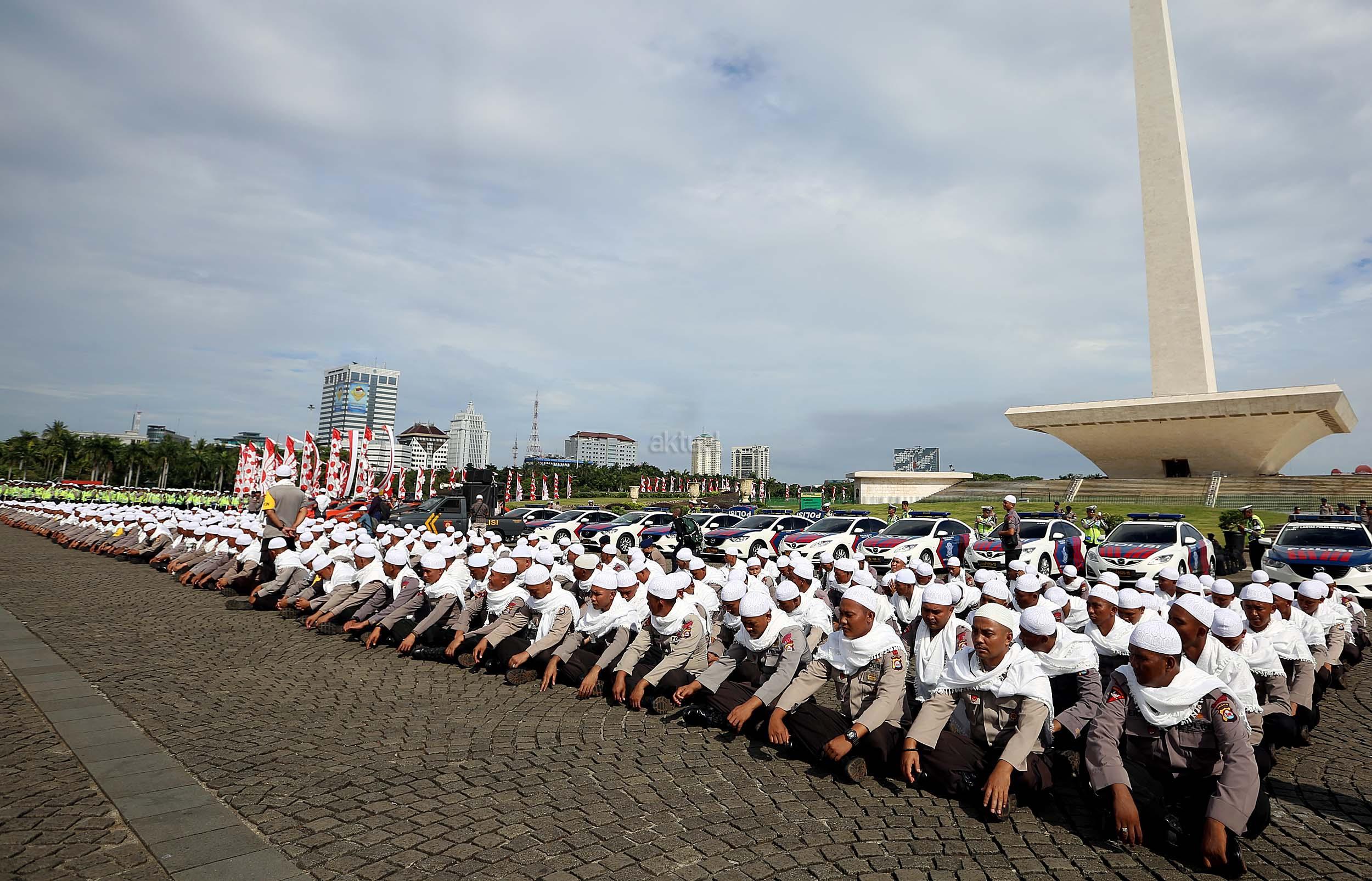 Sejumlah anggota kepolisian yang sekaligus pasukan Asmaul Husna berdoa saat mengikuti apel gelar pasukan pengamanan aksi bela Islam jilid III (212) di Monas, Jakarta, Kamis (1/12/2016). Sebanyak 3.539 aparat gabungan dikerahkan untuk mengamankan aksi 212 yang diisi dengan kegiatan zikir dan doa . AKTUAL/Munzir