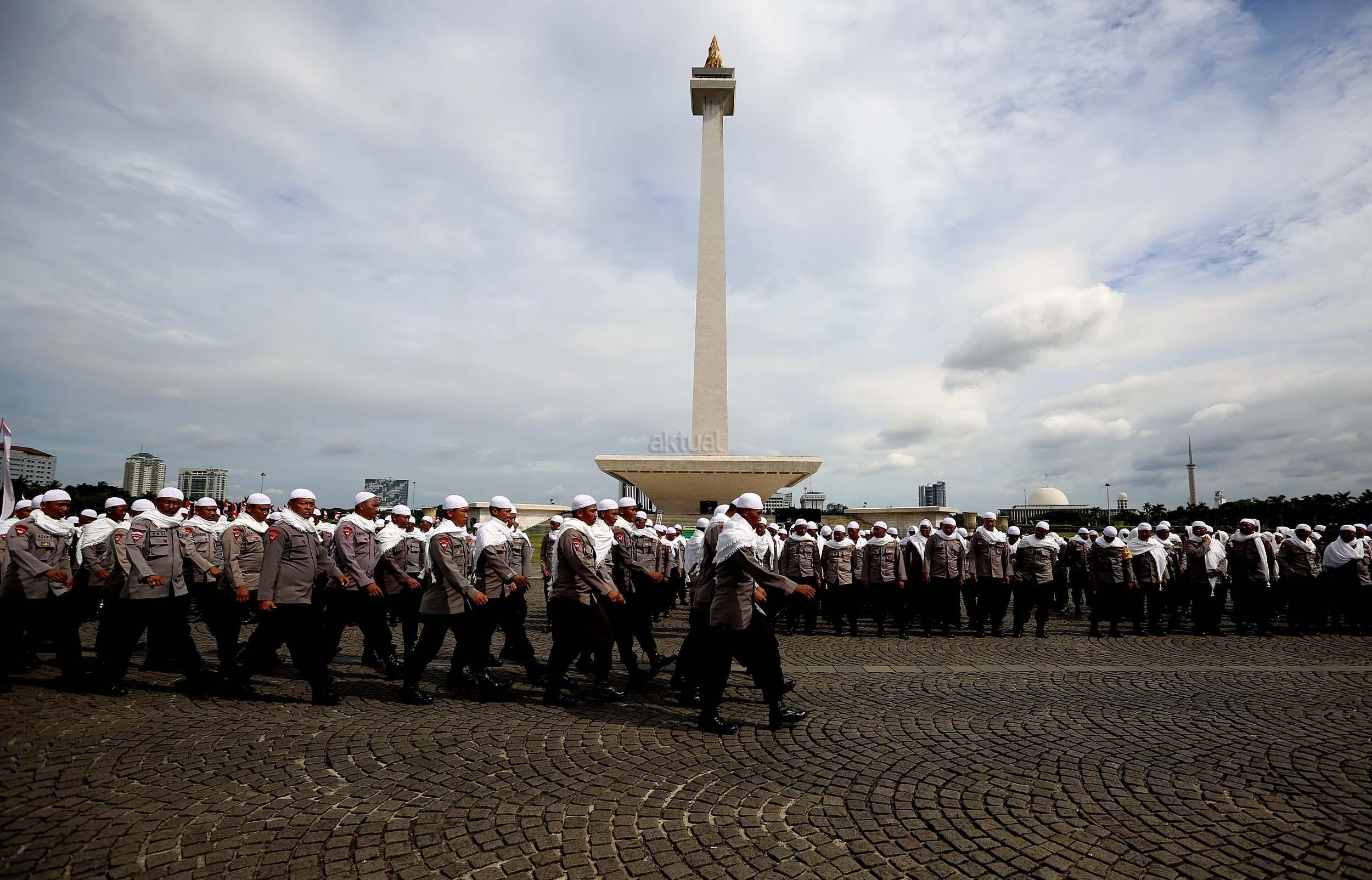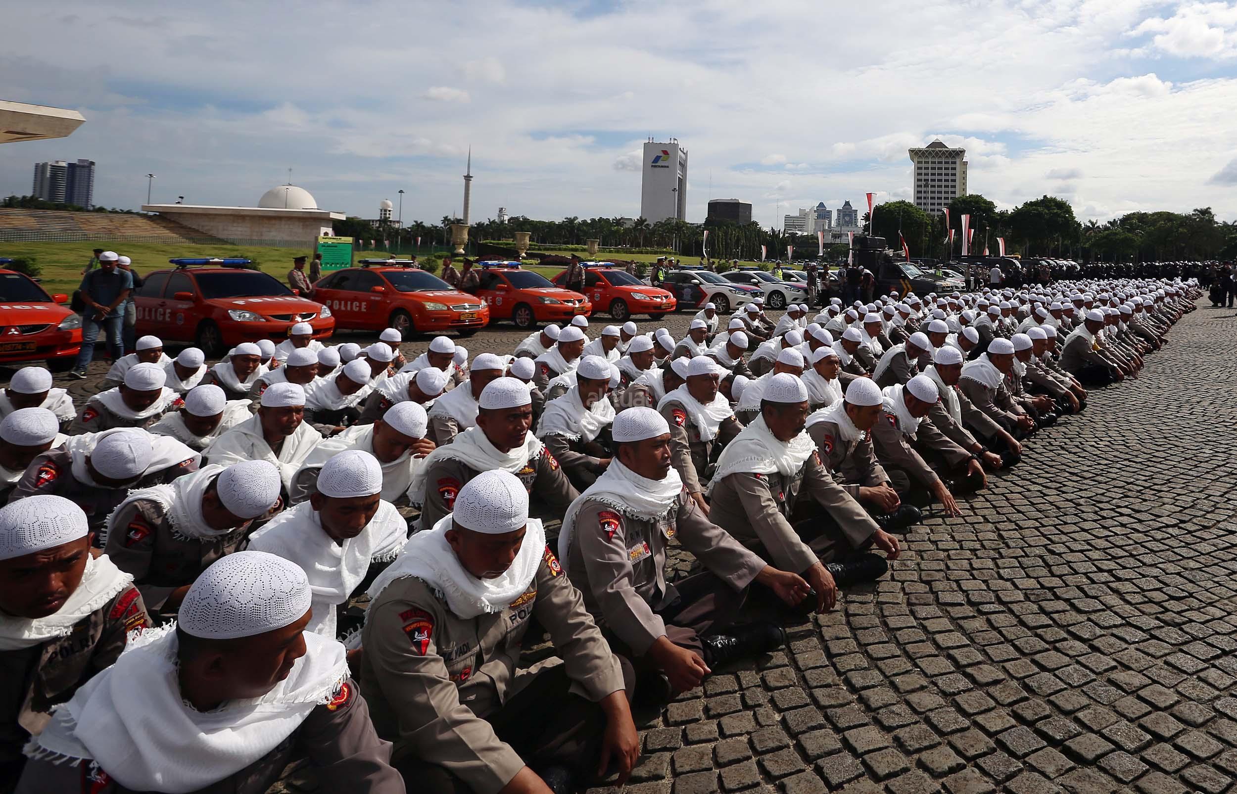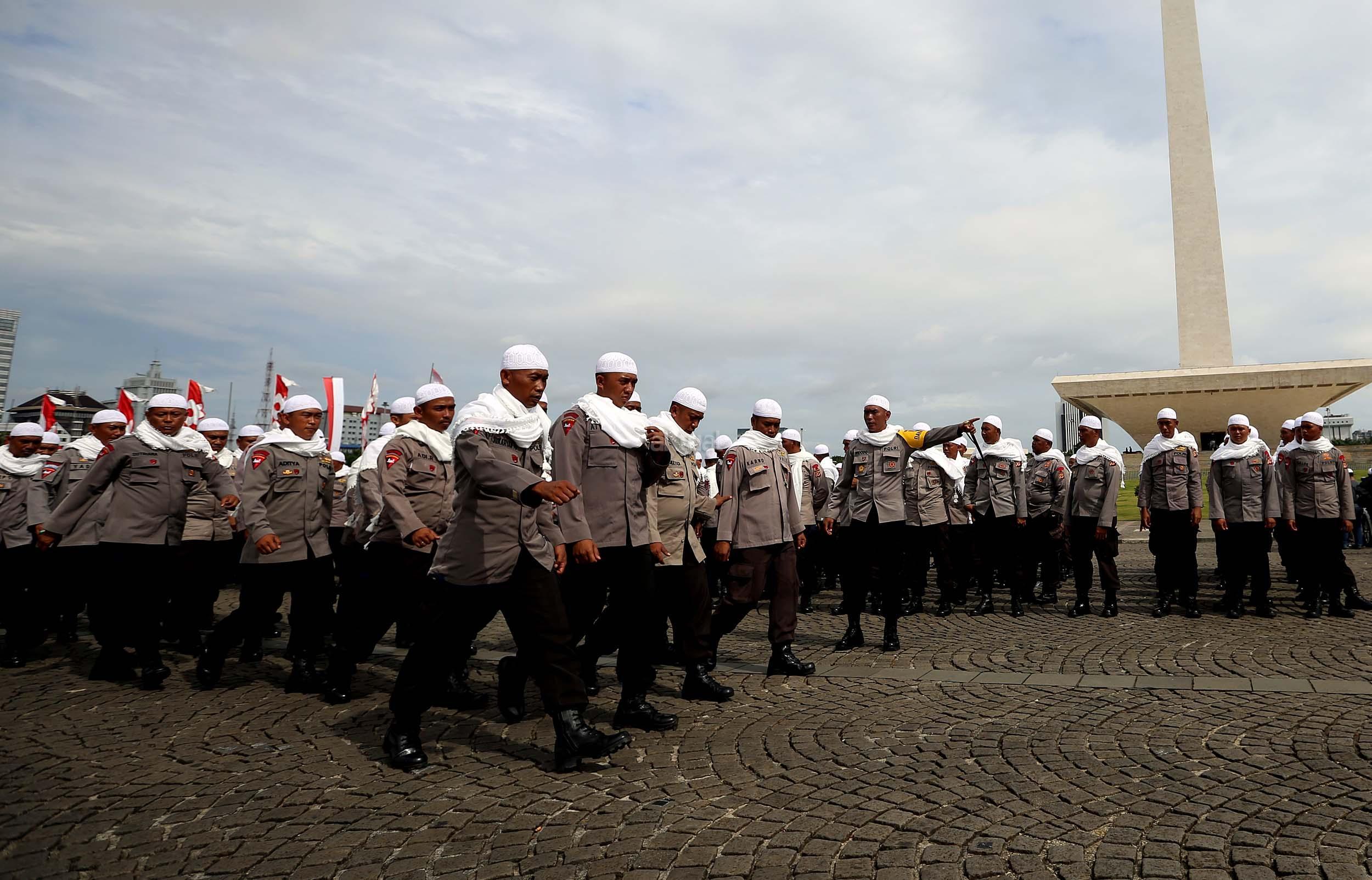 Sejumlah anggota kepolisian yang sekaligus pasukan Asmaul Husna berdoa saat mengikuti apel gelar pasukan pengamanan aksi bela Islam jilid III (212) di Monas, Jakarta, Kamis (1/12/2016). Sebanyak 3.539 aparat gabungan dikerahkan untuk mengamankan aksi 212 yang diisi dengan kegiatan zikir dan doa . AKTUAL/Munzir