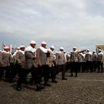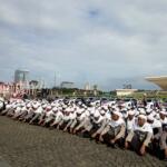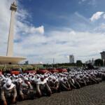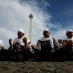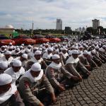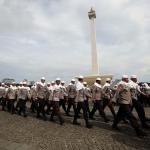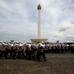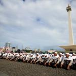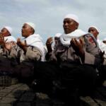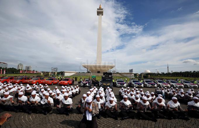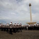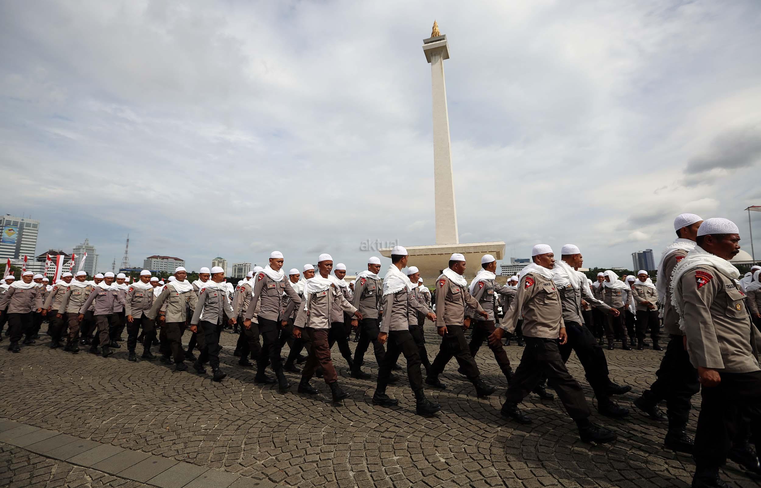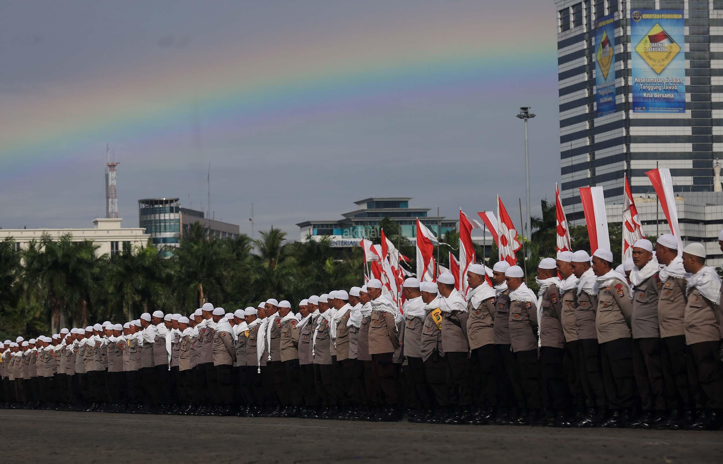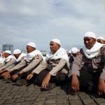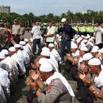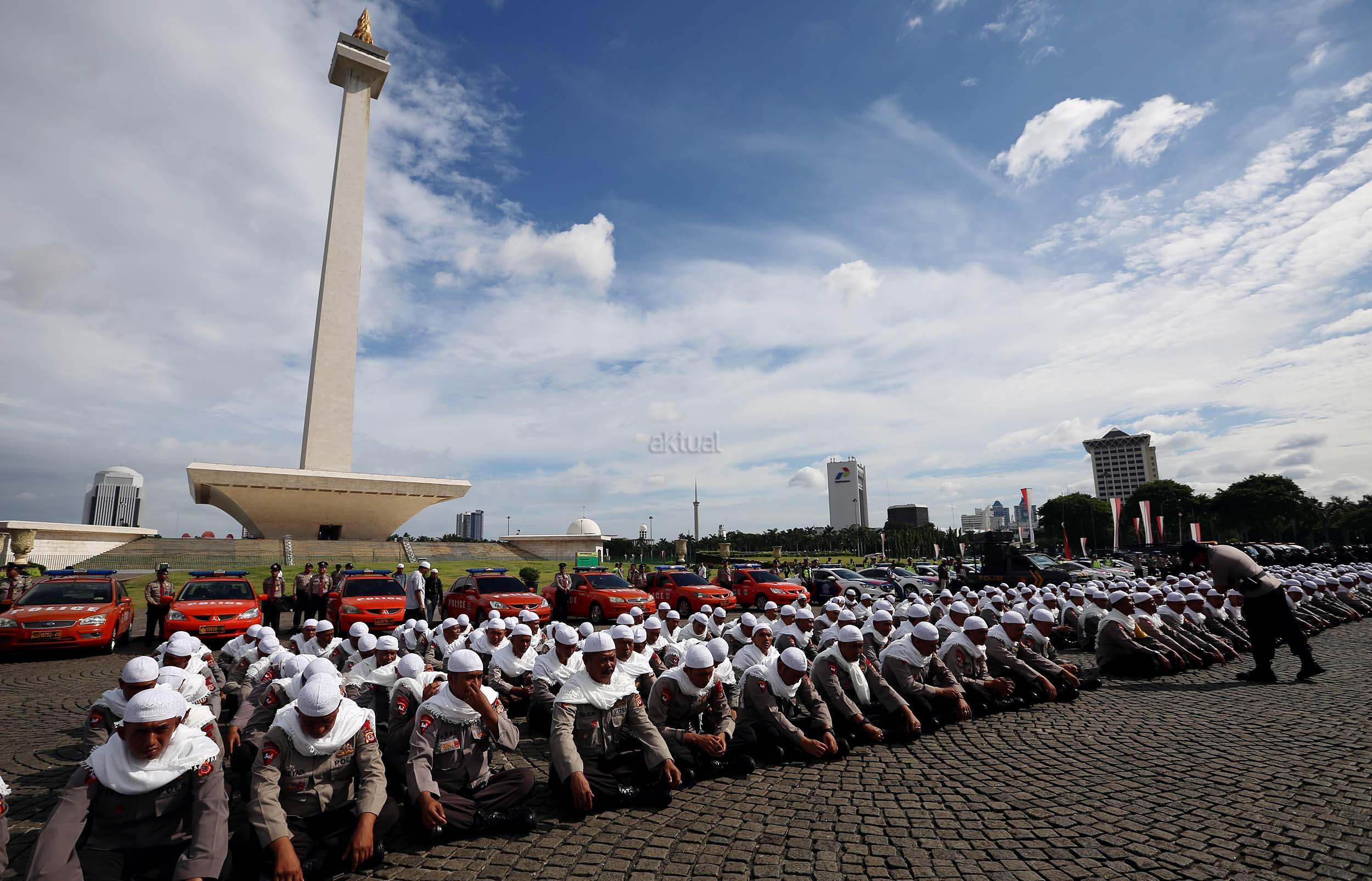 Sejumlah anggota kepolisian yang sekaligus pasukan Asmaul Husna berdoa saat mengikuti apel gelar pasukan pengamanan aksi bela Islam jilid III (212) di Monas, Jakarta, Kamis (1/12/2016). Sebanyak 3.539 aparat gabungan dikerahkan untuk mengamankan aksi 212 yang diisi dengan kegiatan zikir dan doa . AKTUAL/Munzir