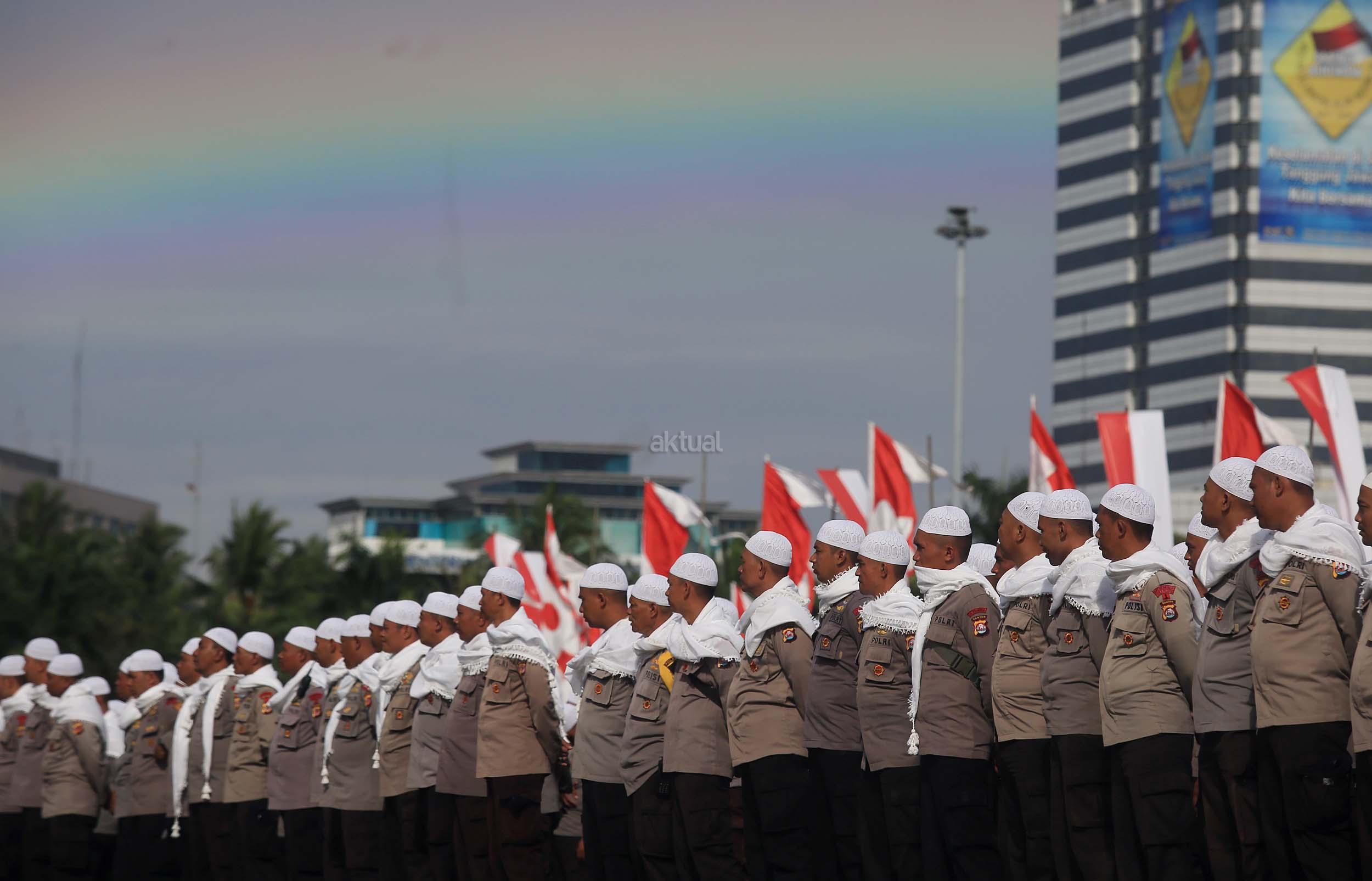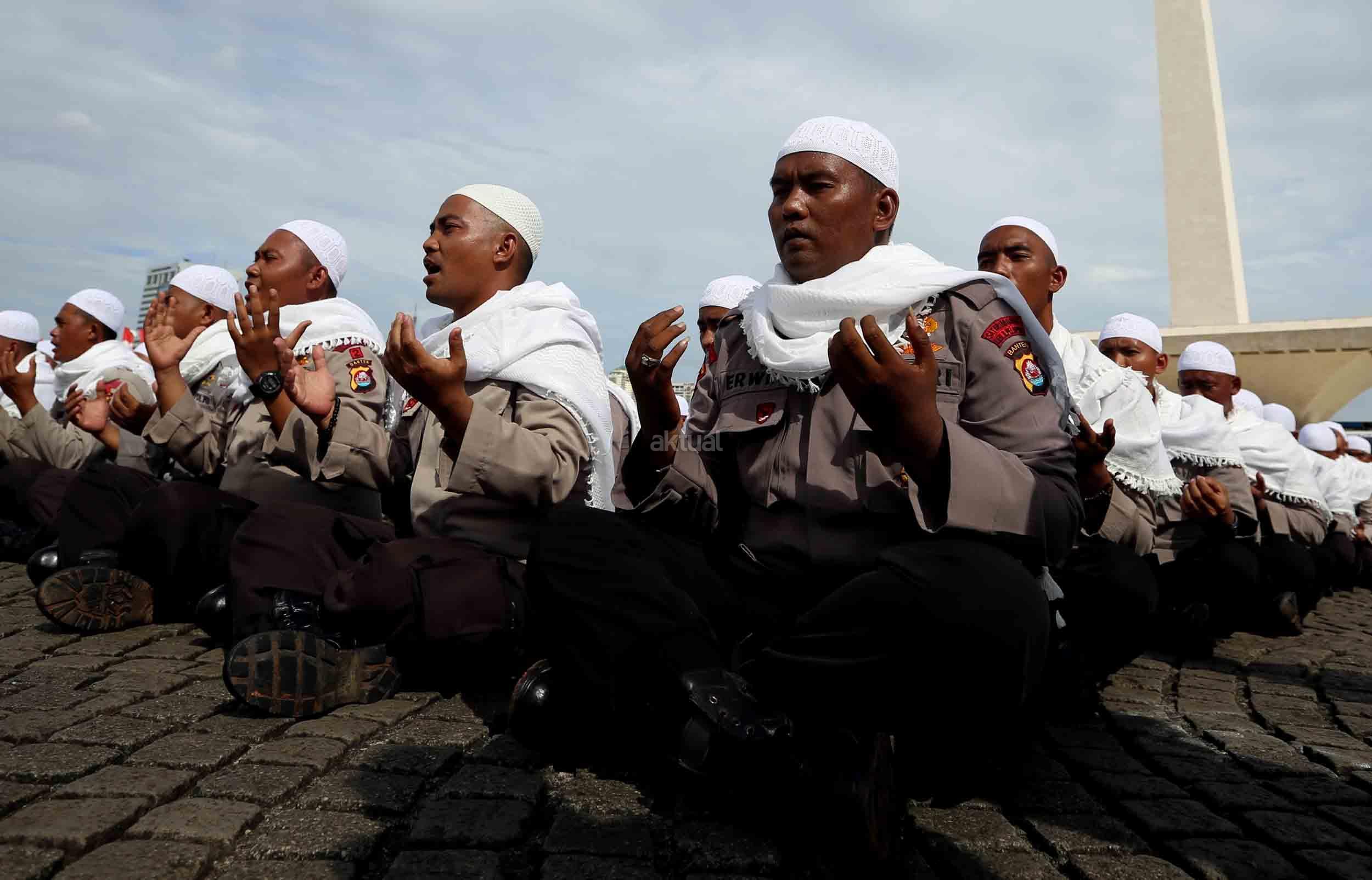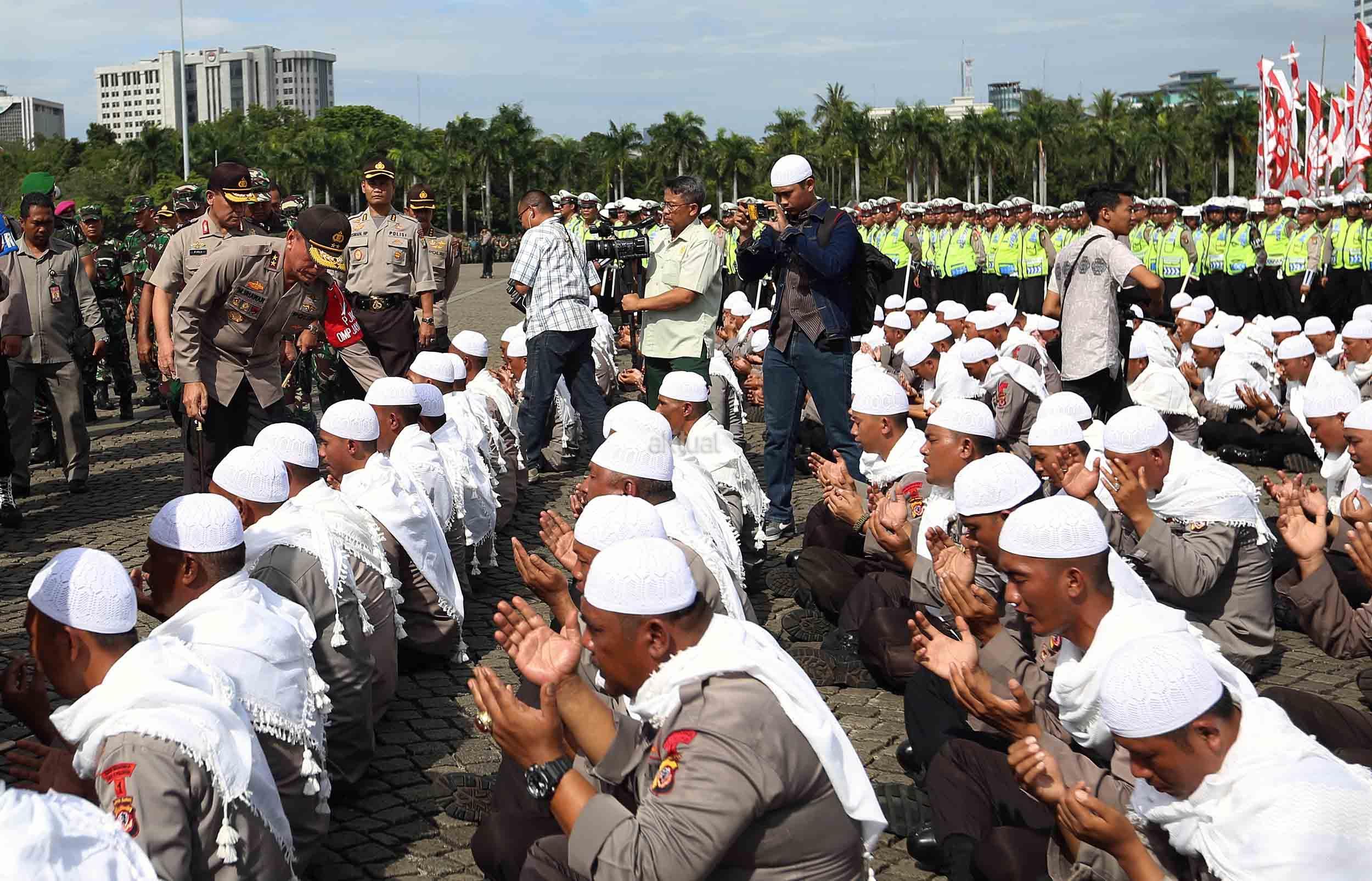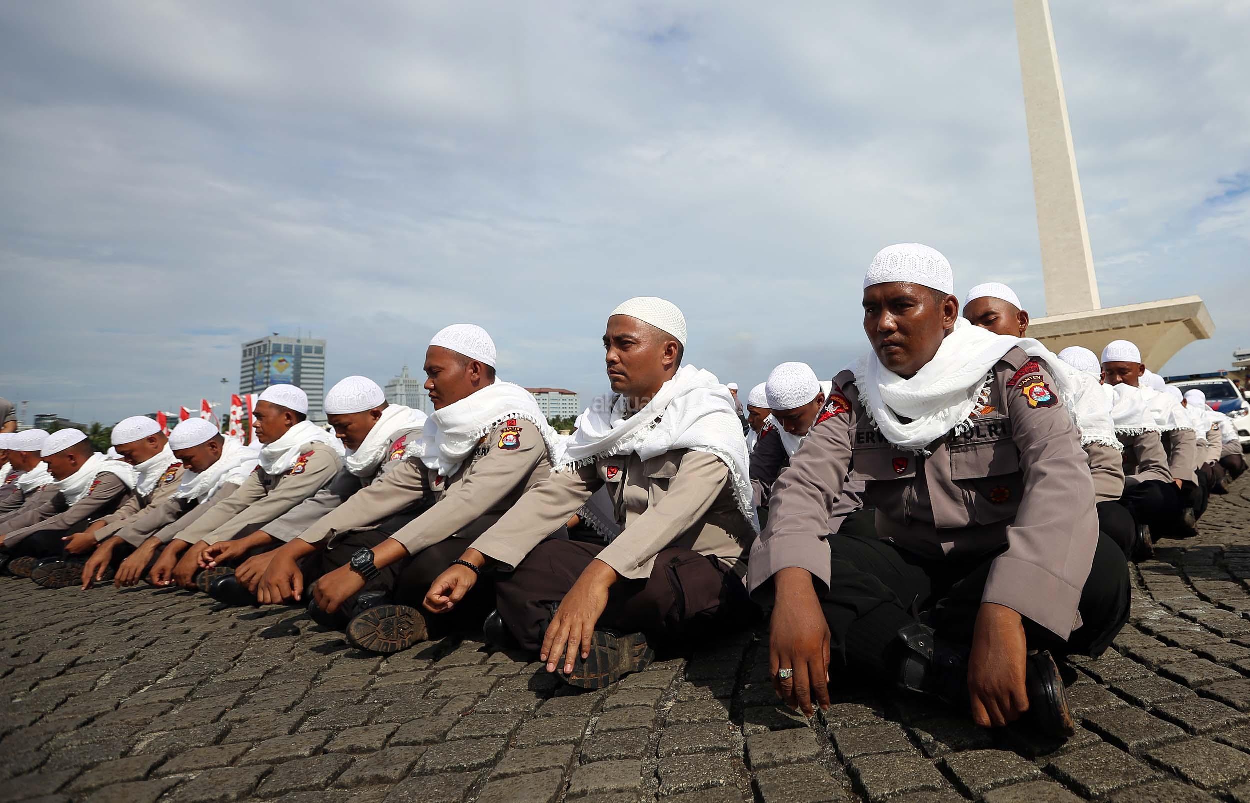 Sejumlah anggota kepolisian yang sekaligus pasukan Asmaul Husna berdoa saat mengikuti apel gelar pasukan pengamanan aksi bela Islam jilid III (212) di Monas, Jakarta, Kamis (1/12/2016). Sebanyak 3.539 aparat gabungan dikerahkan untuk mengamankan aksi 212 yang diisi dengan kegiatan zikir dan doa. AKTUAL/Munzir
