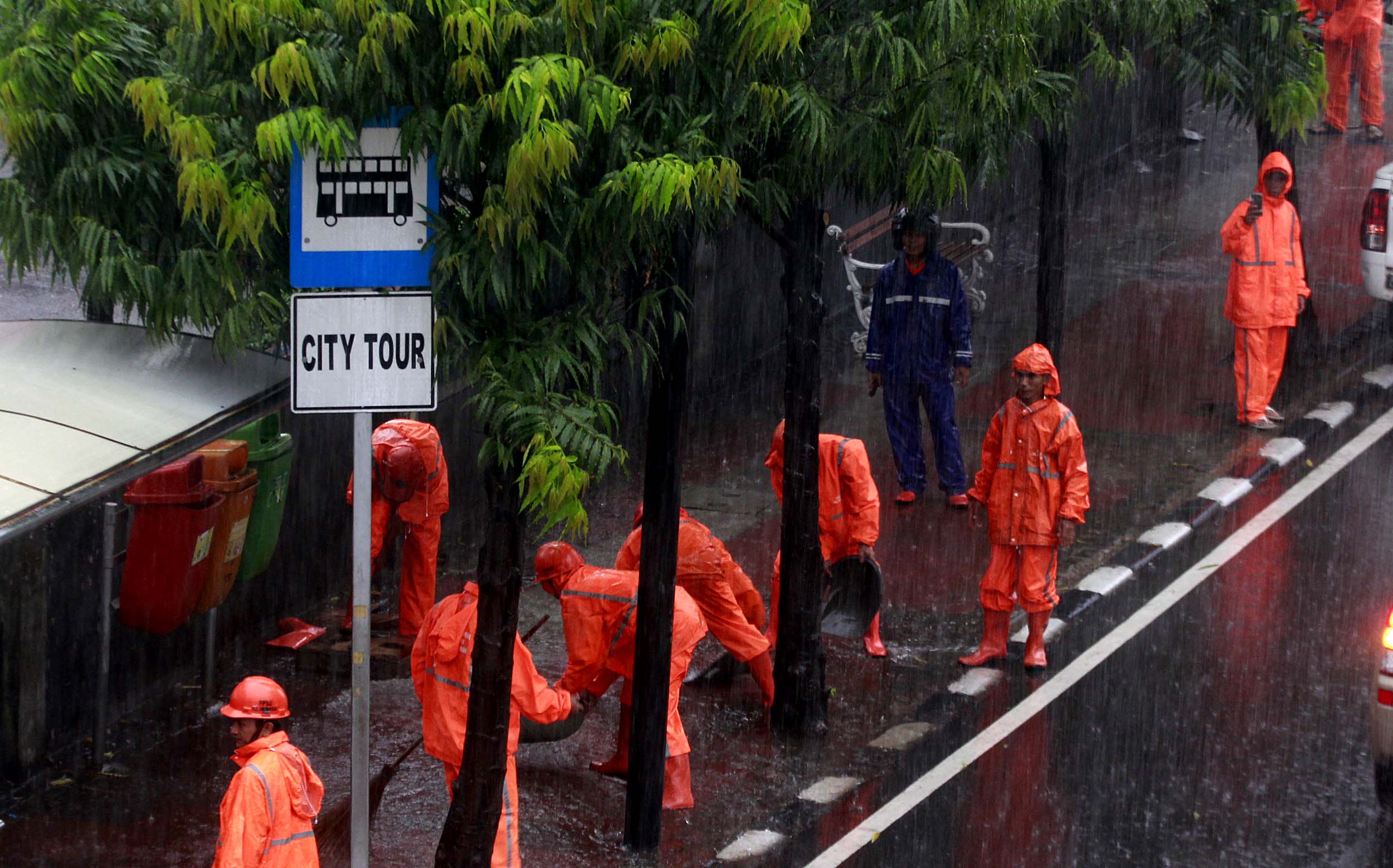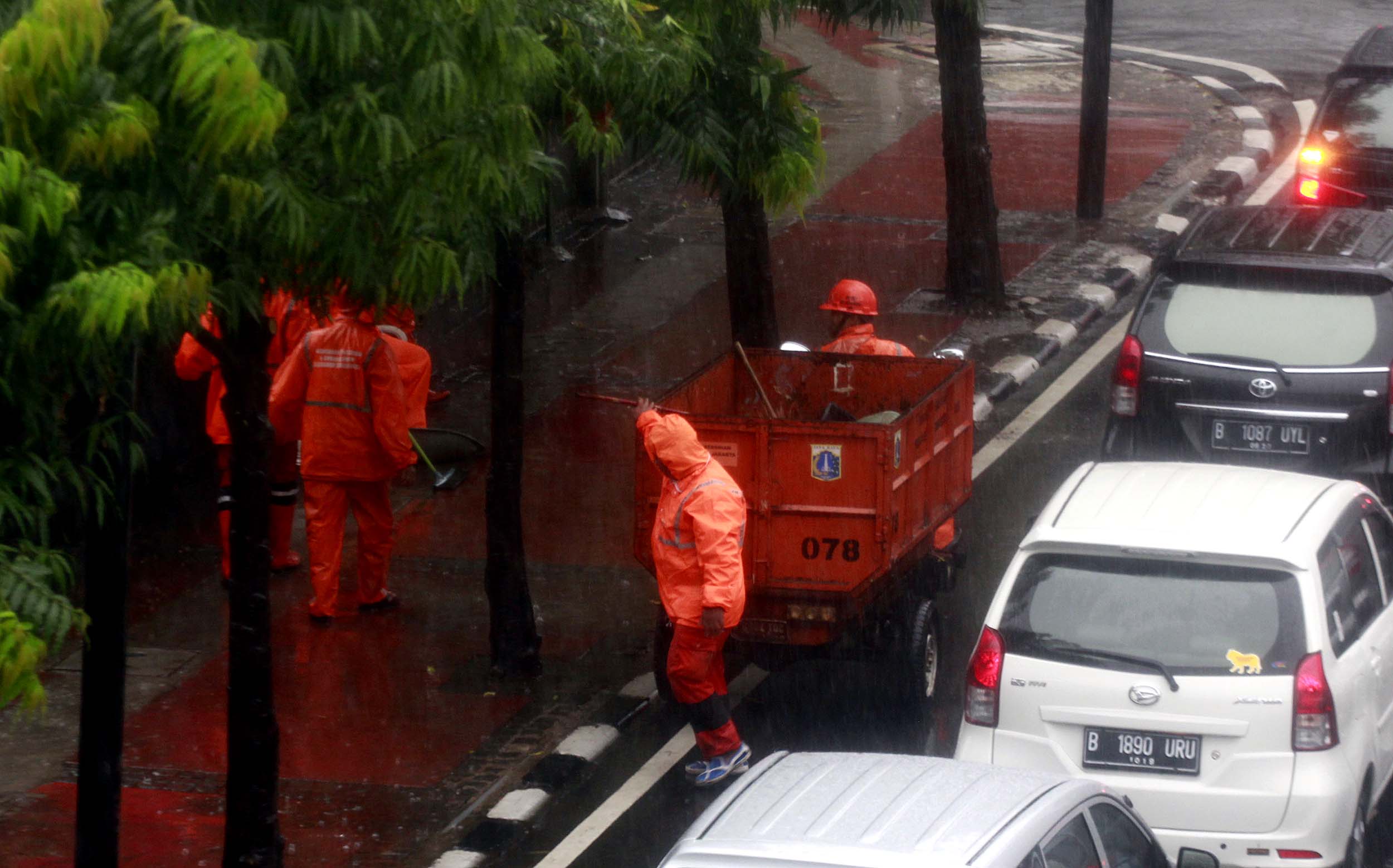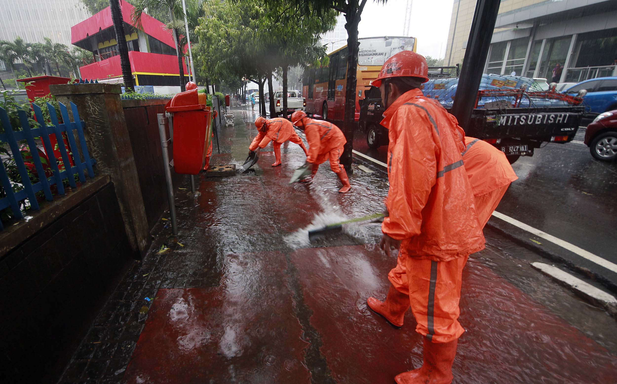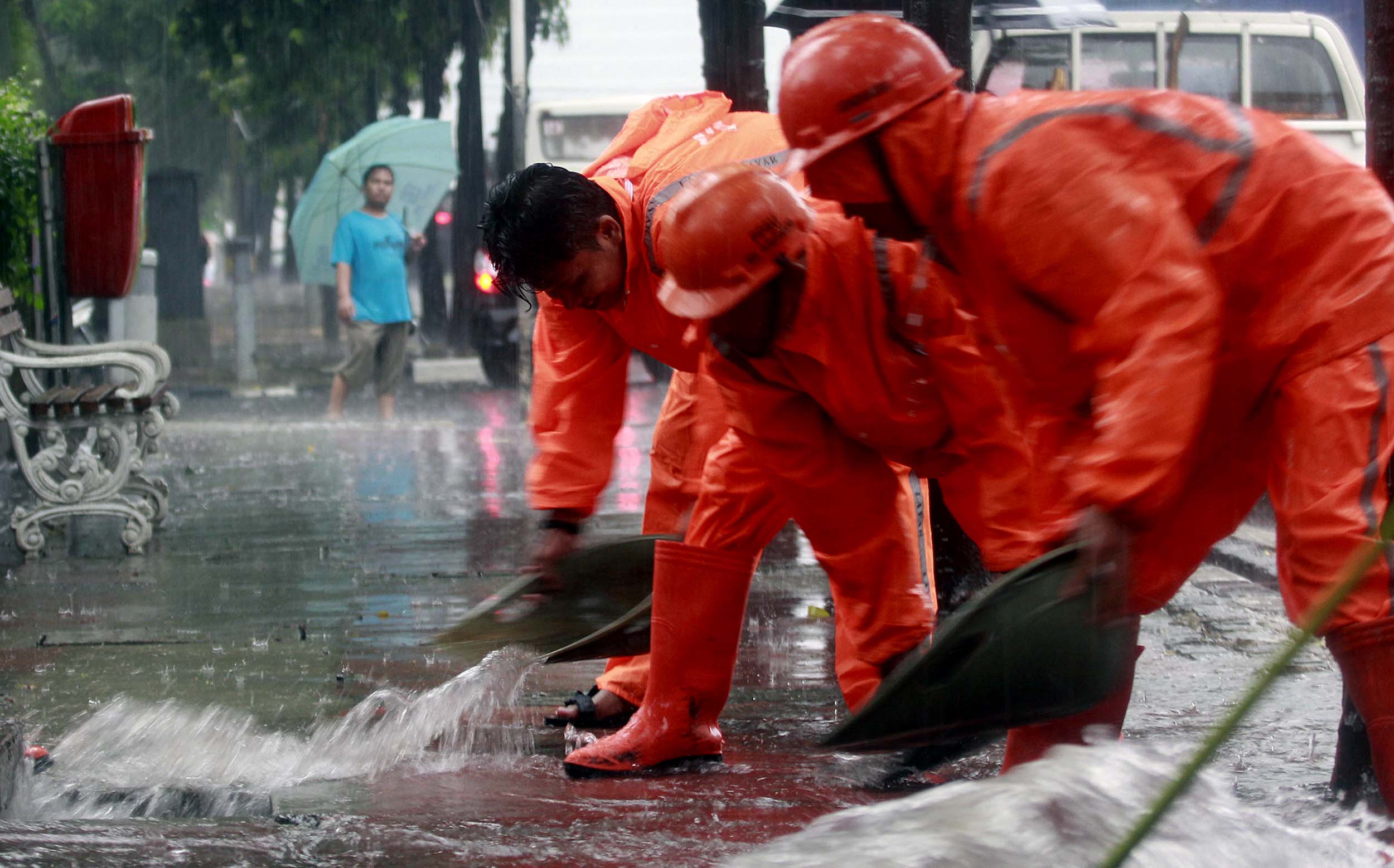 Sejumlah Petugas dari Dinas Kebersihan membuang genangan air kedalam selokan saat hujan deras di kawasan Jl MH Thamrin, Jakarta, Rabu (20/7/2016). Tingginya curah hujan yang mengguyur kawasan Sarinah membuat genangan disisi jalan dan trotoar. Agar tidak terjadi genangan petugas mengatasi aliran air hujan ke dalam selokan