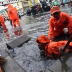 Beberapa orang dari pasukan oranye atau petugas kebersihan memeriksa saluran air yang tersumbat di Jalan Hasyim Ashari, Jakarta Barat, Selasa (1/11). Hujan deras yang menguyur Jakarta mengakibatkan tersumbatnya saluran air dan genangan setinggi paha orang dewasa. Genangan ini membuat arus lalu lintas dari arah Grogol menuju Harmon macet. AKTUAL/Tino Oktaviano
