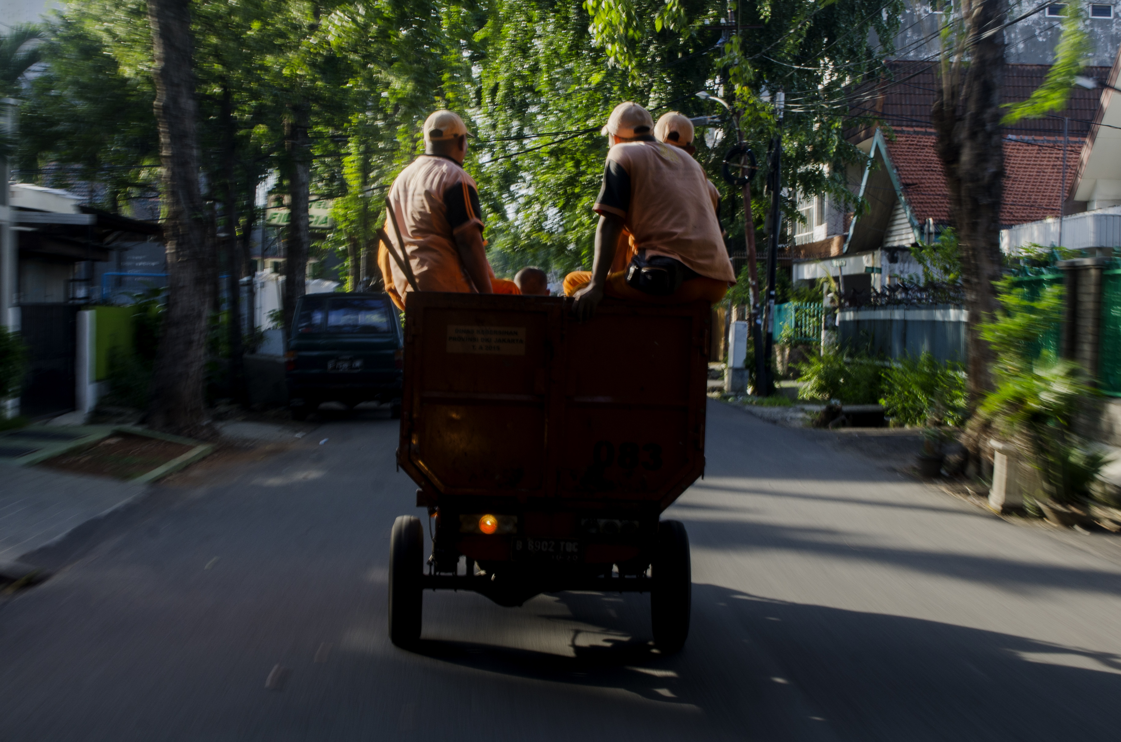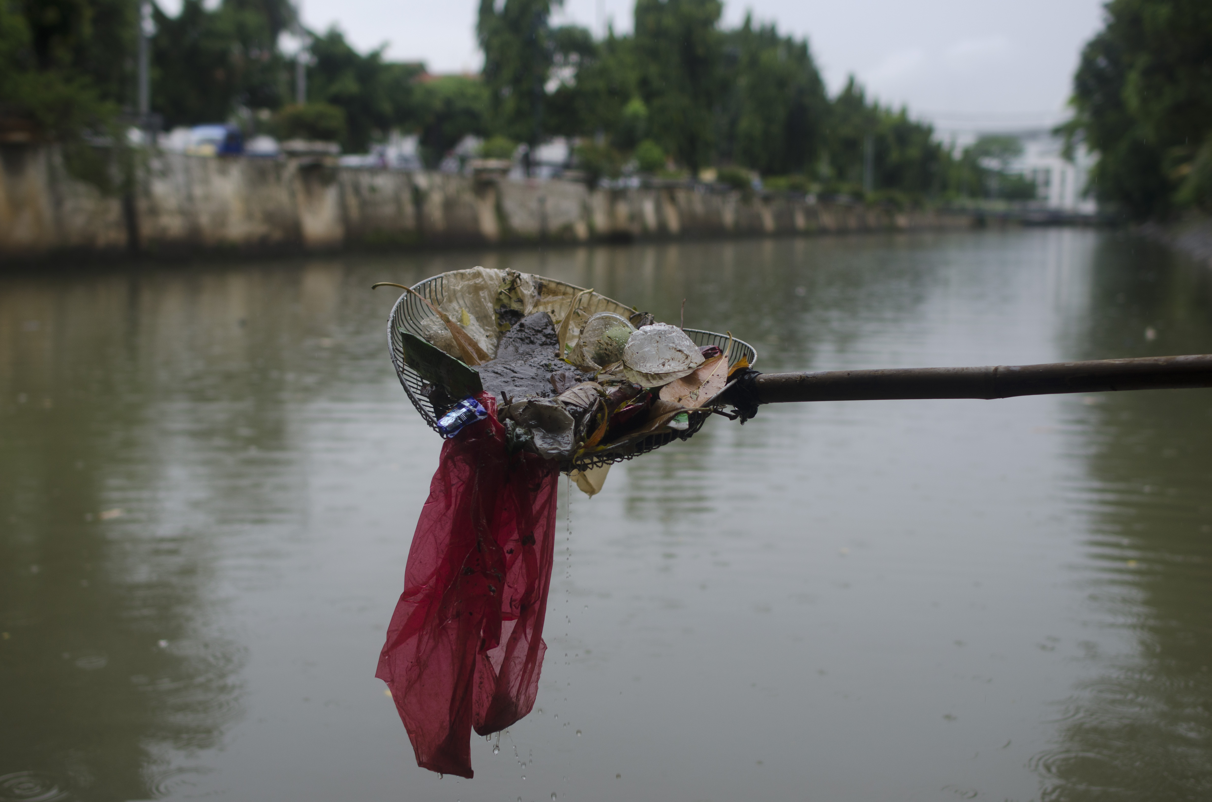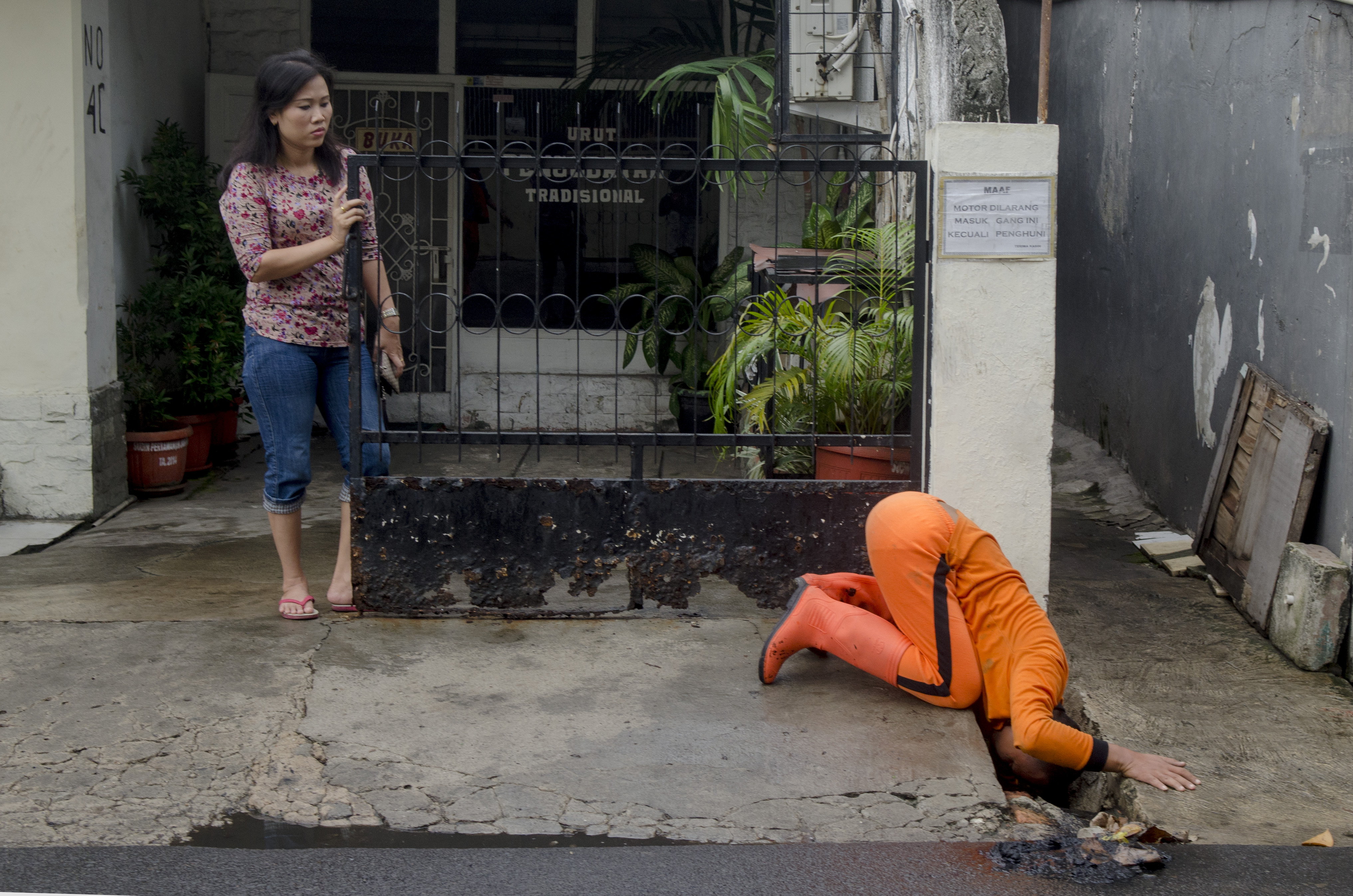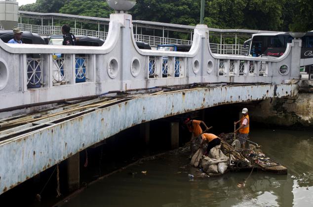 Petugas bersiaga mengatasi masalah kebersihan mulai dari menyusuri sungai dan saluran air yang tersumbat, mengangkat sampah hingga memangkas pohon di Jakarta, Minggu (29/5). ANTARA FOTO/Sahrul Manda Tikupadang/16.