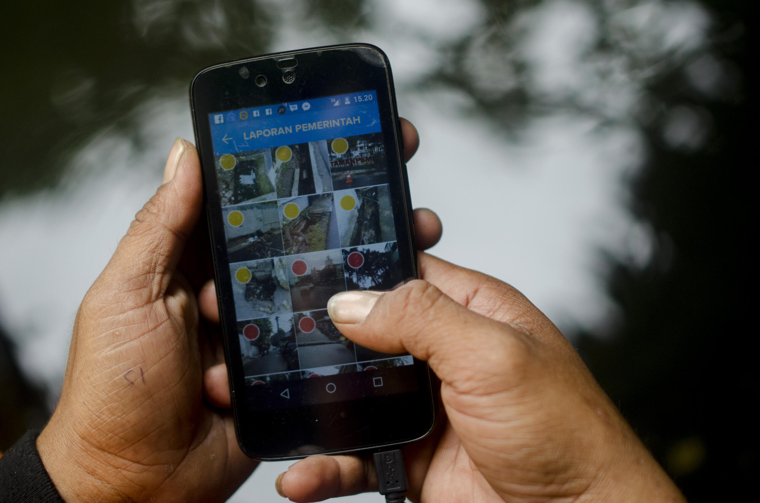 Pasukan oranye memanfaatkan aplikasi ÔQlueÕ dari ÔsmartphoneÕ miliknya untuk memantau laporan warga di Jakarta, Minggu (29/5). ANTARA FOTO/Sahrul Manda Tikupadang/16.