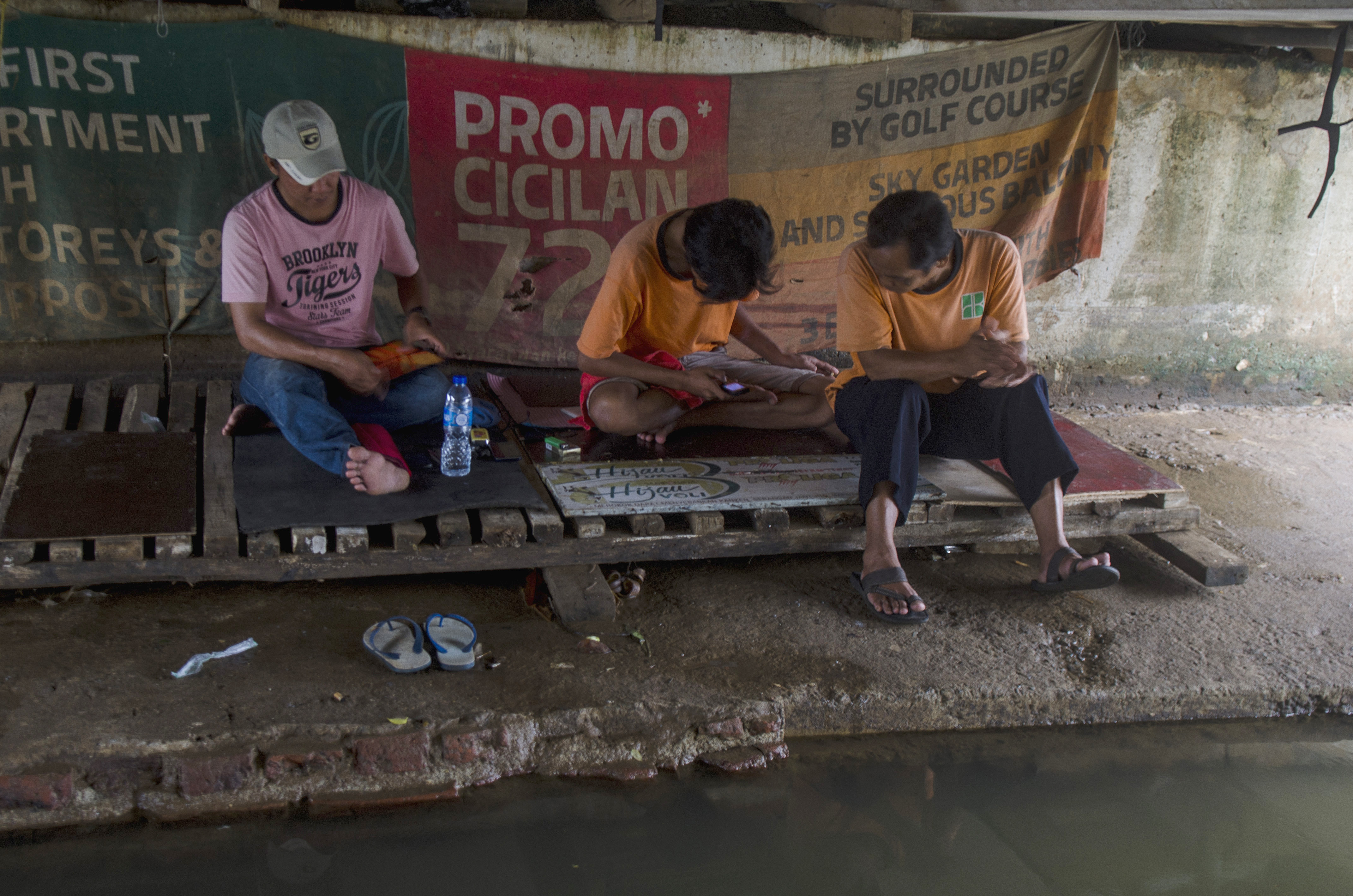 Petugas bersantai sejenak di kolong jembatan sebuah sungai setelah dibersihkan di Jakarta, Minggu (29/5). ANTARA FOTO/Sahrul Manda Tikupadang/16.