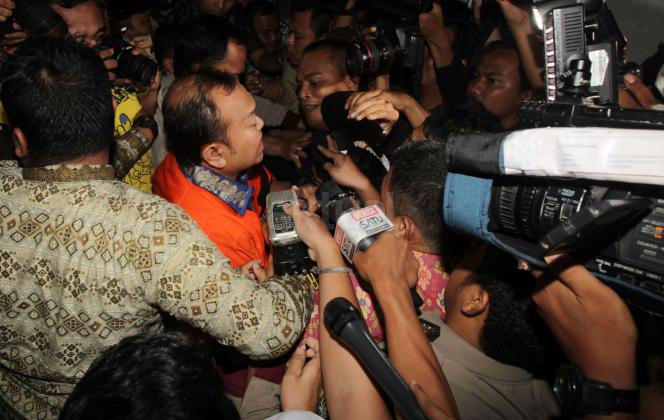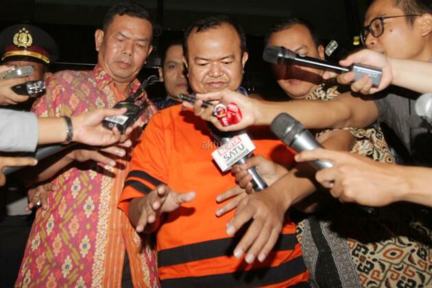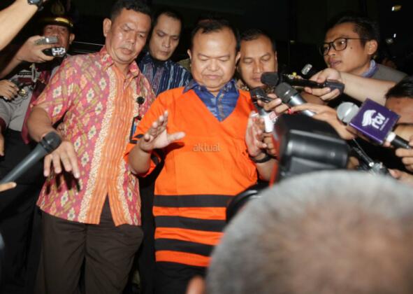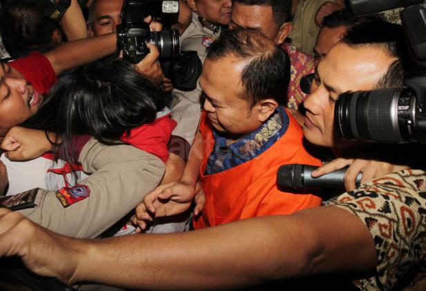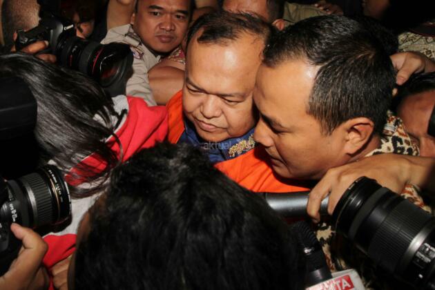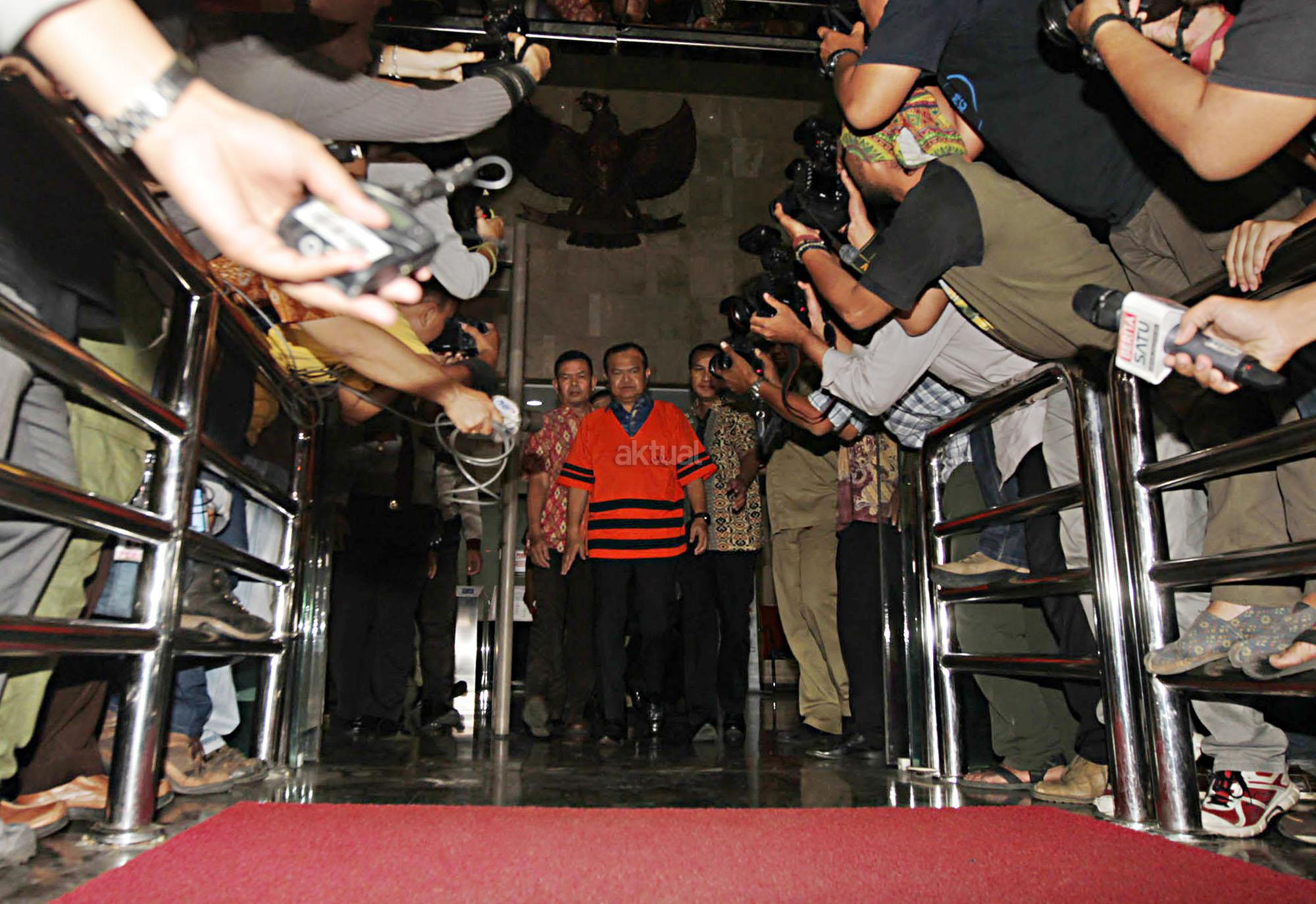 Tersangka kasus dugaan tindak pidana korupsi suap kepada anggota DPR terkait penyelidikan di Kejaksaan Tinggi Sumatera Utara dan Kejaksaan Agung, Patrice Rio Capella (tengah) dengan baju tahanan keluar dari gedung KPK seusai diperiksa di Jakarta, Jumat (23/10). Mantan Sekjen Partai Nasional Demokrat itu resmi ditahan KPK dalam kasus tersebut. AKTUAL/TINO OKTAVIANO