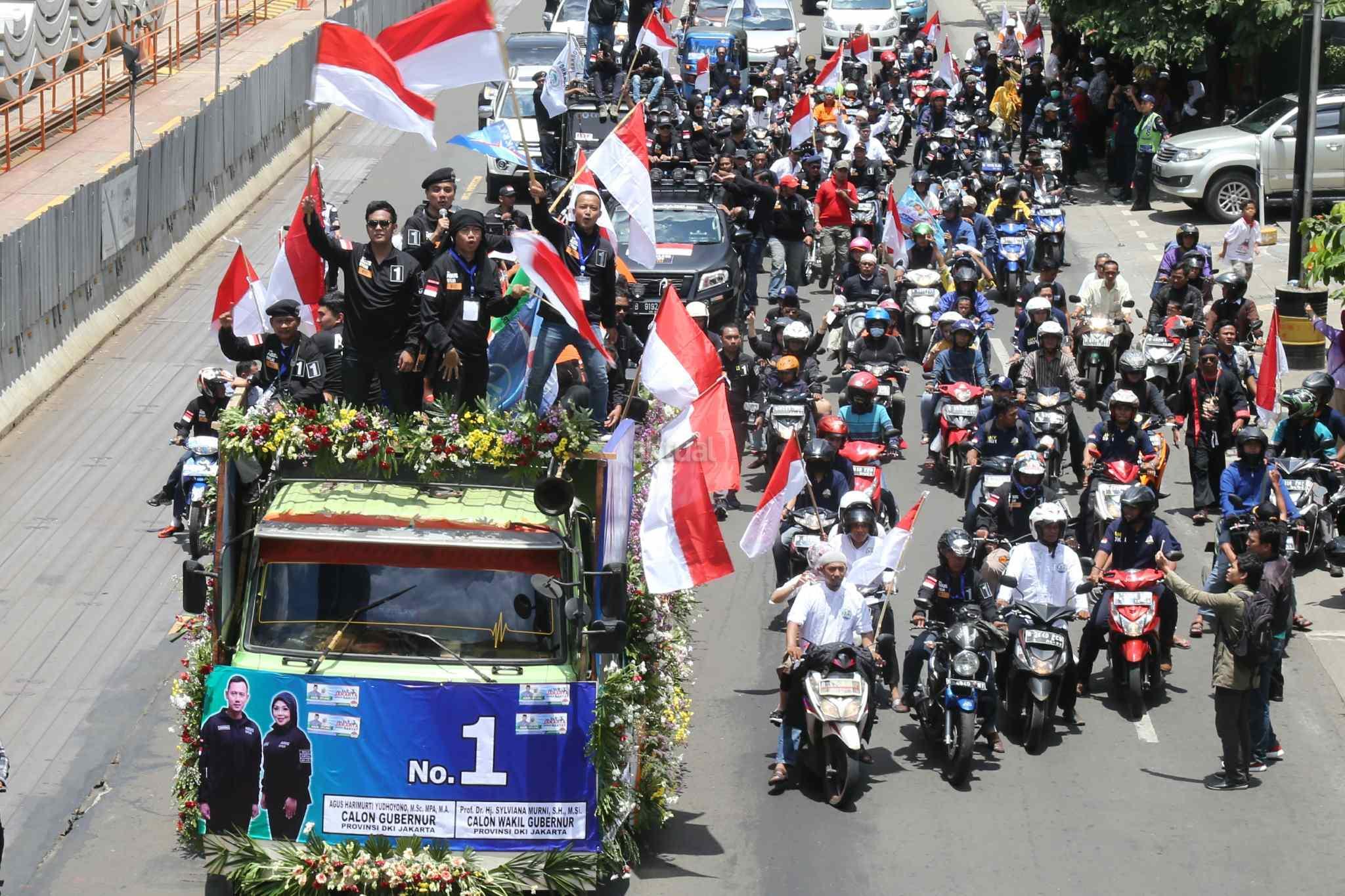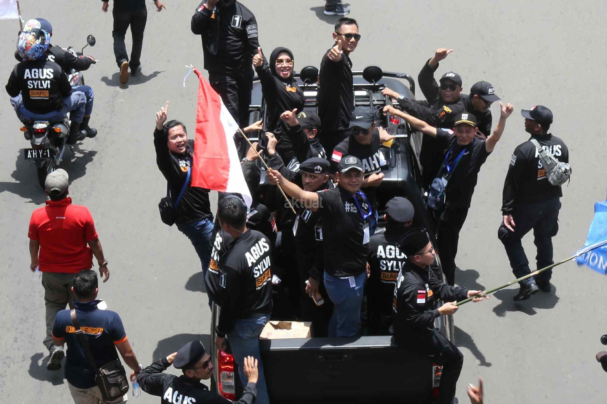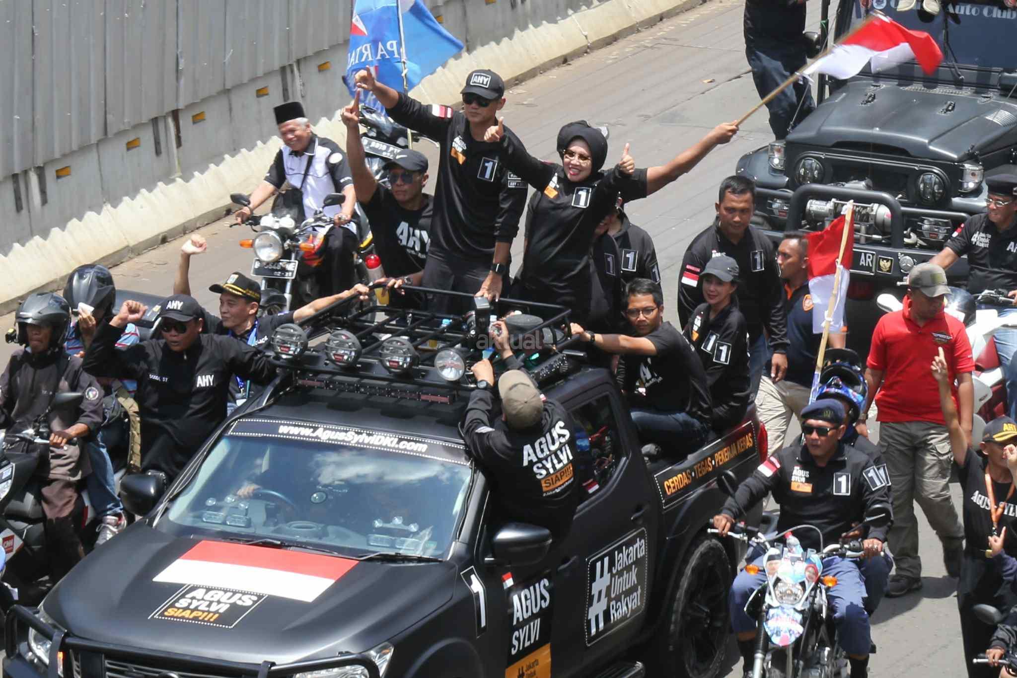 Pasangan Calon Gubernur dan Wakil Gubernur DKI Jakarta, Agus Harimurti Yudhoyono dan Sylviana Murni menyapa pendukungnya saat kampanye damai melakukan pawai kendaraan di Jalan MH Thamin, Jakarta Pusat, Sabtu (29/10). Usai melakukan Deklarasi Kampanye Damai dan Berintegritas, ketiga pasangan calon gubernur dan wakil gubernur (Cagub-Cawagub) melakukan pawai. Pawai dilakukan dengan menggunakan kendaraan hias yang telah disiapkan oleh masing-masing pasangan calon. AKTUAL/Tino Oktaviano