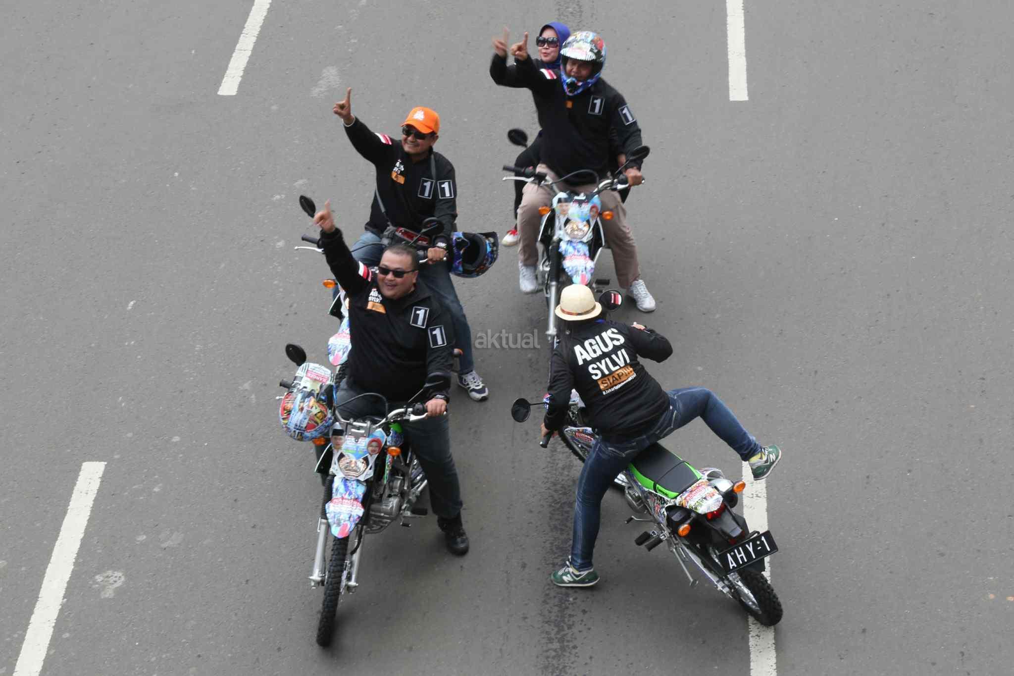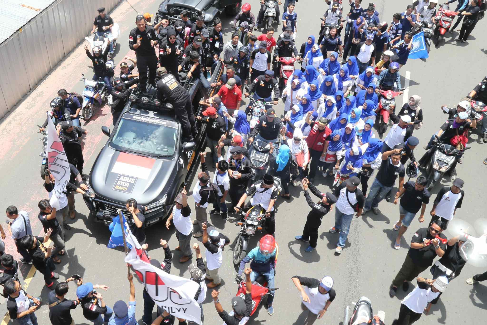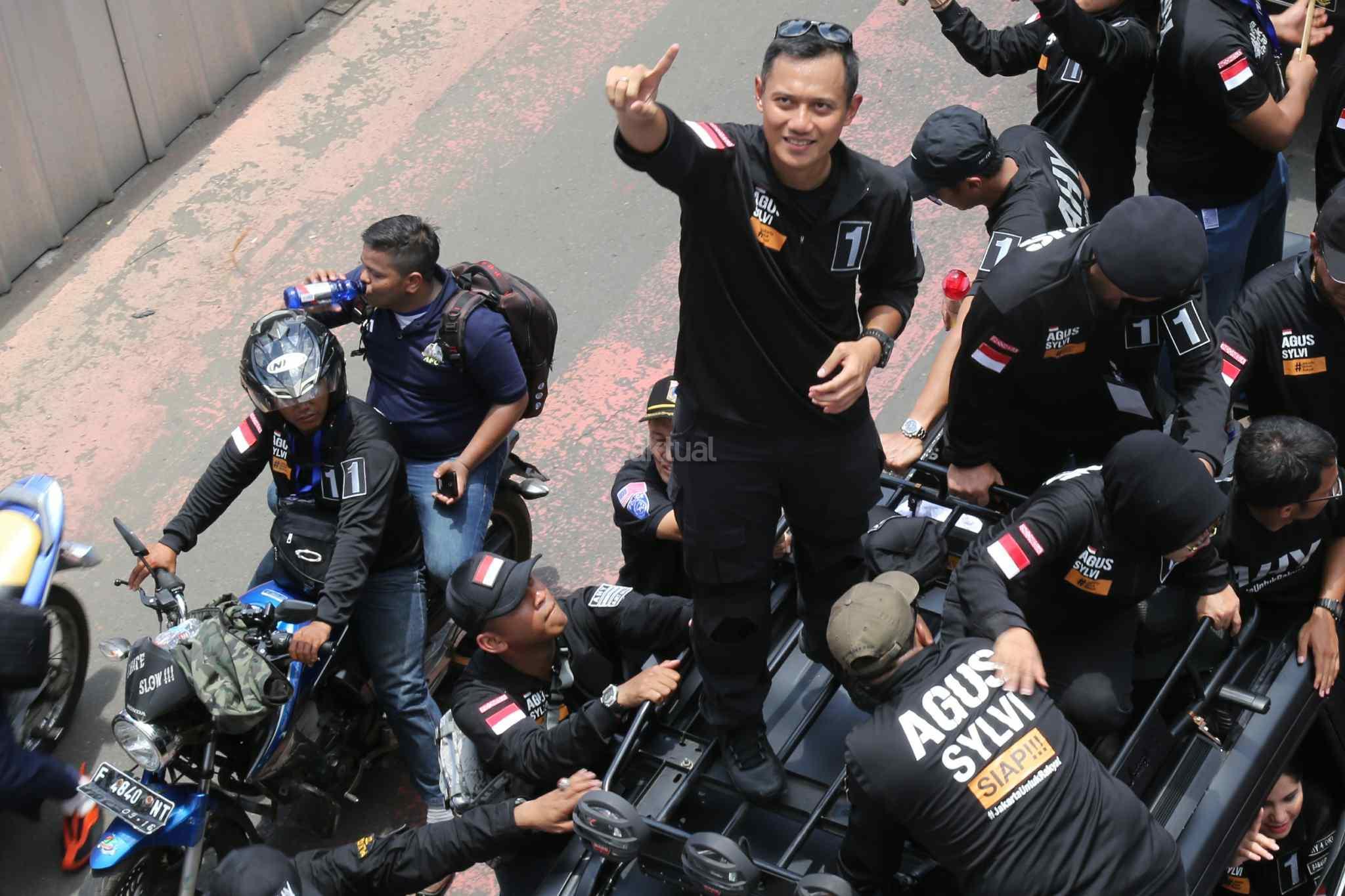 Pasangan Calon Gubernur dan Wakil Gubernur DKI Jakarta, Agus Harimurti Yudhoyono dan Sylviana Murni menyapa pendukungnya saat kampanye damai melakukan pawai kendaraan di Jalan MH Thamin, Jakarta Pusat, Sabtu (29/10). Usai melakukan Deklarasi Kampanye Damai dan Berintegritas, ketiga pasangan calon gubernur dan wakil gubernur (Cagub-Cawagub) melakukan pawai. Pawai dilakukan dengan menggunakan kendaraan hias yang telah disiapkan oleh masing-masing pasangan calon. AKTUAL/Tino Oktaviano