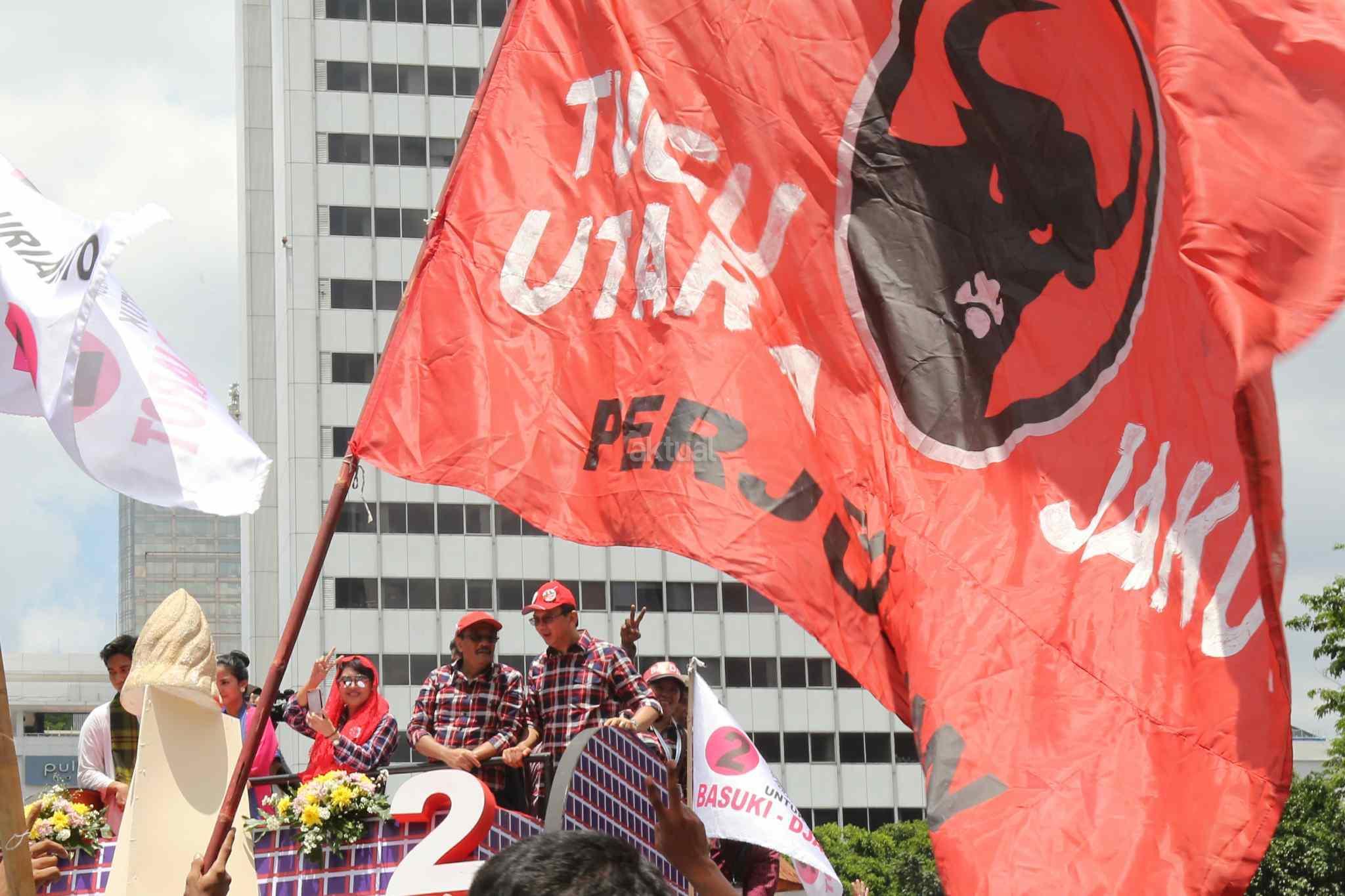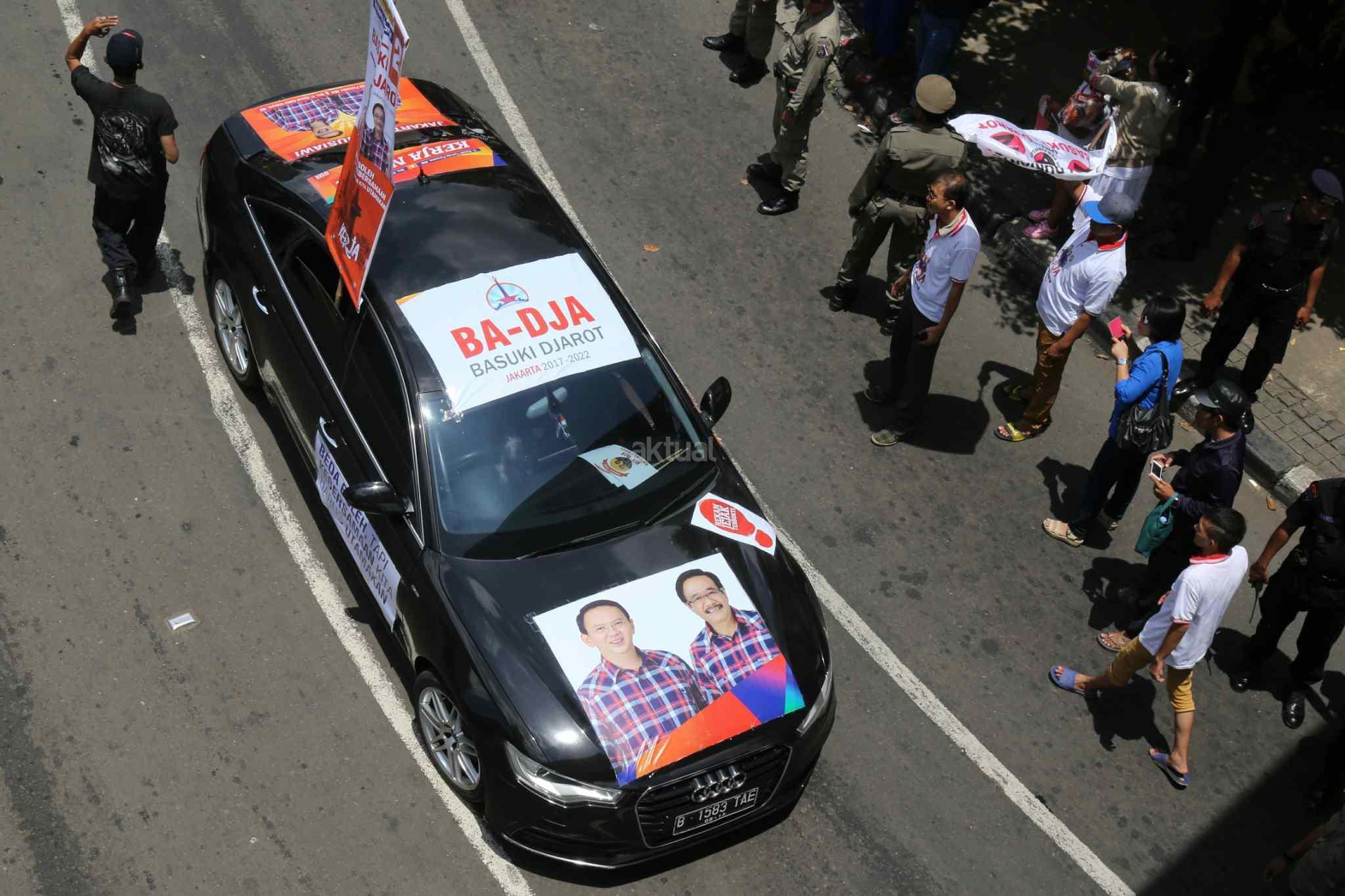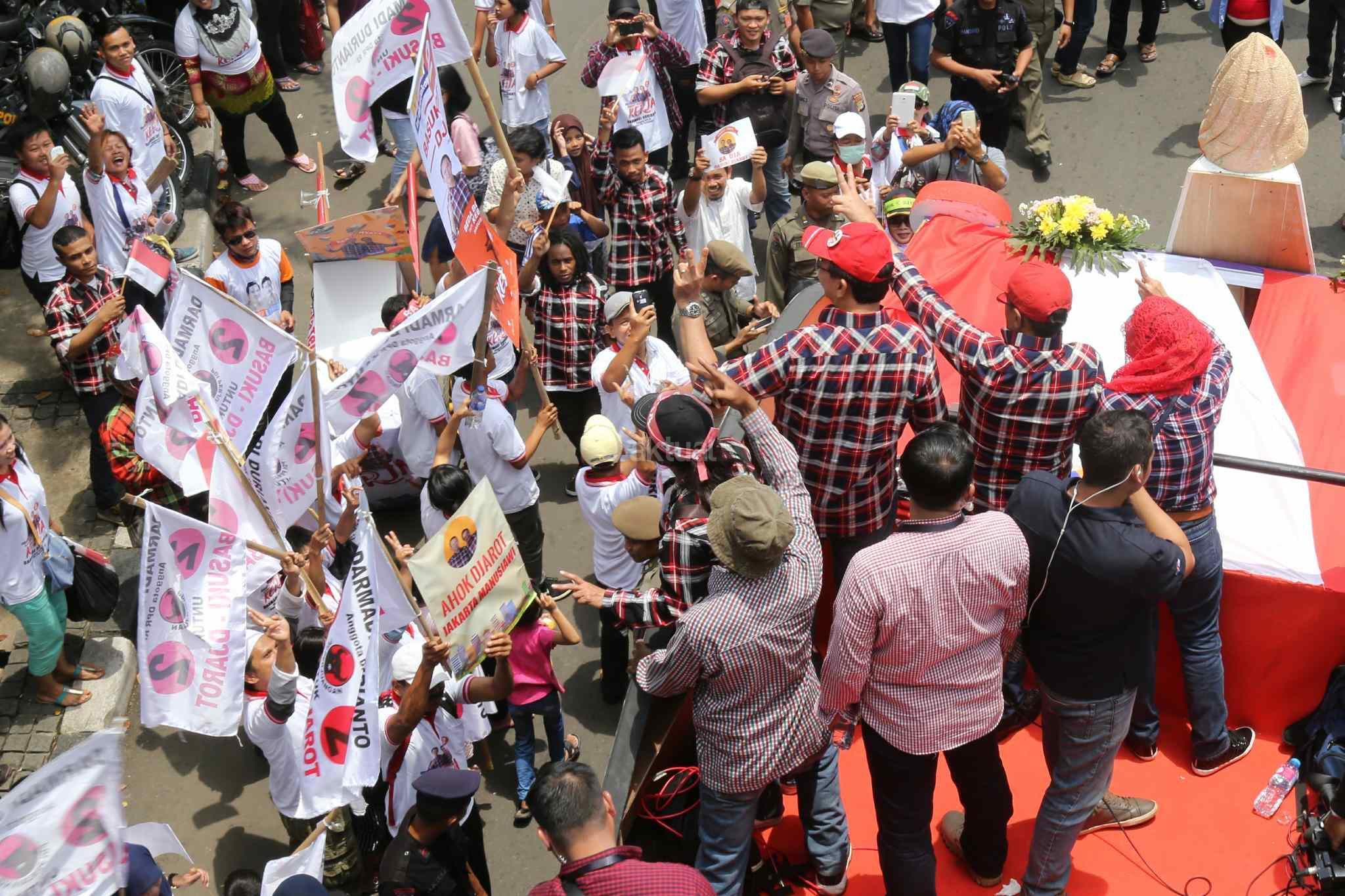 Pasangan Calon Gubernur dan Wakil Gubernur DKI Jakarta, Basuki Tjahja Purnama (Ahok) – Djarot Saiful Hidayat menyapa pendukungnya saat kampanye damai melakukan pawai kendaraan di Jalan MH Thamin, Jakarta Pusat, Sabtu (29/10). Usai melakukan Deklarasi Kampanye Damai dan Berintegritas, ketiga pasangan calon gubernur dan wakil gubernur (Cagub-Cawagub) melakukan pawai. Pawai dilakukan dengan menggunakan kendaraan hias yang telah disiapkan oleh masing-masing pasangan calon. AKTUAL/Tino Oktaviano