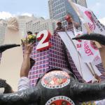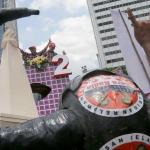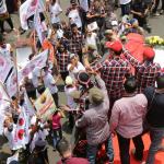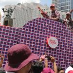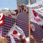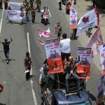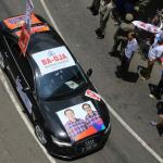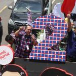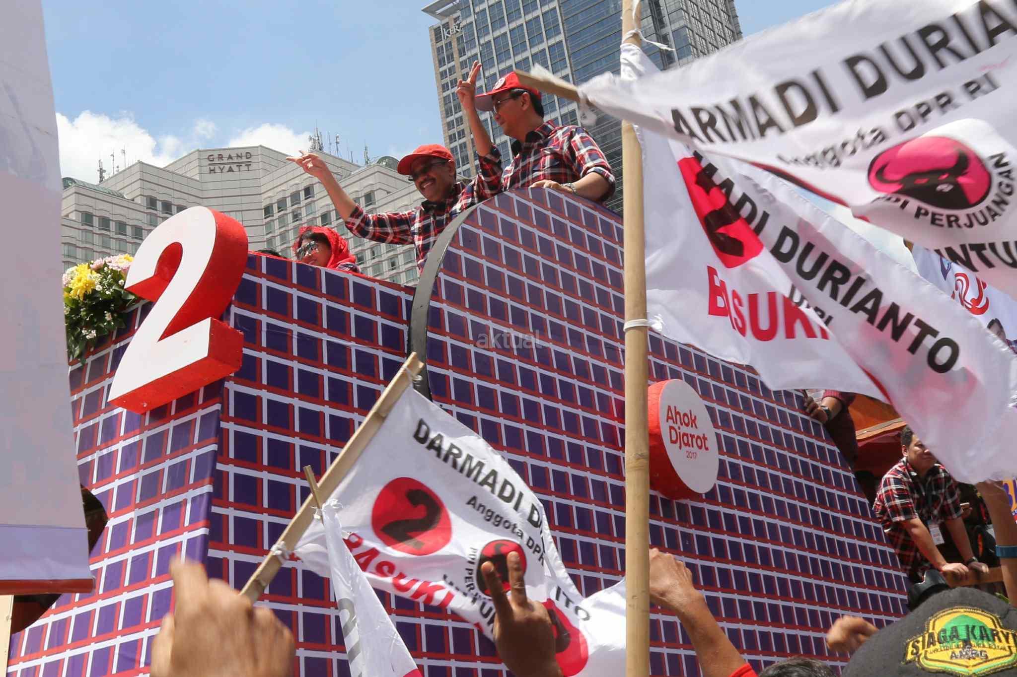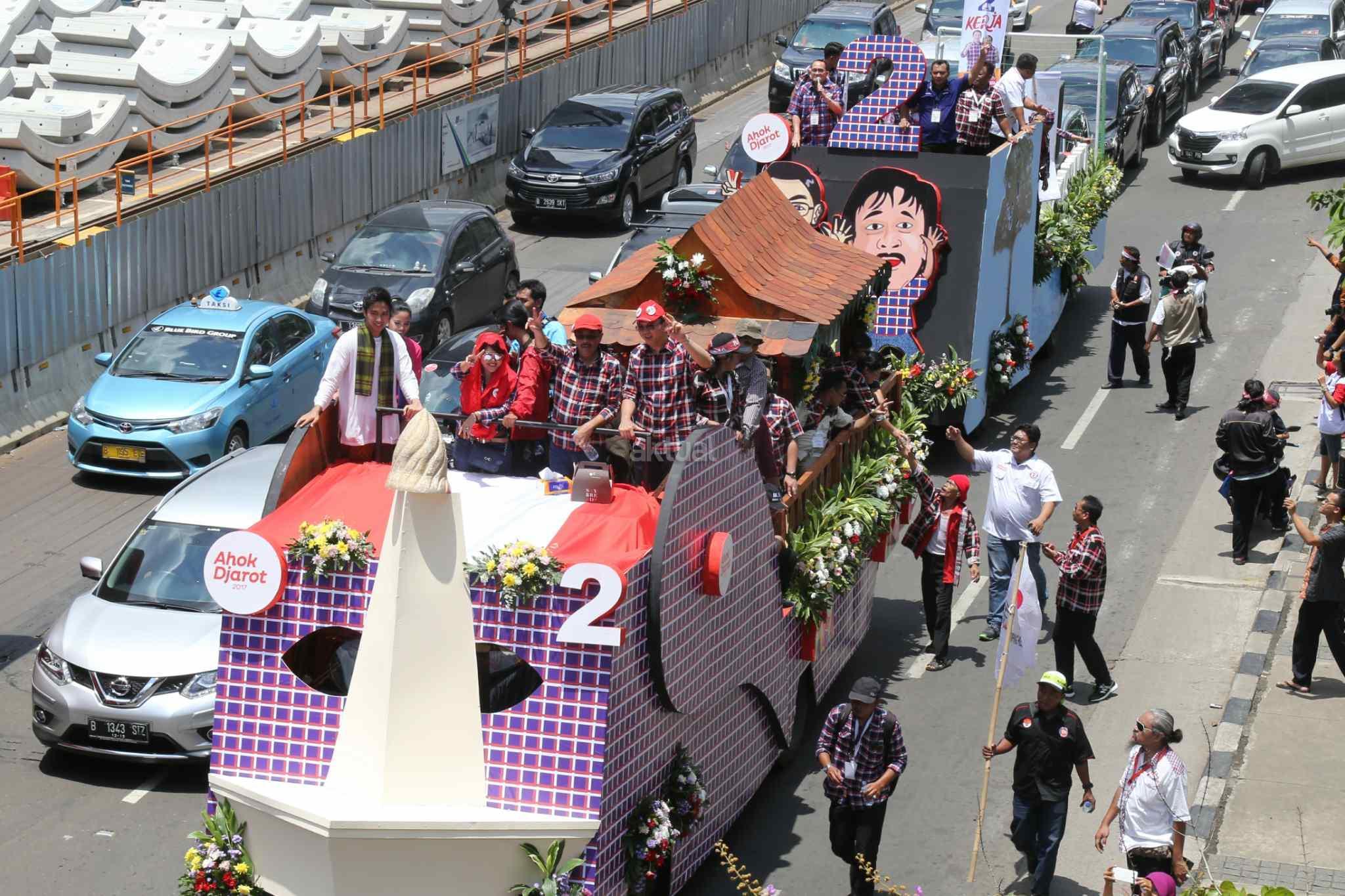 Pasangan Calon Gubernur dan Wakil Gubernur DKI Jakarta, Basuki Tjahja Purnama (Ahok) - Djarot Saiful Hidayat menyapa pendukungnya saat kampanye damai melakukan pawai kendaraan di Jalan MH Thamin, Jakarta Pusat, Sabtu (29/10). Usai melakukan Deklarasi Kampanye Damai dan Berintegritas, ketiga pasangan calon gubernur dan wakil gubernur (Cagub-Cawagub) melakukan pawai. Pawai dilakukan dengan menggunakan kendaraan hias yang telah disiapkan oleh masing-masing pasangan calon. AKTUAL/Tino Oktaviano