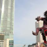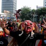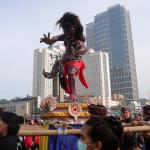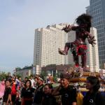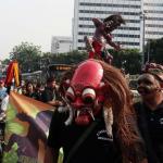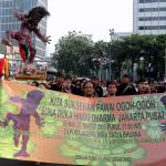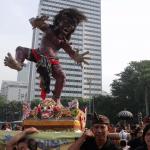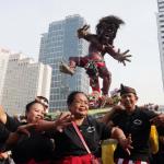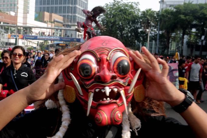 Sejumlah orang mengarak ogoh-ogoh saat Car Free Day di Bundaran HI, Jakarta, Minggu (19/3/2017). Kegiatan tersebut untuk menyosialisasikan pawai ogoh-ogoh di Pura Agung Wira Satya Bhuana, Jakarta, pada Senin (27/3/2017). AKTUAL/Munzir