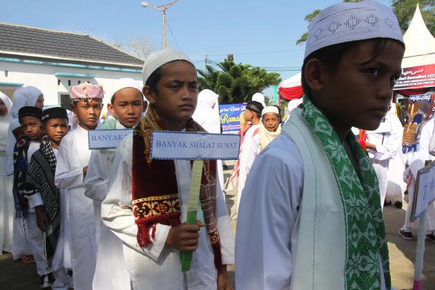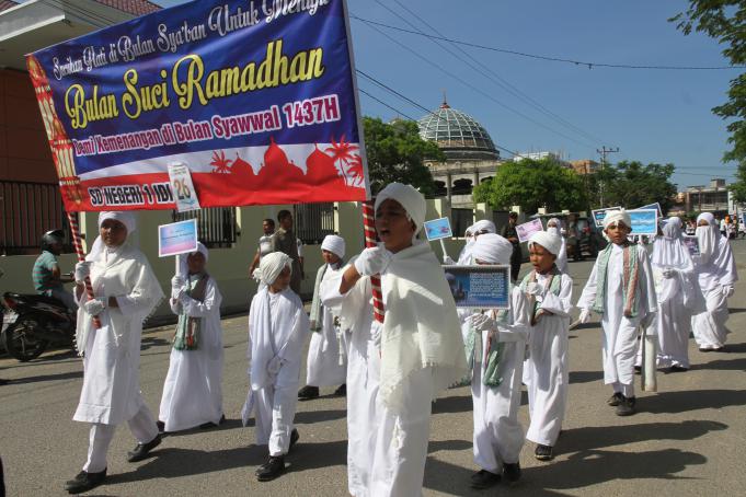 Sejumlah pelajar mengikuti pawai taaruf sambut bulan suci Ramadan di Kota Idi Rayeuk, Kabupaten Aceh Timur, Aceh, Rabu (1/6). Pelajar dari tingkat SD, SMP dan SMA sederajat mengikuti pawai taaruf menyambut datangnya bulan suci Ramadan 1437 H. ANTARA FOTO/Syifa Yulinnas/nz/16.