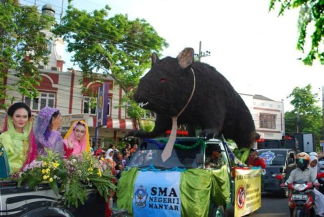Jakarta, Aktual.co — Seekor “tikus raksasa” dengan tinggi sekitar 3,5 meter yang mengenakan jubah dari lembaran “uang” pecahan Rp100.000 yang juga berukuran besar diarak menuju Stadion Kridosono Yogyakarta dalam pawai “Gropyokan”, Selasa (09/12).