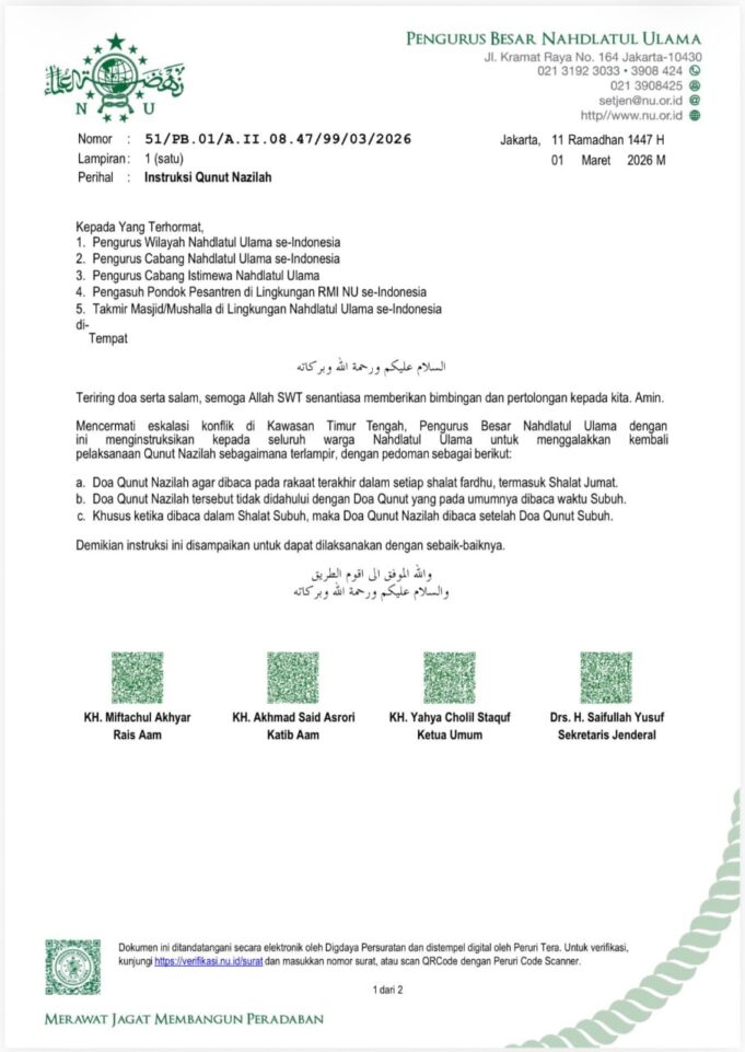 Jakarta, aktual.com – Pengurus Besar Nahdlatul Ulama (PBNU) menerbitkan instruksi resmi terkait pelaksanaan Qunut Nazilah bagi seluruh struktur dan warga Nahdlatul Ulama di Indonesia. Kebijakan tersebut tertuang dalam Surat Nomor: 51/PB.01/A.II.08.47/99/03/2026 tertanggal 11 Ramadhan 1447 H atau 1 Maret 2026 M.