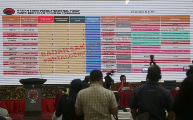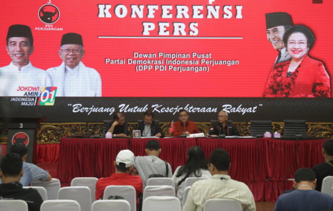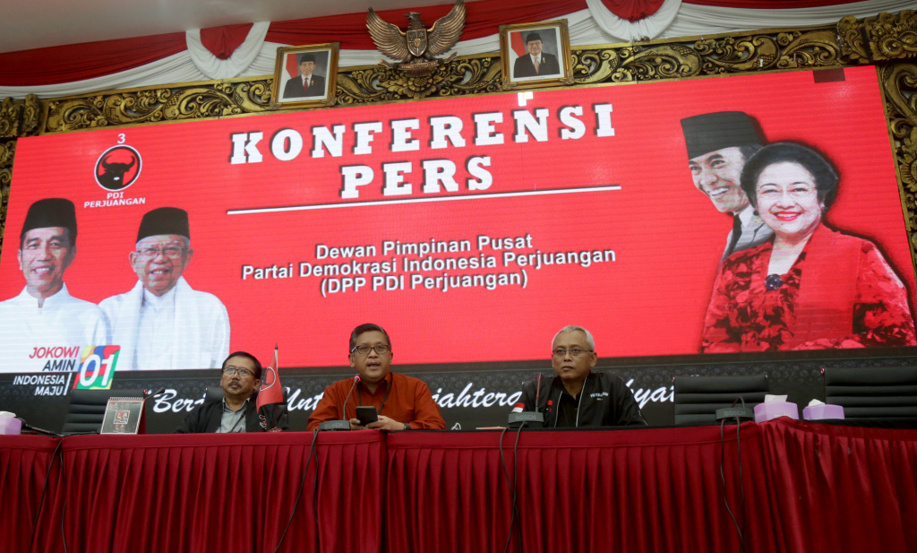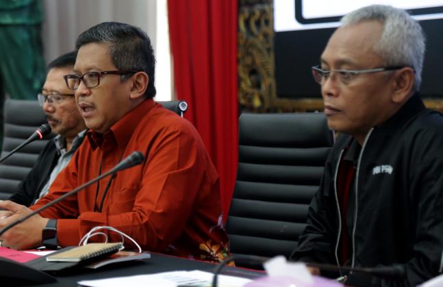Dalam keterangannya, PDI Perjuangan menunggu hasil real count KPU dan mengapresi kerja KPU, Bawaslu dan berduka cita atas petugas KPPS yang meninggal dunia. AKTUAL/Tino Oktaviano