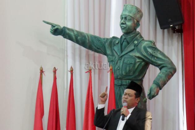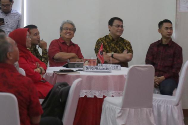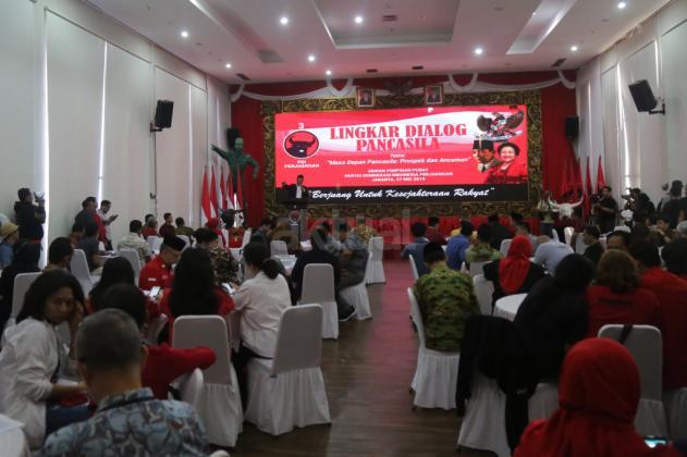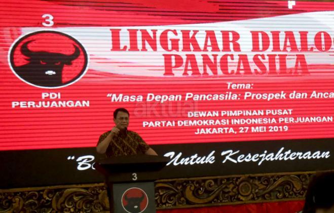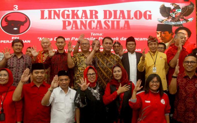 Wakil Sekjen PDI Perjuangan Ahmad Basarah dan Ketua PBNU Marsudi Syuhud bersama para undangan foto bersama usai acara Lingkar Dialog Pancasila di DPP PDI Perjuangan, Jakarta, Senin (27/5/2019). Dialog yang mengusung tema 'Masa Depan Pancasila: Prospek dan Ancaman' itu dalam rangka memperingati Hari Lahir Pancasila ini dihadiri oleh sejumlah tokoh agama dan aktivis mahasiswa. AKTUAL/Tino Oktaviano