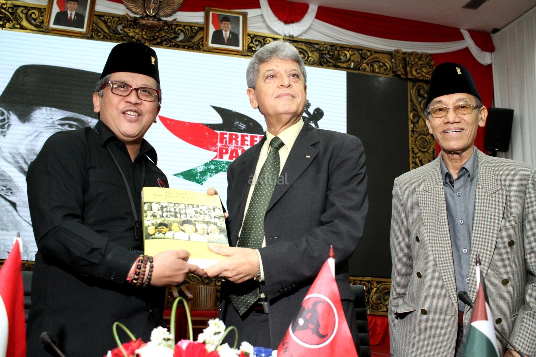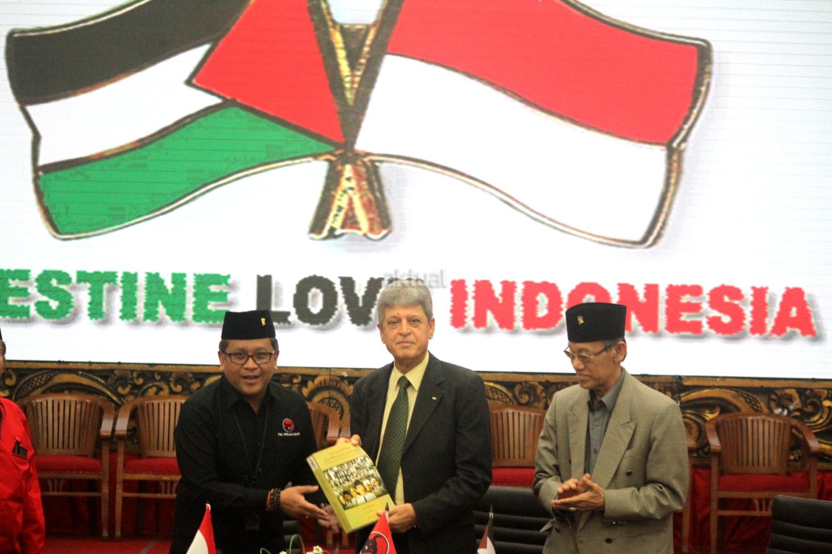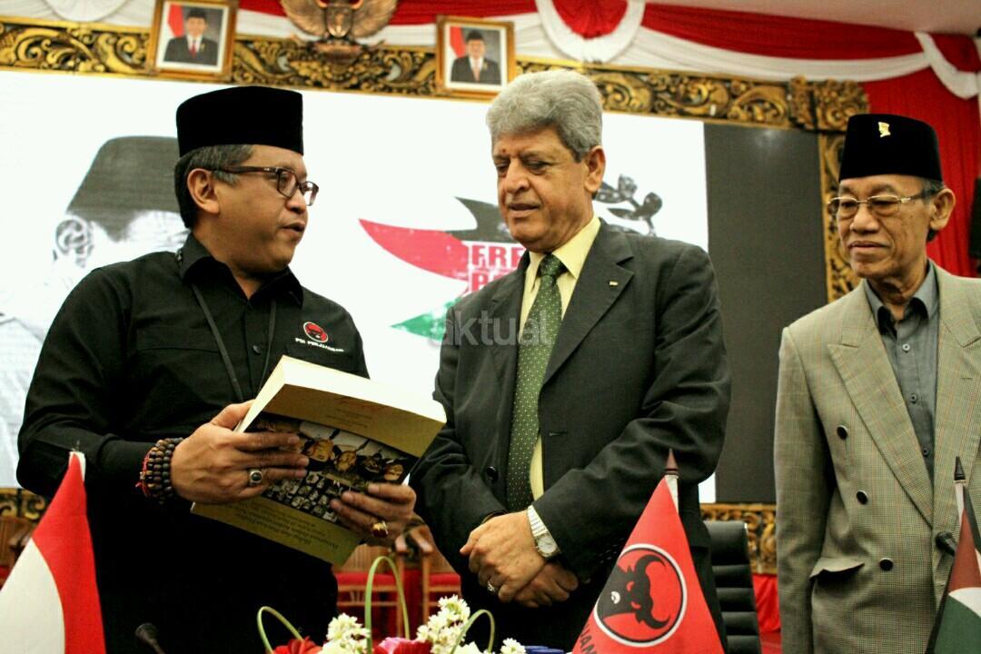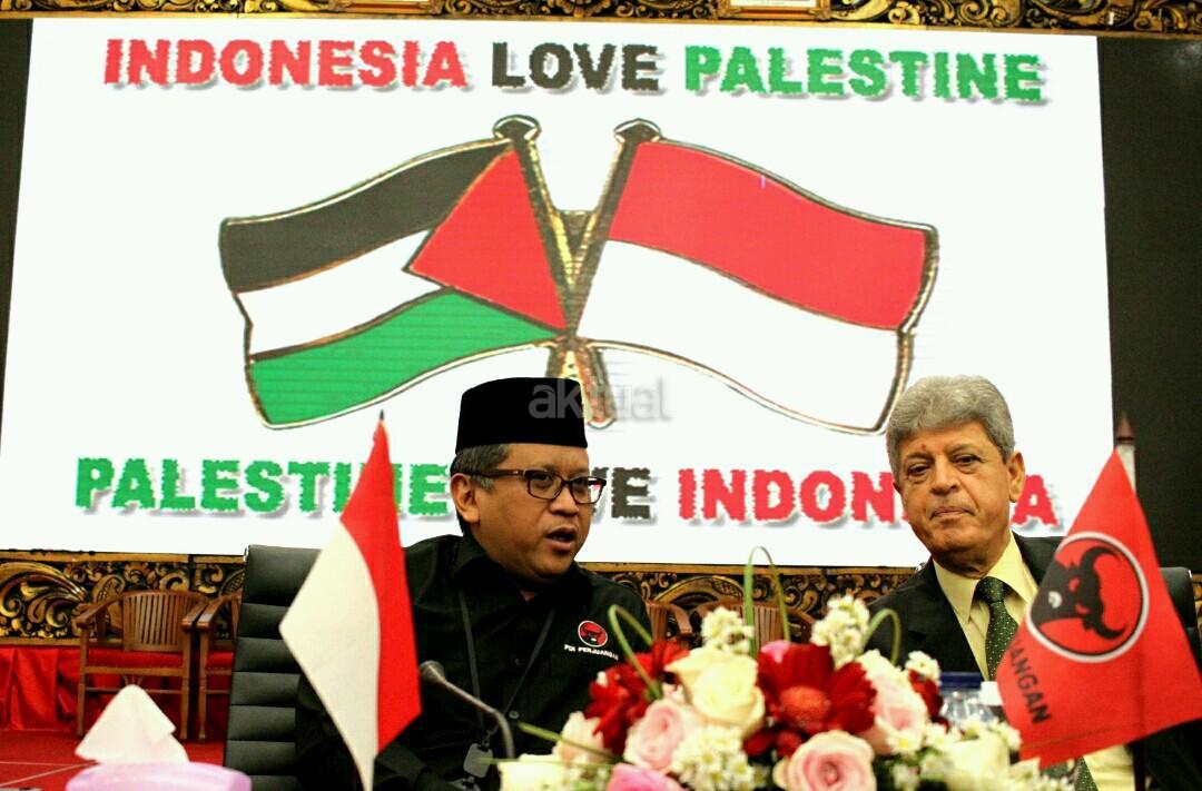 Sekjen PDI Perjuangan Hasto Kristiyanto bersama sejumlah pengurus menerima kunjungan Duta Besar Palestina untuk Indonesia Zubair Muhammad Al Shun di Jakarta, Rabu (18/4/2018). Pertemuan tersebut sebagai ajang silaturrahmi yang biasa dilakukan PDI Perjuangan bersama duta besar negara sahabat yang ada di Indonesia. Dalam pertemuan tersebut PDI Perjuangan mendukung kemerdekaan Palestina dan mengutuk segala kekerasan yang terjadi di Palestina oleh Zionis Israel. AKTUAL/Tino Oktaviano