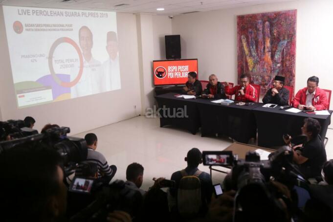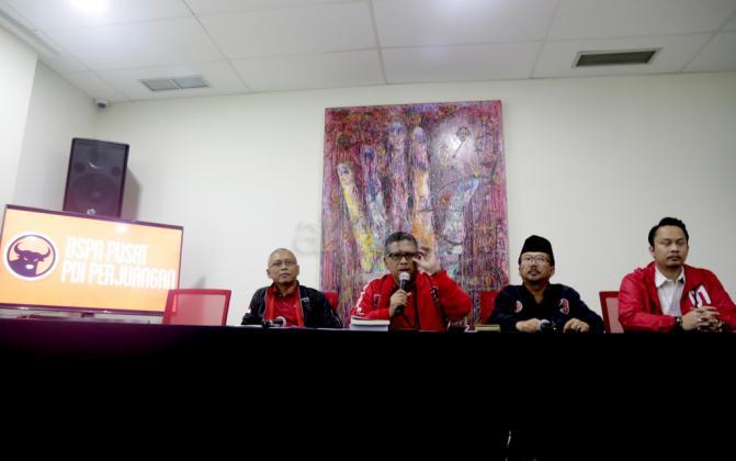 Sekjen Partai Demokrasi Indonesia Perjuangan (PDIP) Hasto Kristiyanto (kedua kiri) didampingi Kepala BSPN PDIP Arif Wibowo (kiri), Ketua Bidang Badan Pemenangan Pemilu (Bappilu) DPP PDIP Bambang DH (kedua kanan), saat mengumumkan hasil pemilihan presiden 2019 dan legislatif di kantor DPP PDIP, Jalan Dipenogoro, Jakarta Pusat, Senin (22/4/2019). AKTUAL/Tino Oktaviano