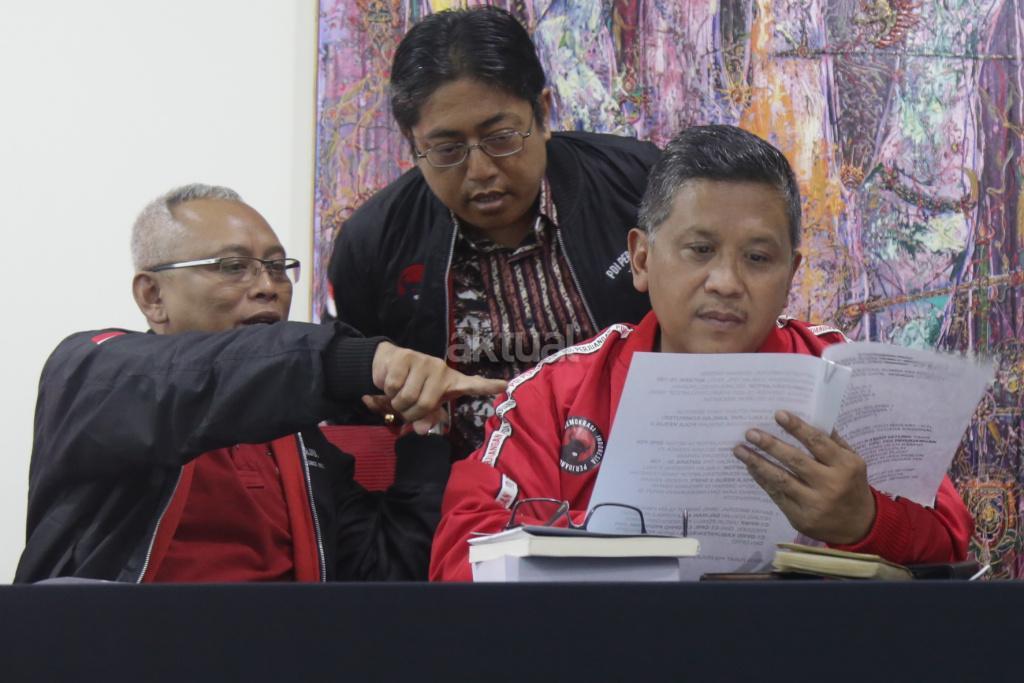 Sekjen Partai Demokrasi Indonesia Perjuangan (PDIP) Hasto Kristiyanto (kanan) didampingi Kepala BSPN PDIP Arif Wibowo (kiri), saat mengumumkan hasil pemilihan presiden 2019 dan legislatif di kantor DPP PDIP, Jalan Dipenogoro, Jakarta Pusat, Senin (22/4/2019). AKTUAL/Tino Oktaviano
