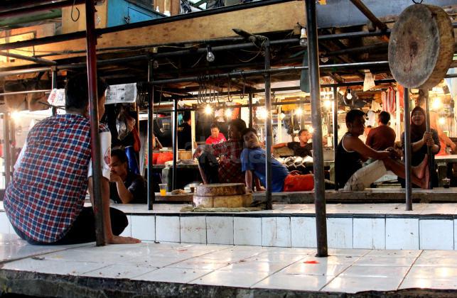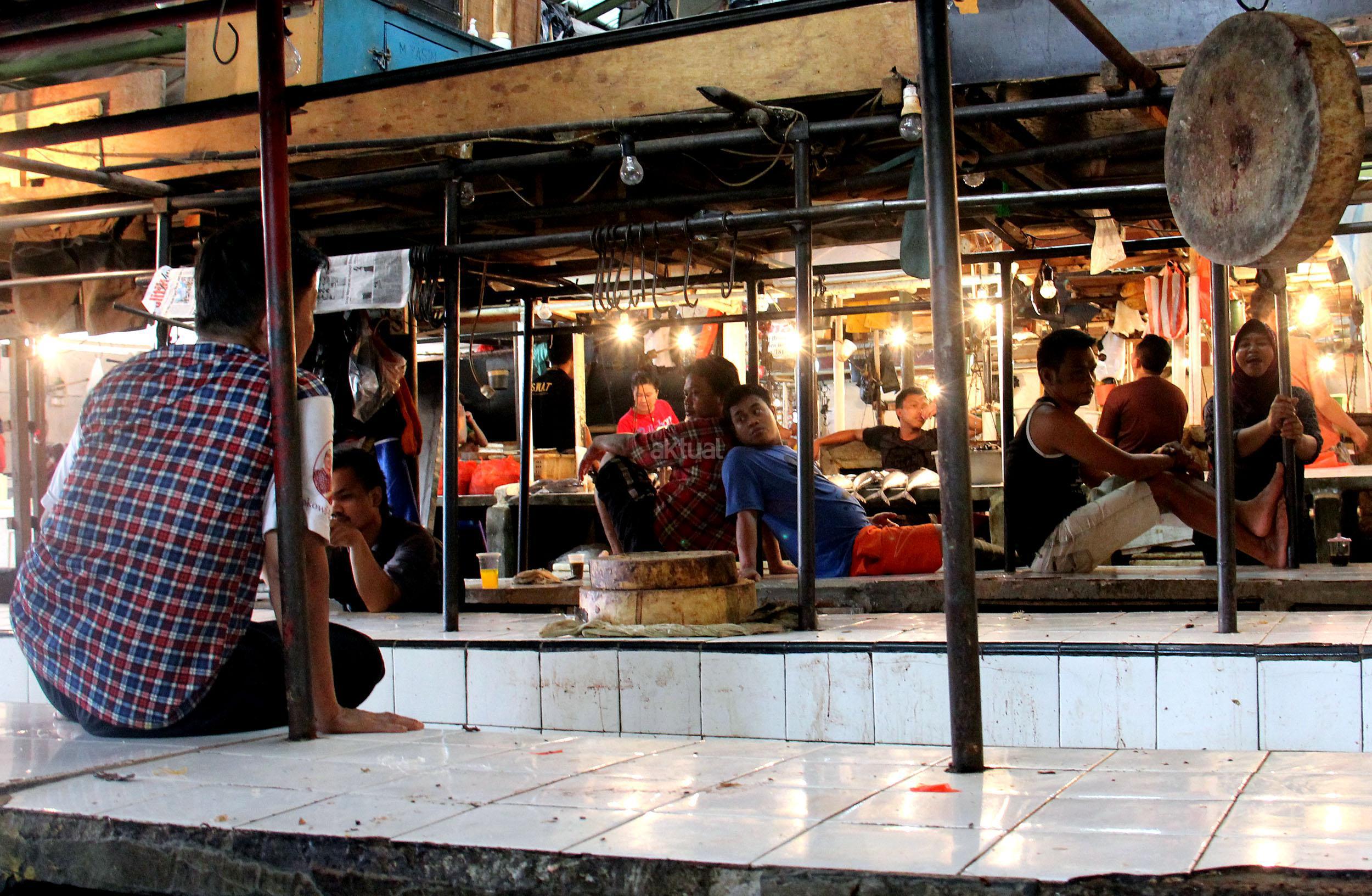 Terlihat para pedagang hanya duduk-duduk di kiosnya tidak melakukan aktivitas berjualan di Pasar Senen, Jakarta Pusat, Minggu (9/8/2015). Aksi mogok yang dilakukan ratusan pedagang daging sapi ini akan berlangsung hingga Rabu, 12 Agustus nanti. Mereka kecewa karena harga daging terus naik tak terkendali. Di samping itu, kuota impor sapi juga dibatasi.