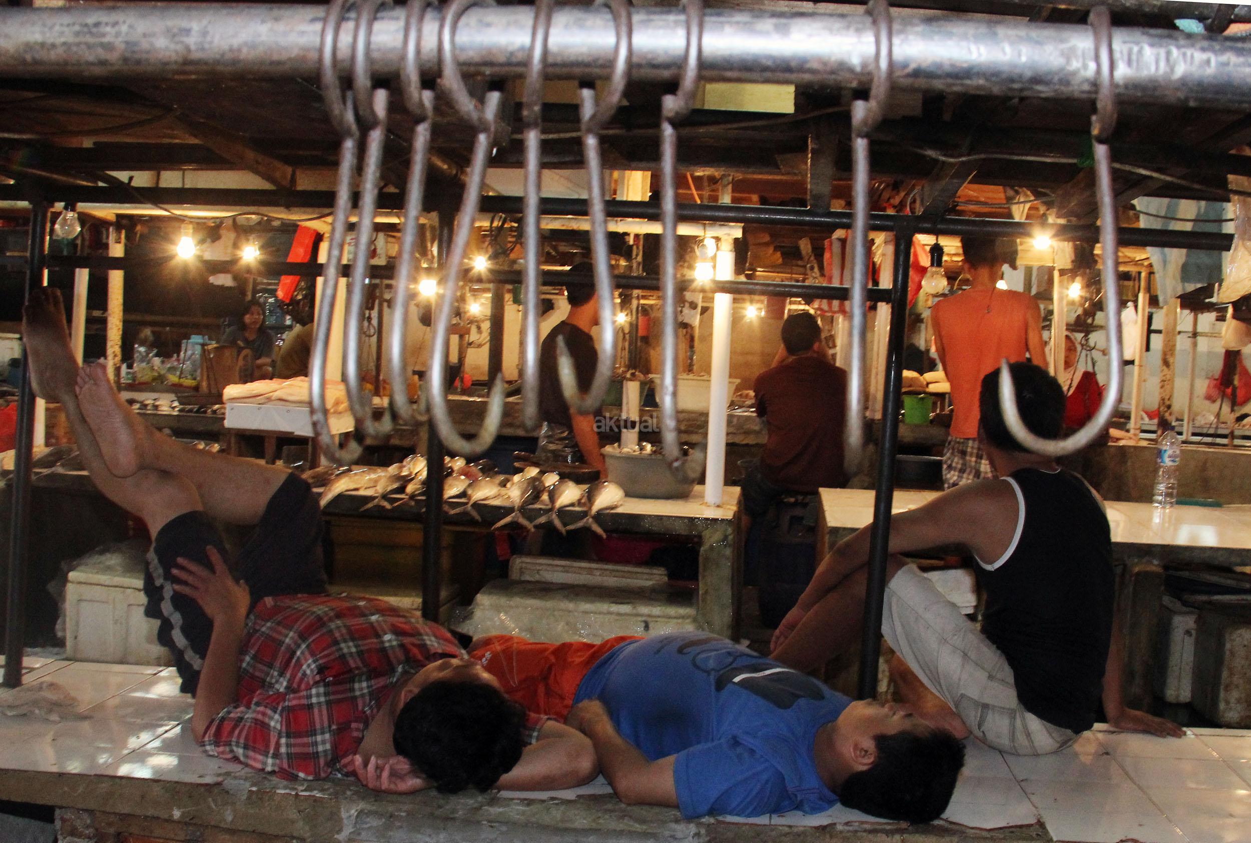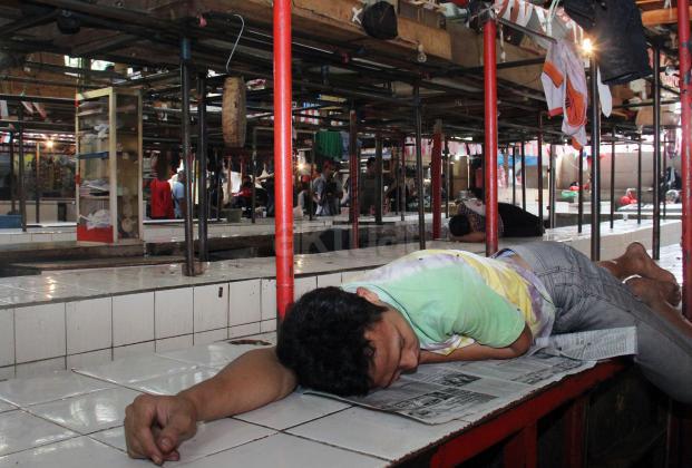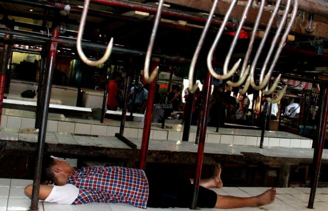 Terlihat pedagang sedang tertidur dikiosnya, Pasar Senen, Jakarta Pusat, Minggu (9/8/2015). Aksi mogok yang dilakukan ratusan pedagang daging sapi ini akan berlangsung hingga Rabu, 12 Agustus nanti. Mereka kecewa karena harga daging terus naik tak terkendali. Di samping itu, kuota impor sapi juga dibatasi.