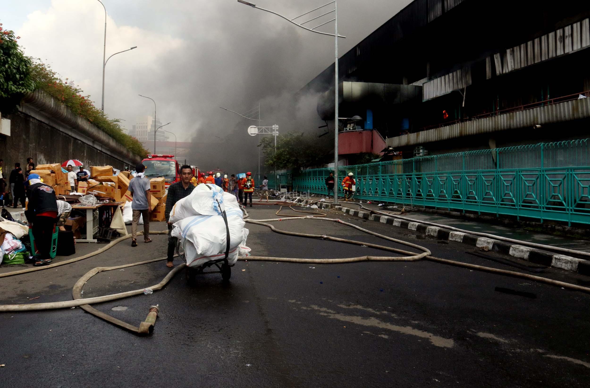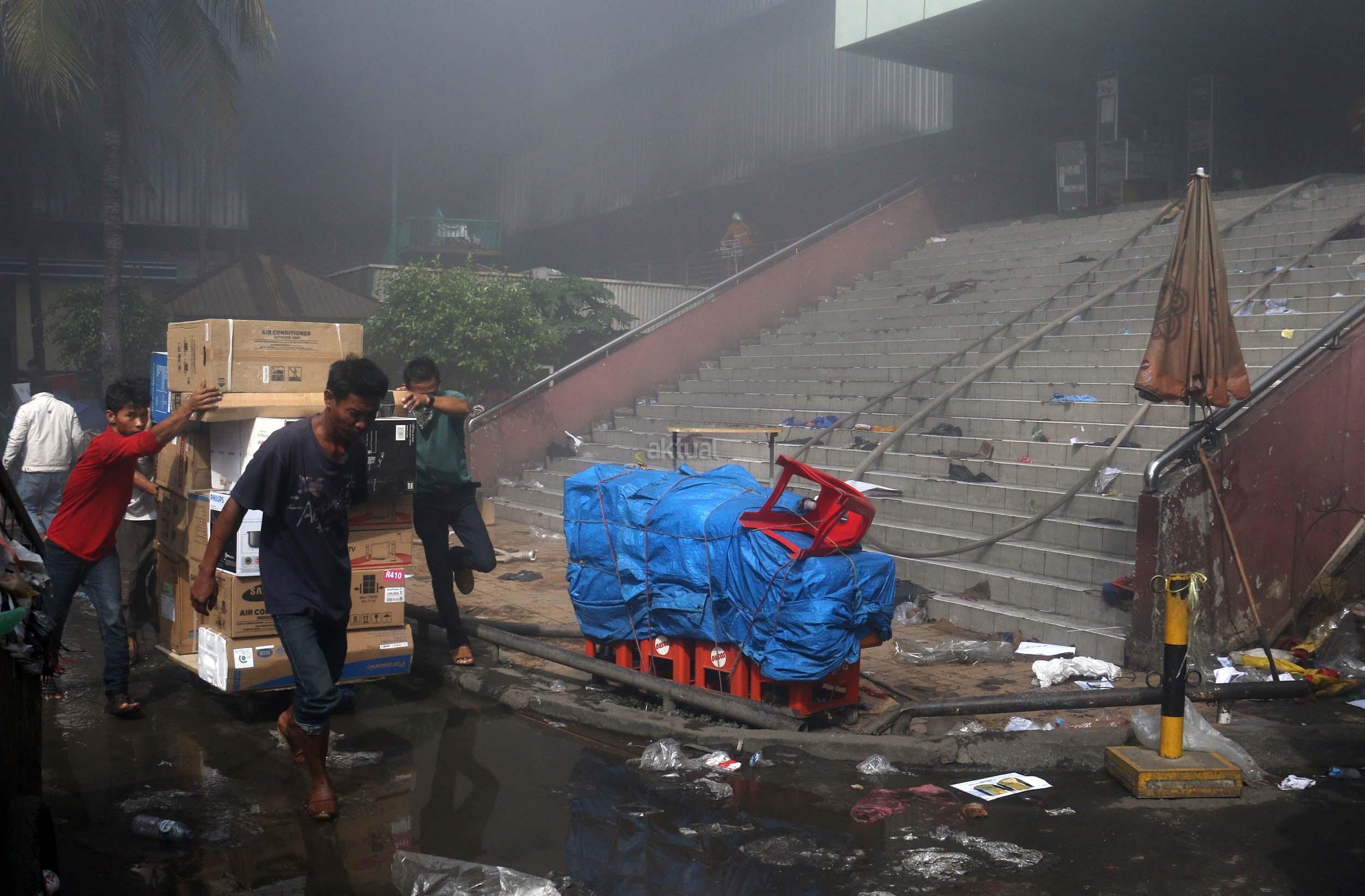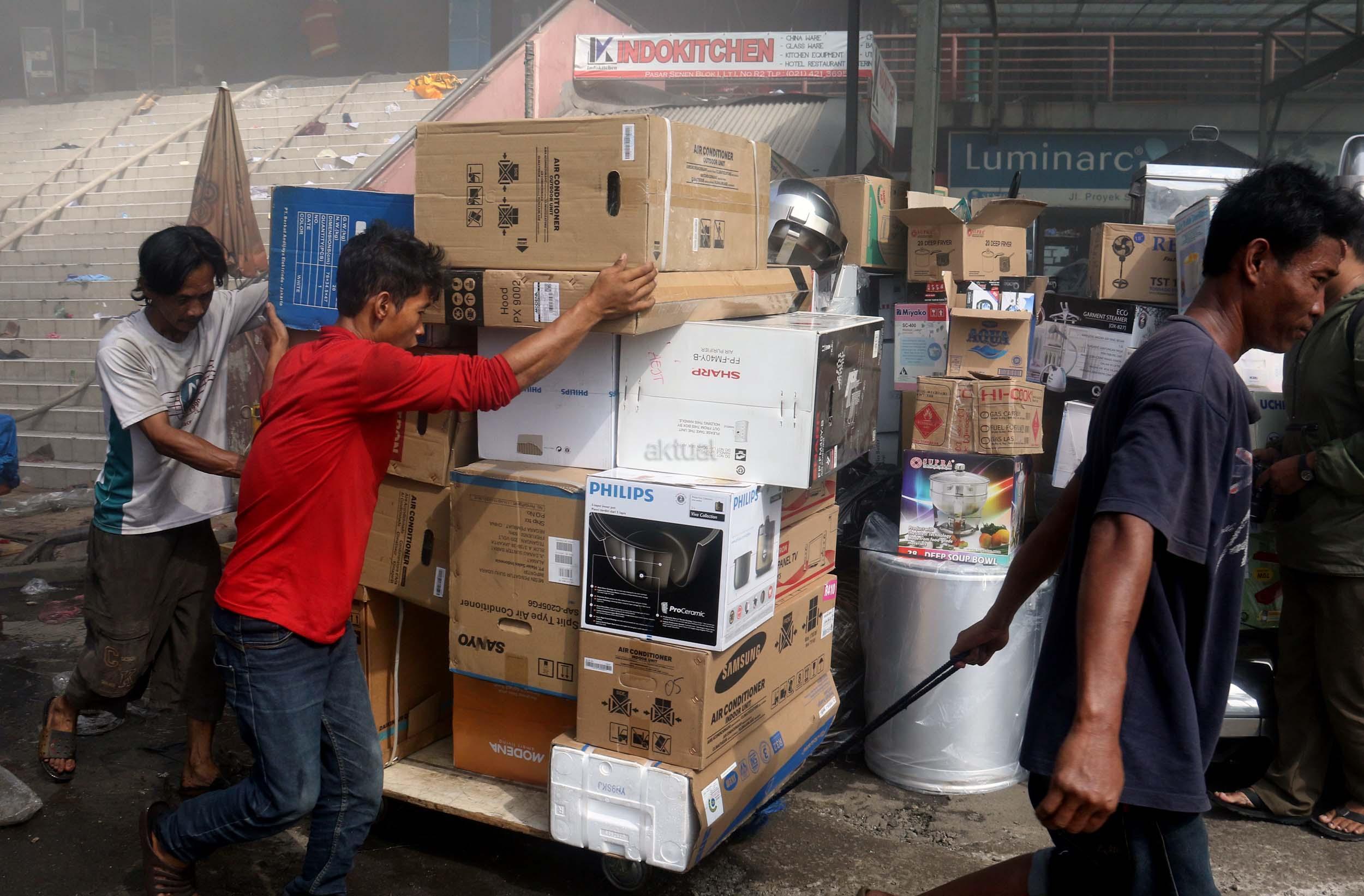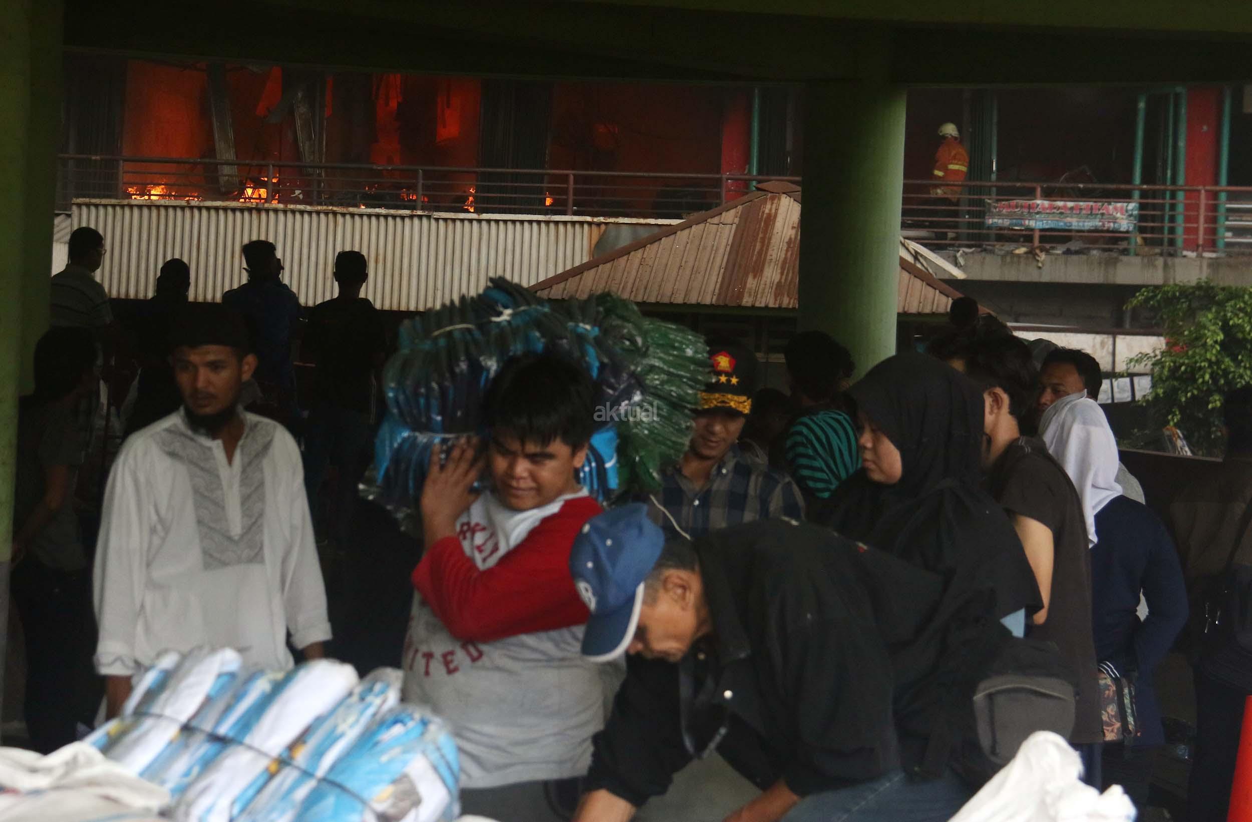 Pedagang menyelamatkan barang-barangnya dari lokasi Blok I dan Blok II Pasar Senen yang terbakar di Jakarta, Kamis (19/1/2017). Kebakaran yang melanda Pasar Senen membuat sejumlah pedagang panik dan menyelamatkan barang dagangannya, Kebakaran di Pasar Senen tersebut dilaporkan terjadi sekitar pukul 04.43 WIB dan masih dalam penanganan petugas yang mengerahkan sedikitnya 50 unit mobil pemadam kebakaran. AKTUAL/Munzir