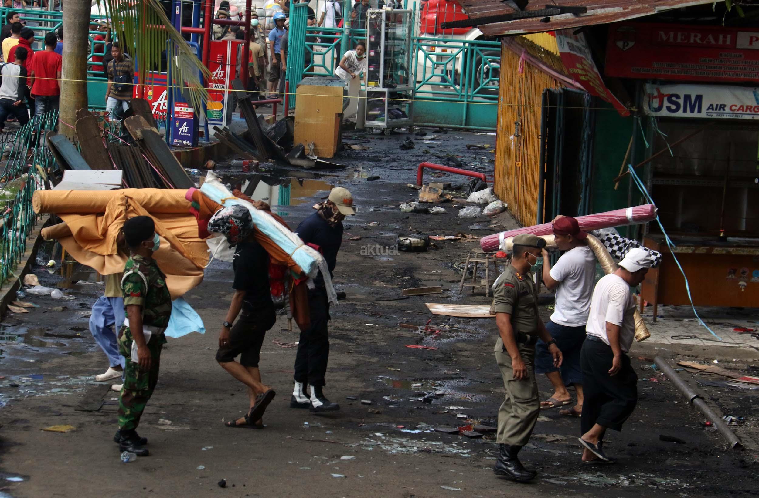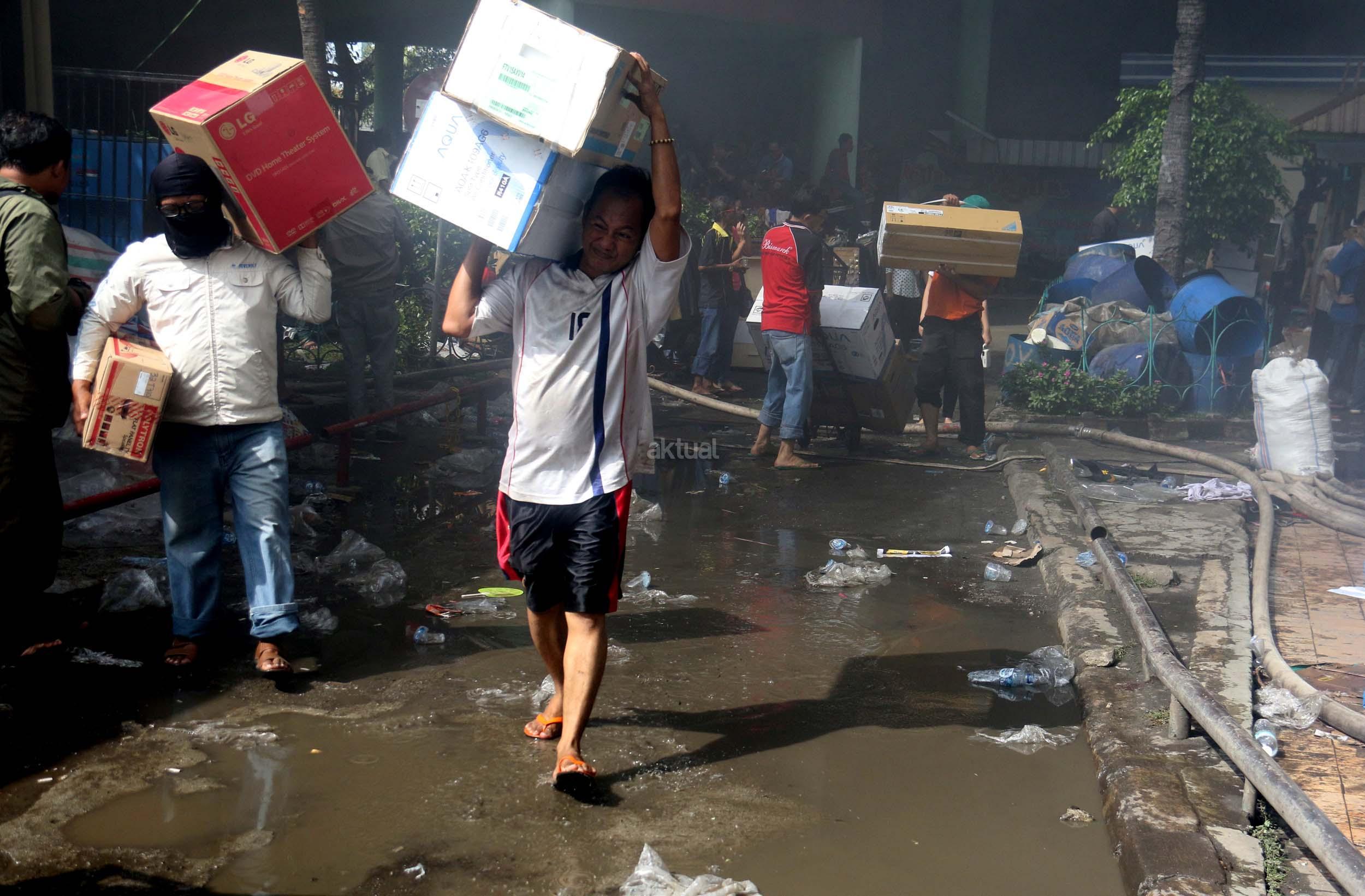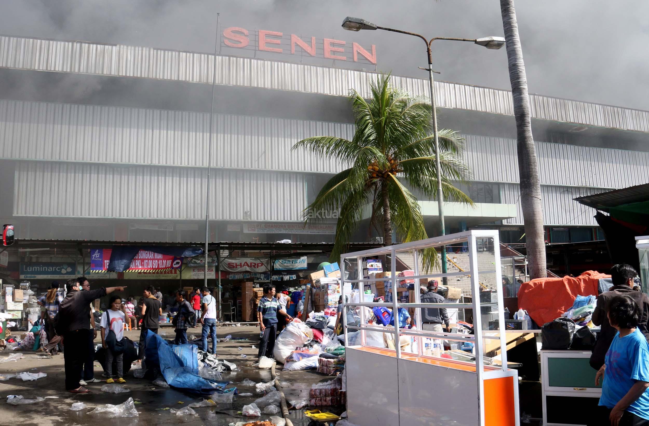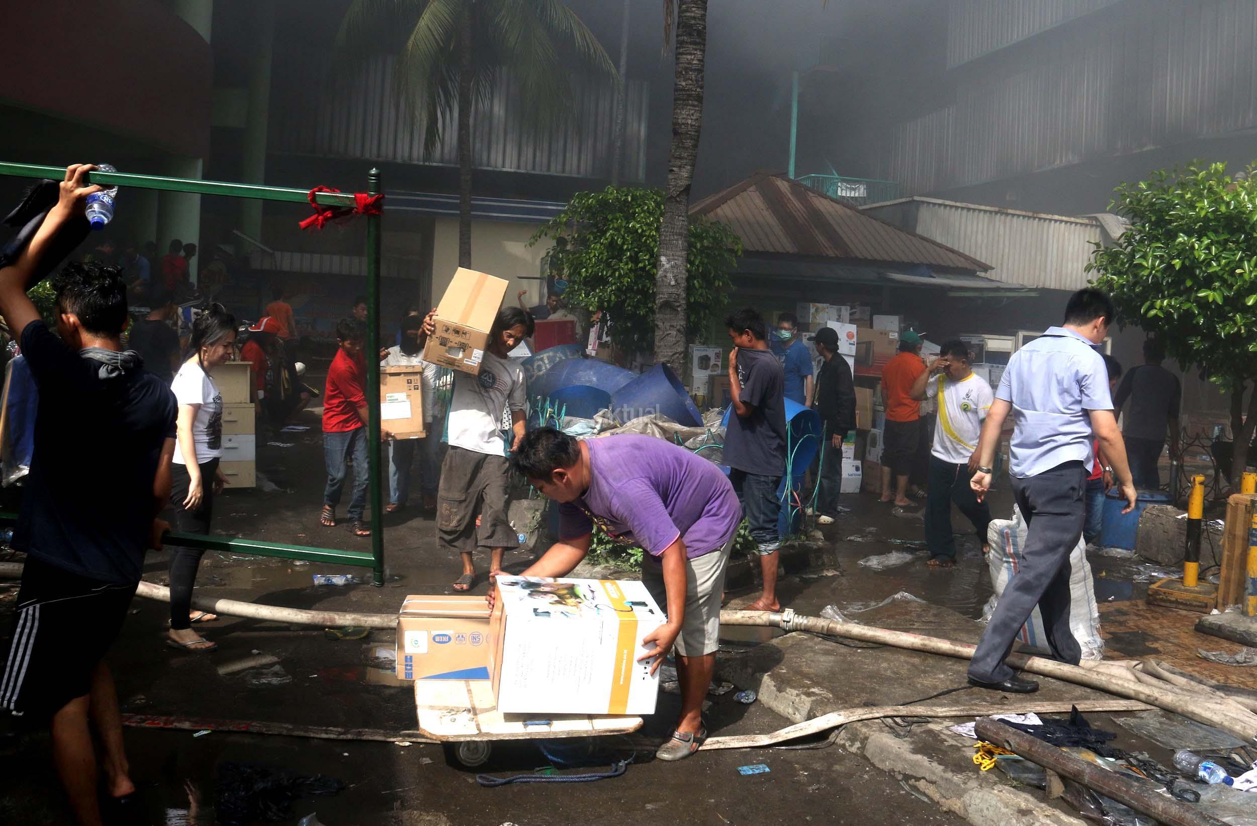 Pedagang menyelamatkan barang-barangnya dari lokasi Blok I dan Blok II Pasar Senen yang terbakar di Jakarta, Kamis (19/1/2017). Kebakaran yang melanda Pasar Senen membuat sejumlah pedagang panik dan menyelamatkan barang dagangannya, Kebakaran di Pasar Senen tersebut dilaporkan terjadi sekitar pukul 04.43 WIB dan masih dalam penanganan petugas yang mengerahkan sedikitnya 50 unit mobil pemadam kebakaran. AKTUAL/Munzir