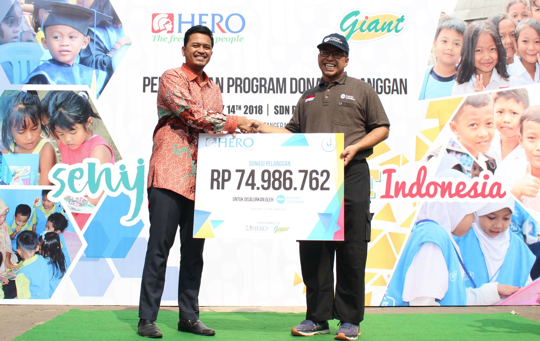 Manager CSR PT Hero Supermarket Tbk, Arya Kusumo (kiri) menyerahkan donasi kepada Partnership Director PKPU Human Initiative, Andjar Radite (kanan) saat acara “Fun Teaching Day” di SDN Pakualam 01, Tangerang Selatan, Banten, Senin (14/5/18). Hero Supermarket meluncurkan program donasi pelanggan bertajuk “Senyum Indonesia”, yang berfokus kepada pemberian bantuan untuk sekolah Pendidikan Anak Usia Dini (PAUD). Sedangkan Giant meresmikan program donasi pelanggannya dengan nama “Gerakan Inspirasi Anak Teladan Indonesia (GIAT Indonesia)”, dimana pemberian bantuannya untuk mendukung kemajuan pendidikan Sekolah Dasar (SD). Donasi Pelanggan ini akan dikelola oleh PKPU Human Initiative, yang akan berkoordinasi langsung dengan toko-toko untuk mencari PAUD dan SD yang membutuhkan. AKTUAL/Eko S Hilman