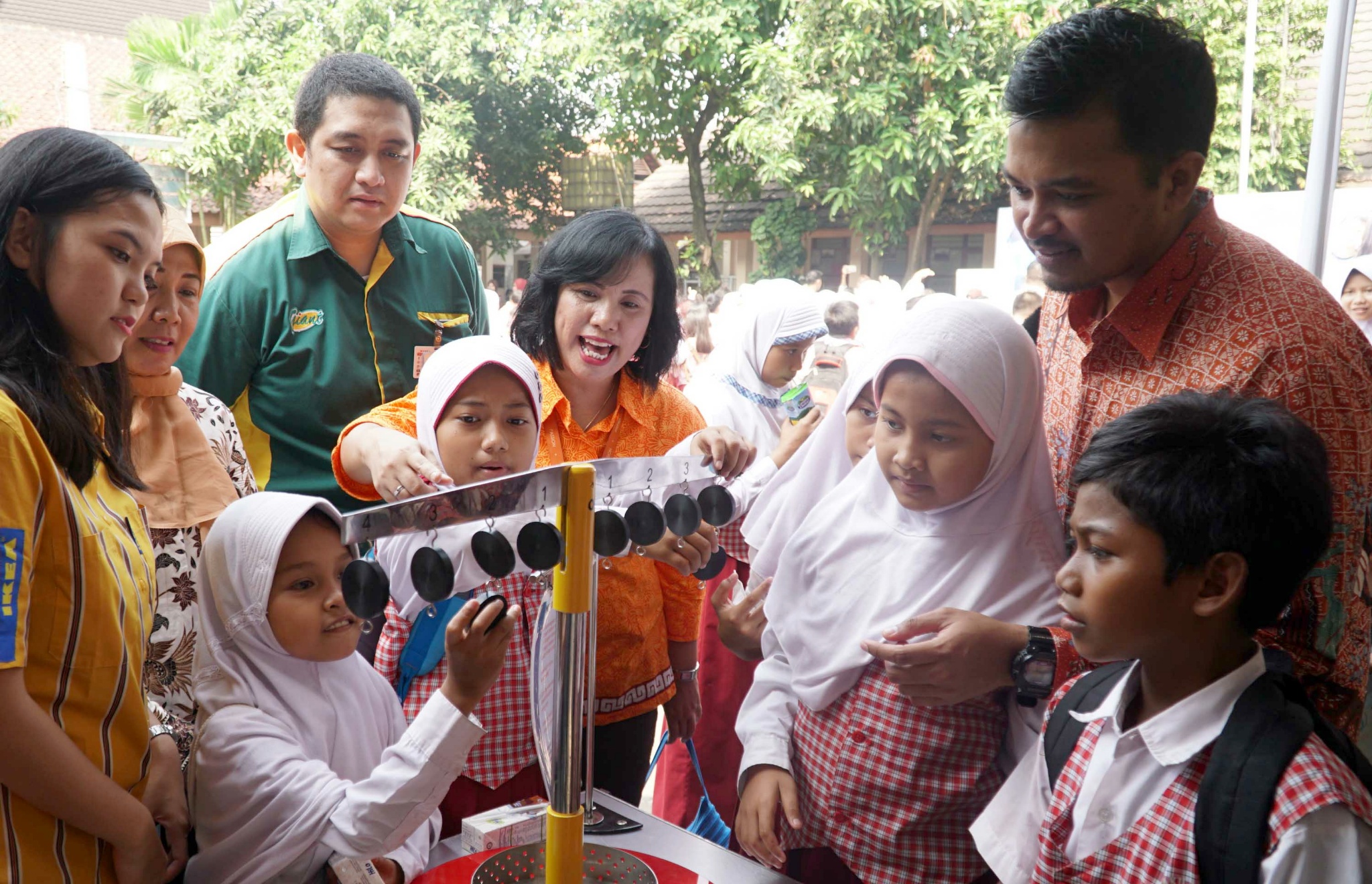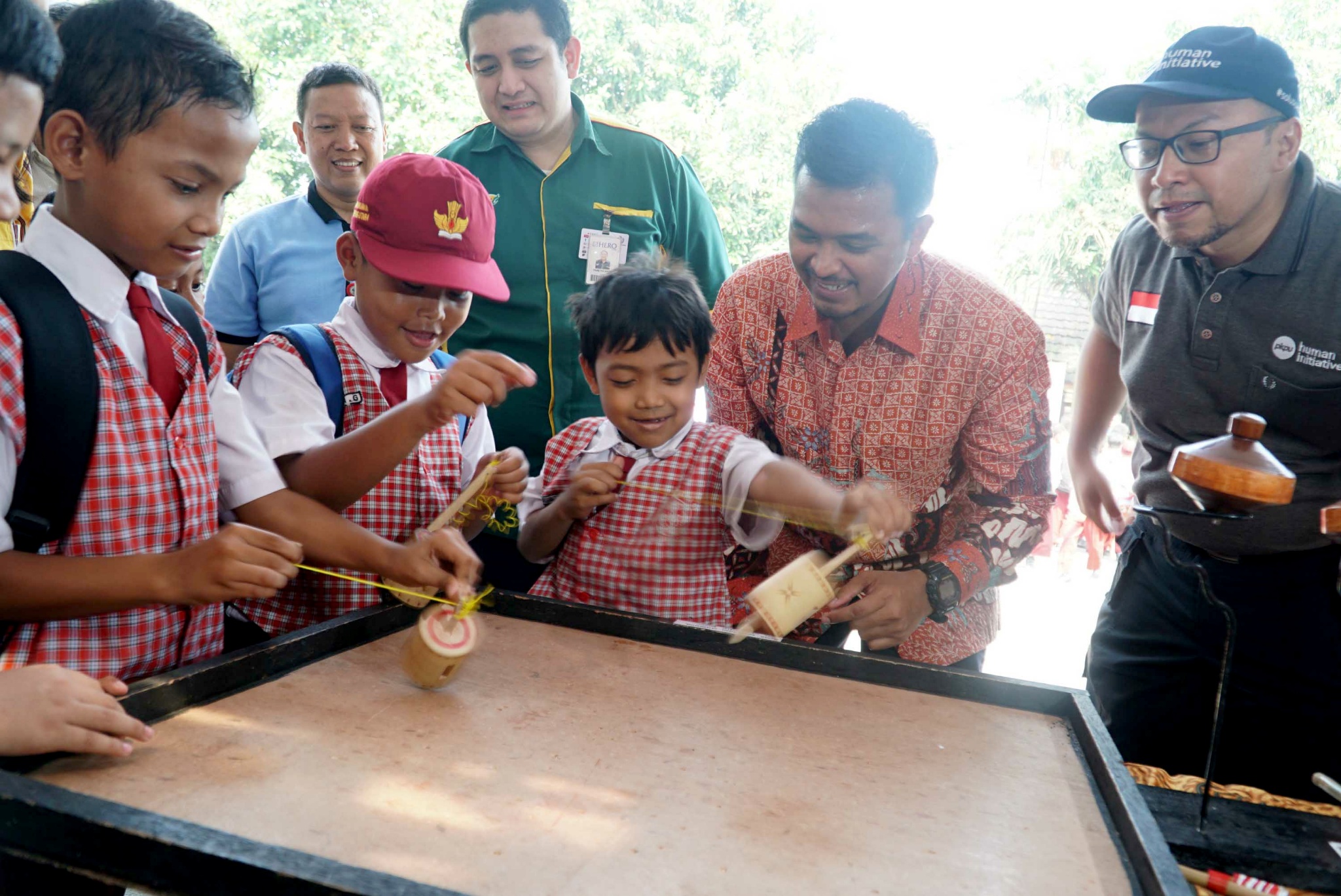 Karyawan Hero Supermarket, Giant, Guardian dan IKEA bermain bersama anak-anak dari SDN Pakualam 01 Tangerang Selatan, Banten, Senin (14/5/18). Acara “Fun Teaching Day” ini, terdapat kegiatan “Parenting class” dimana orang tua murid dan guru diajak berdiskusi membangun keluarga yang sehat, serta “my class” yang merupakan kegiatan voluntary dari karyawan PT Hero Supermarket Tbk. Anak-anak diberi pengalaman merasakan permainan tradisional, pameran sains, dan tur ke IKEA. Kegiatan ini sekaligus sebagai simbolis peluncuran program donasi untuk Hero Supermarket yang meluncurkan program donasi pelanggan bertajuk “Senyum Indonesia”. AKTUAL/Eko S Hilman