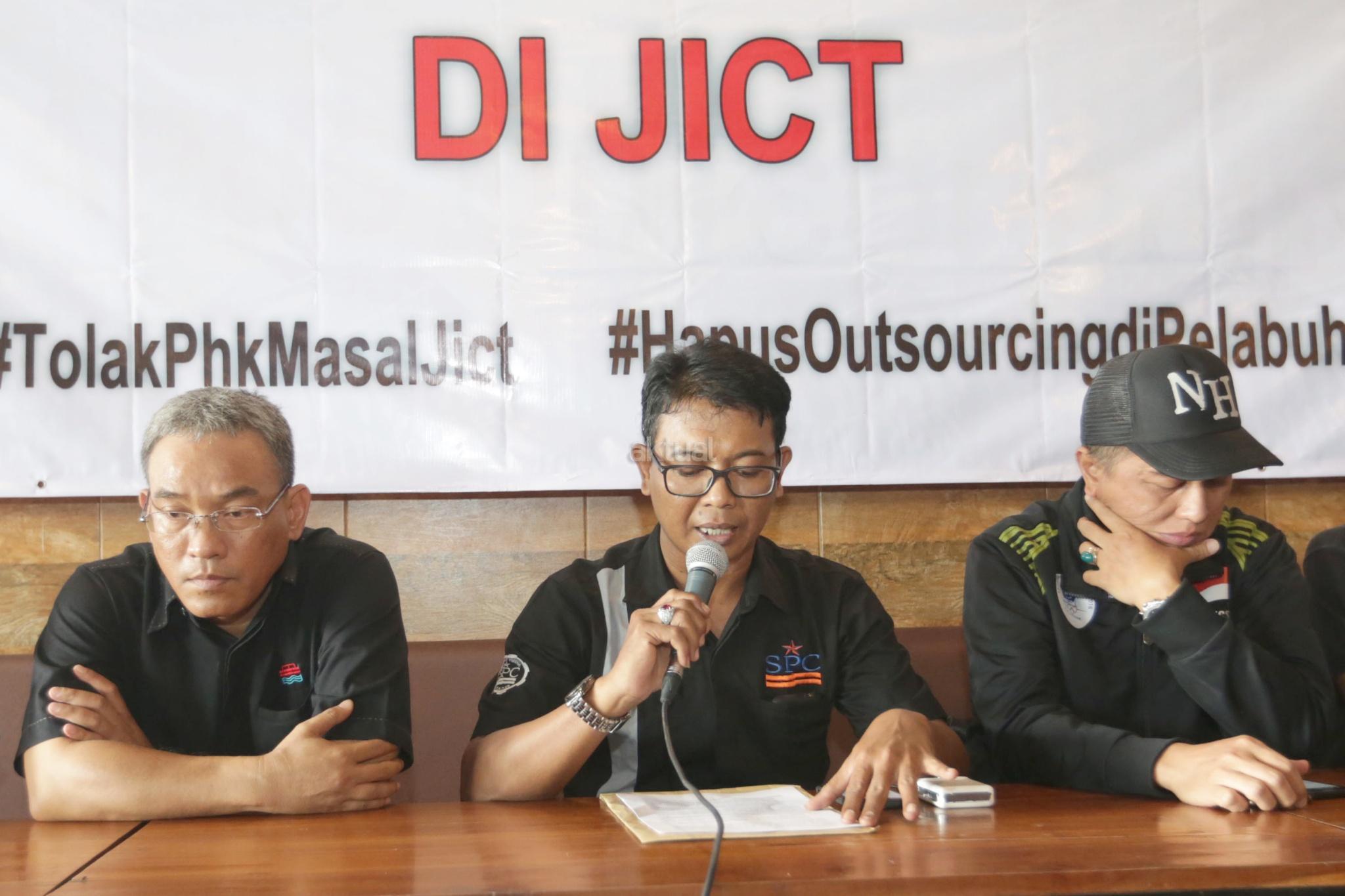 Ketua Serikat Pekerja JICT Hazris Malsyah memberikan pernyataan dukungan terhadap penolakan PHK massal 400 buruh outsourcing di Jakarta International Container Terminal (JICT), Jakarta, Selasa (26/12/2017). Berkomitmen untuk melanjutkan agenda menyelamatkan aset nasional dan menegakkan keadilan bagi pekerja JICT, keputusan PHK massal tersebut terindikasi melawan aturan dan Undang-Undang Ketenagakerjaan. Jika putusan kontroversial ini tetap dijalankan, buruh pelabuhan akan melakukan demo besar-besaran termasuk menutup Pelabuhan Tanjung Priok. AKTUAL/Tino Oktaviano