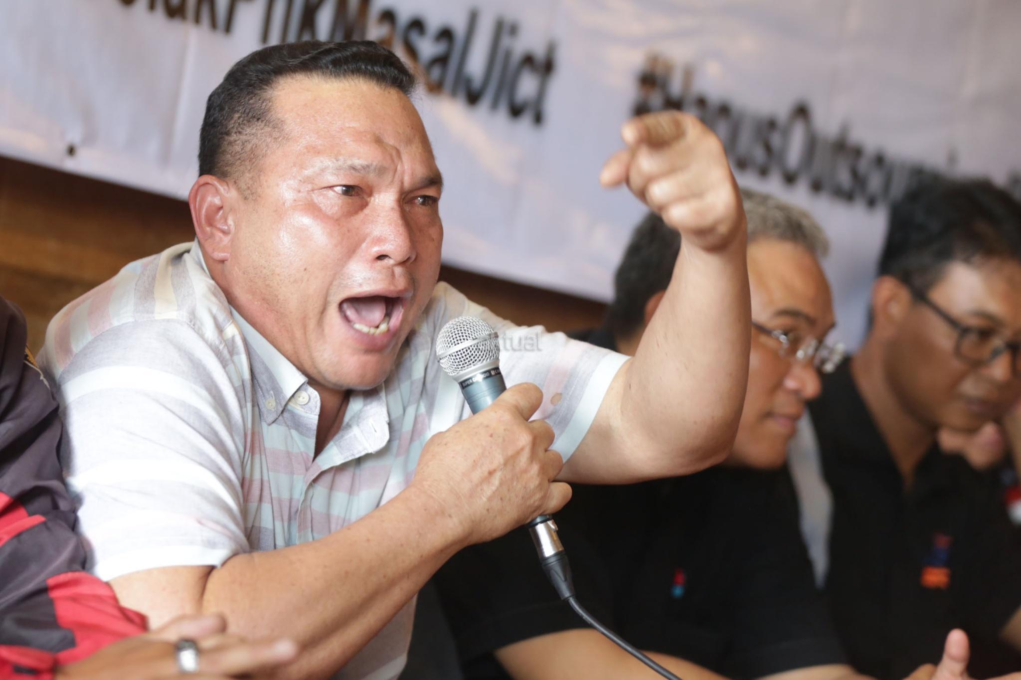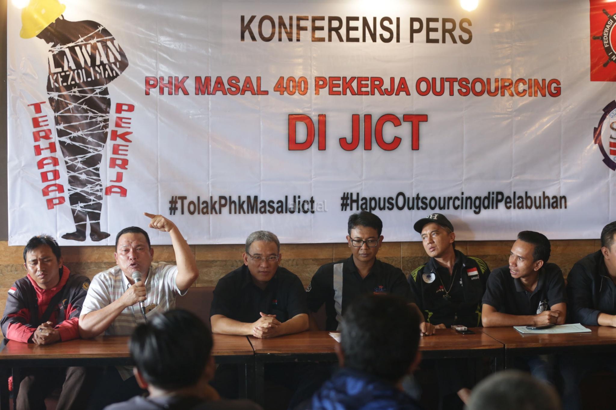 Sekjen SP Multi Terminal Indonesia (MTI) Hairuddin Pasaribu memberikan pernyataan dukungan terhadap penolakan PHK massal 400 buruh outsourcing di Jakarta International Container Terminal (JICT), Jakarta, Selasa (26/12/2017). Berkomitmen untuk melanjutkan agenda menyelamatkan aset nasional dan menegakkan keadilan bagi pekerja JICT, keputusan PHK massal tersebut terindikasi melawan aturan dan Undang-Undang Ketenagakerjaan. Jika putusan kontroversial ini tetap dijalankan, buruh pelabuhan akan melakukan demo besar-besaran termasuk menutup Pelabuhan Tanjung Priok. AKTUAL/Tino Oktaviano