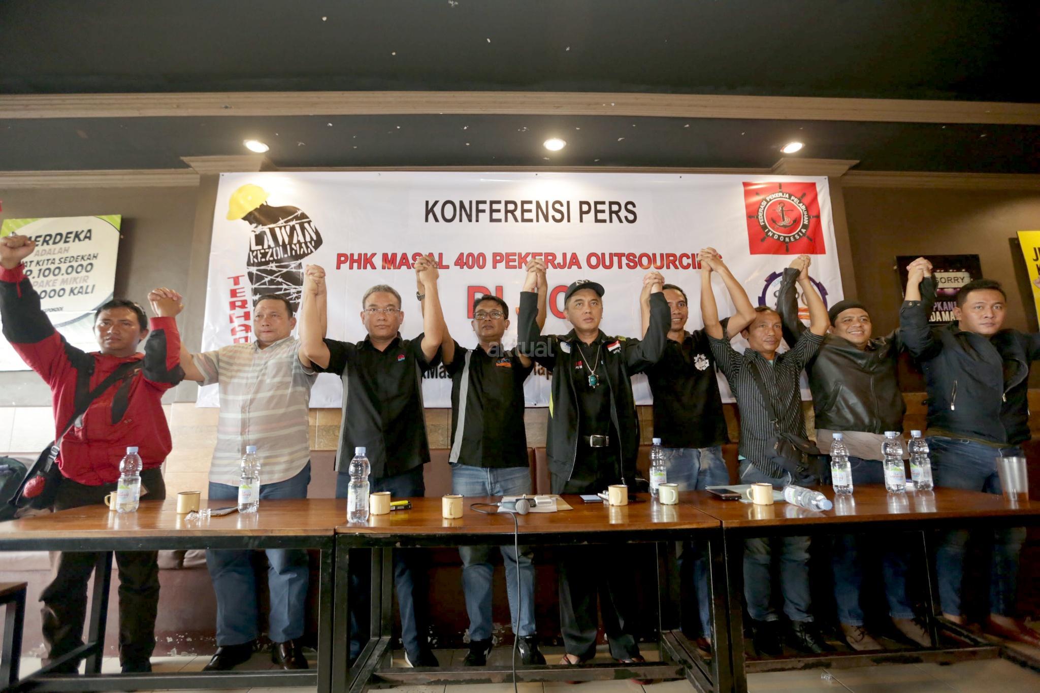 Ketua Serikat Pekerja Container (SPC) Sabar Royani (tengah) memberikan pernyataan dukungan terhadap penolakan PHK massal 400 buruh outsourcing di Jakarta International Container Terminal (JICT), Jakarta, Selasa (26/12/2017). Berkomitmen untuk melanjutkan agenda menyelamatkan aset nasional dan menegakkan keadilan bagi pekerja JICT, keputusan PHK massal tersebut terindikasi melawan aturan dan Undang-Undang Ketenagakerjaan. Jika putusan kontroversial ini tetap dijalankan, buruh pelabuhan akan melakukan demo besar-besaran termasuk menutup Pelabuhan Tanjung Priok. AKTUAL/Tino Oktaviano