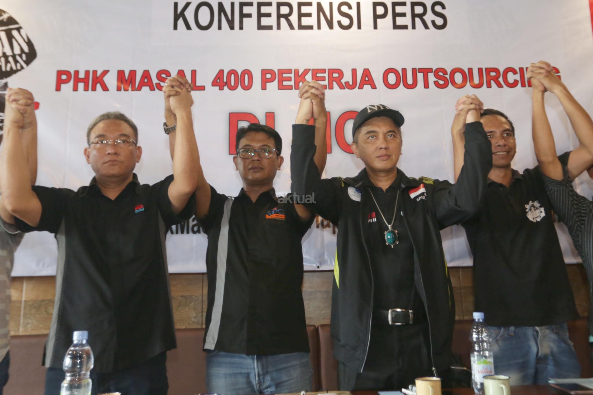 Sekjen SP Multi Terminal Indonesia (MTI) Hairuddin Pasaribu (kedua kiri) memberikan pernyataan dukungan terhadap penolakan PHK massal 400 buruh outsourcing di Jakarta International Container Terminal (JICT), Jakarta, Selasa (26/12/2017). Berkomitmen untuk melanjutkan agenda menyelamatkan aset nasional dan menegakkan keadilan bagi pekerja JICT, keputusan PHK massal tersebut terindikasi melawan aturan dan Undang-Undang Ketenagakerjaan. Jika putusan kontroversial ini tetap dijalankan, buruh pelabuhan akan melakukan demo besar-besaran termasuk menutup Pelabuhan Tanjung Priok. AKTUAL/Tino Oktaviano