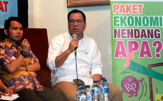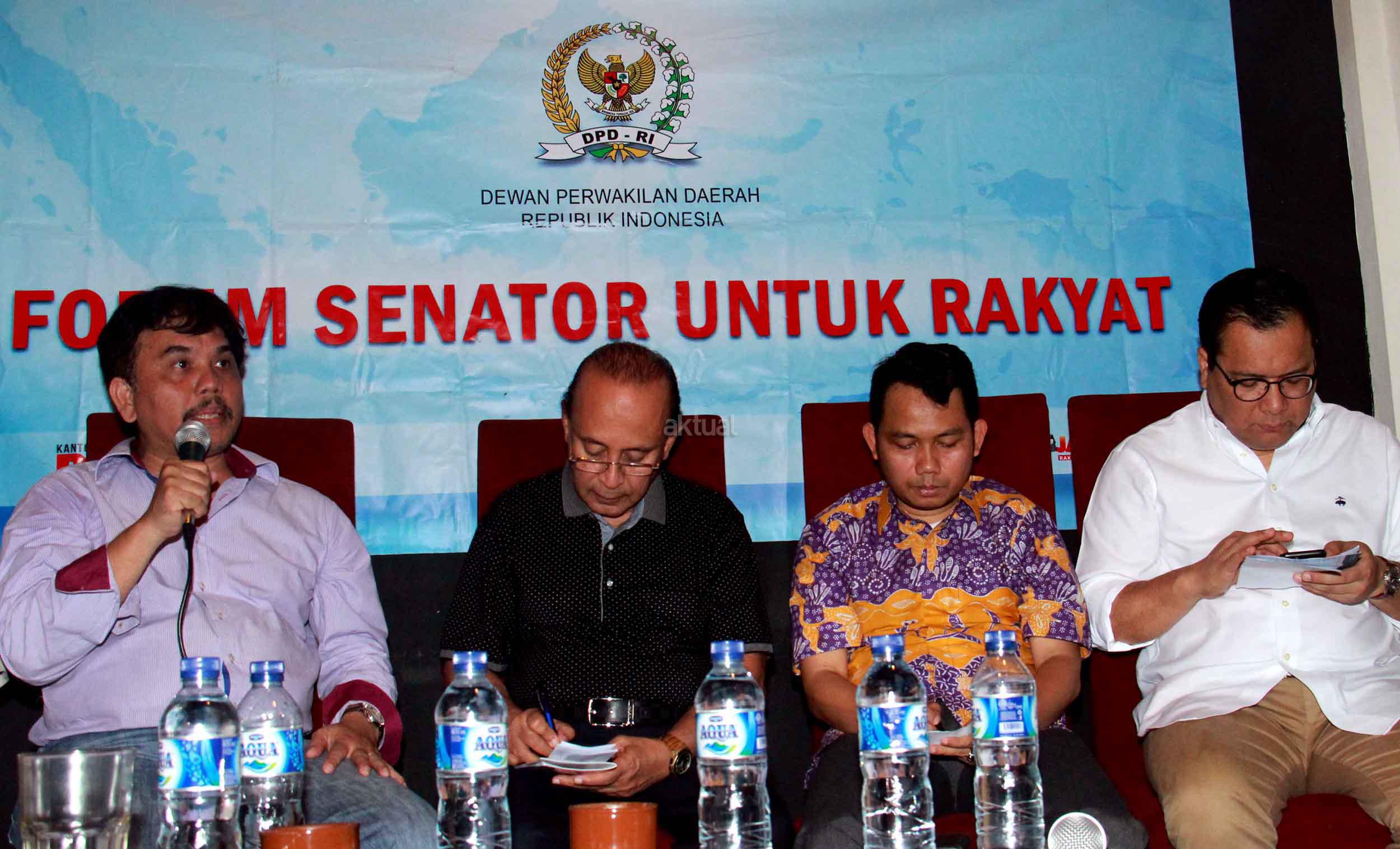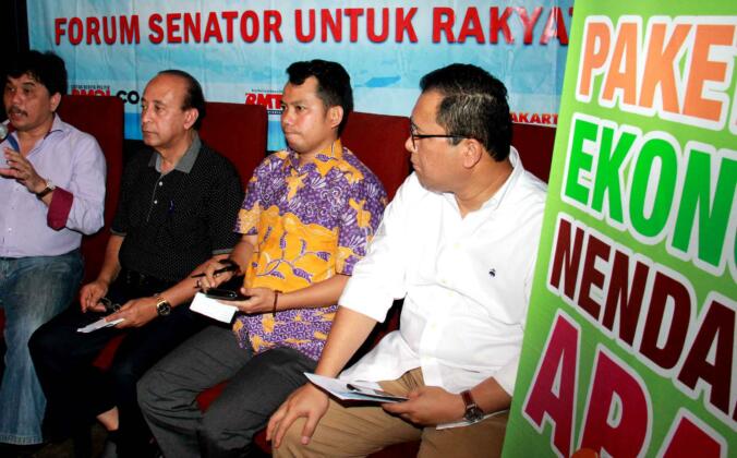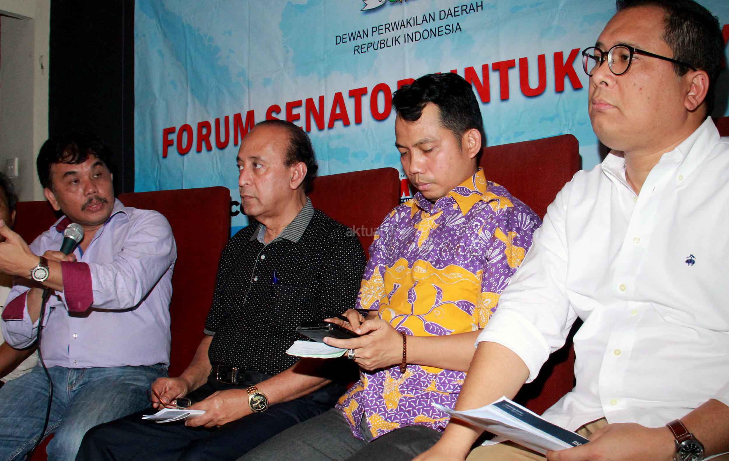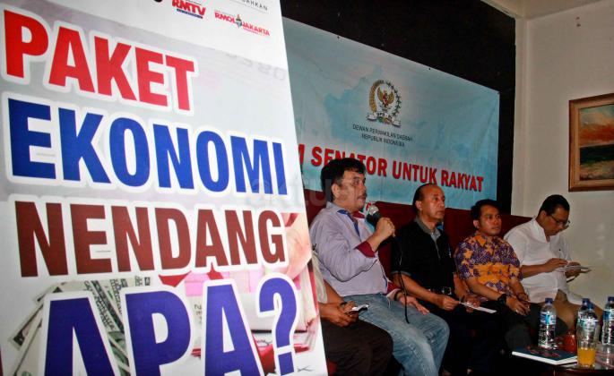Kika; Direktur Sabang-Merauke Circle Syahganda Nainggolan, Mantan Menteri Keuangan Fuad Bawazie, Anggota DPD RI Abdul Azis Khafi, Staf Menteri Keuangan Arief Budimanta, dalam diskusi Forum Senator Untuk Rakyat, di Jakarta, Minggu (4/10/2015). Diskusi yang menyoroti kebijakan paket ekonomi pemerintahan Jokowi/JK bertamkan "Paket Ekonomi Nendang Apa?"