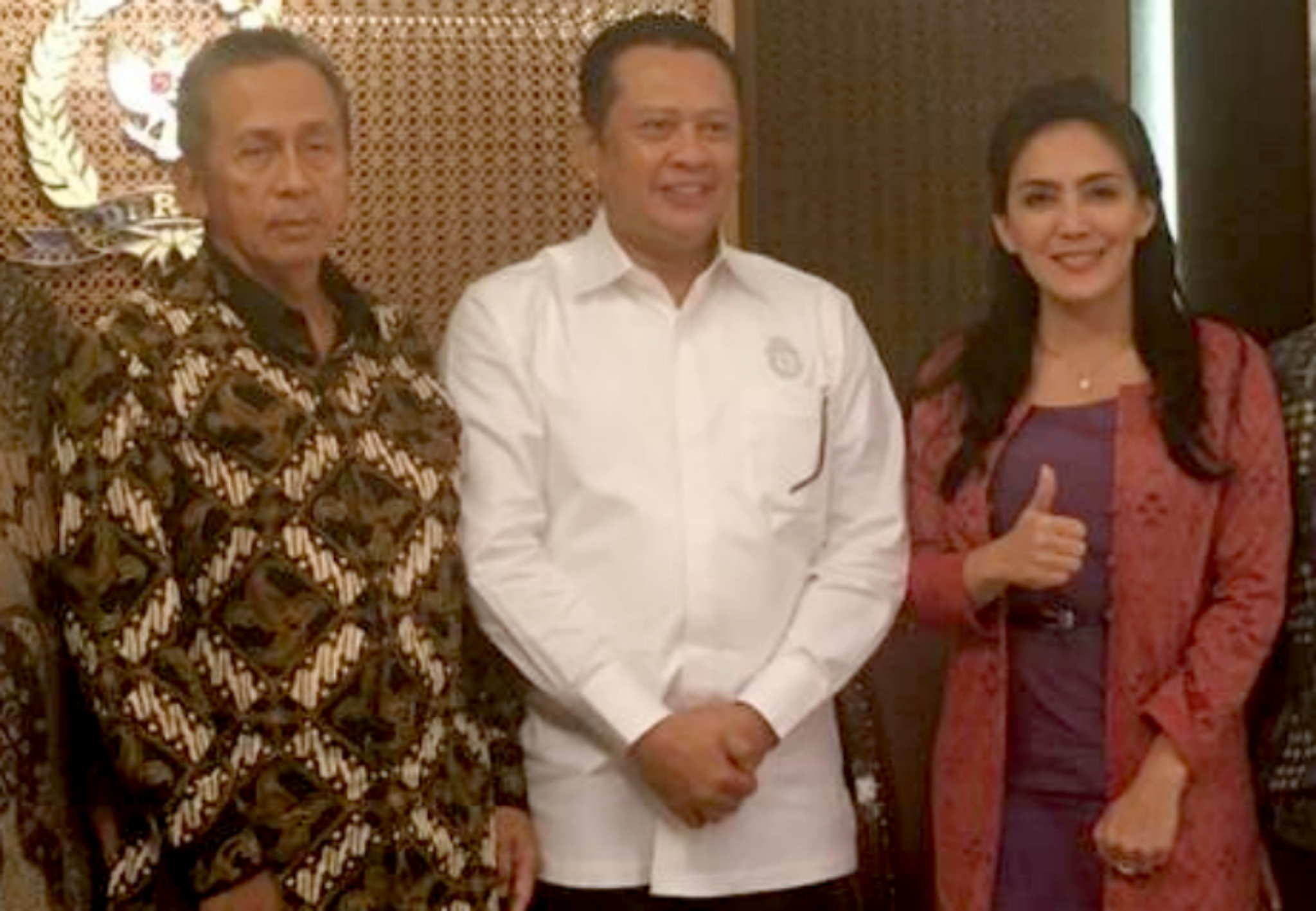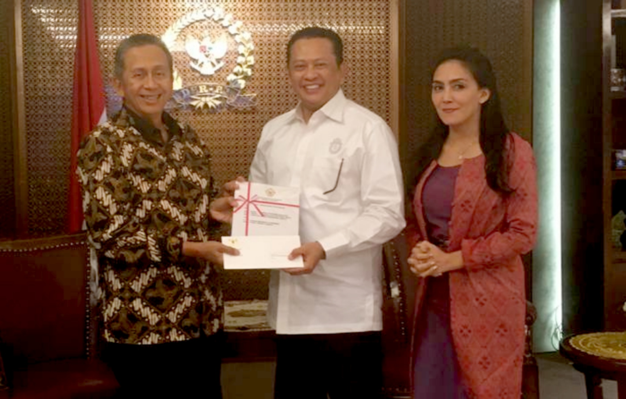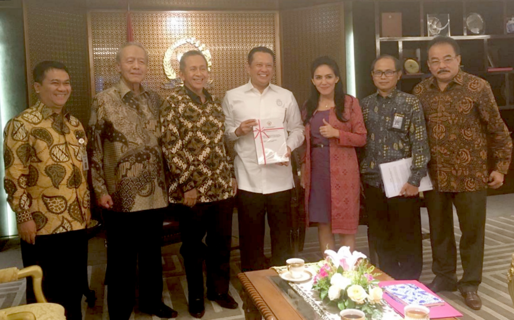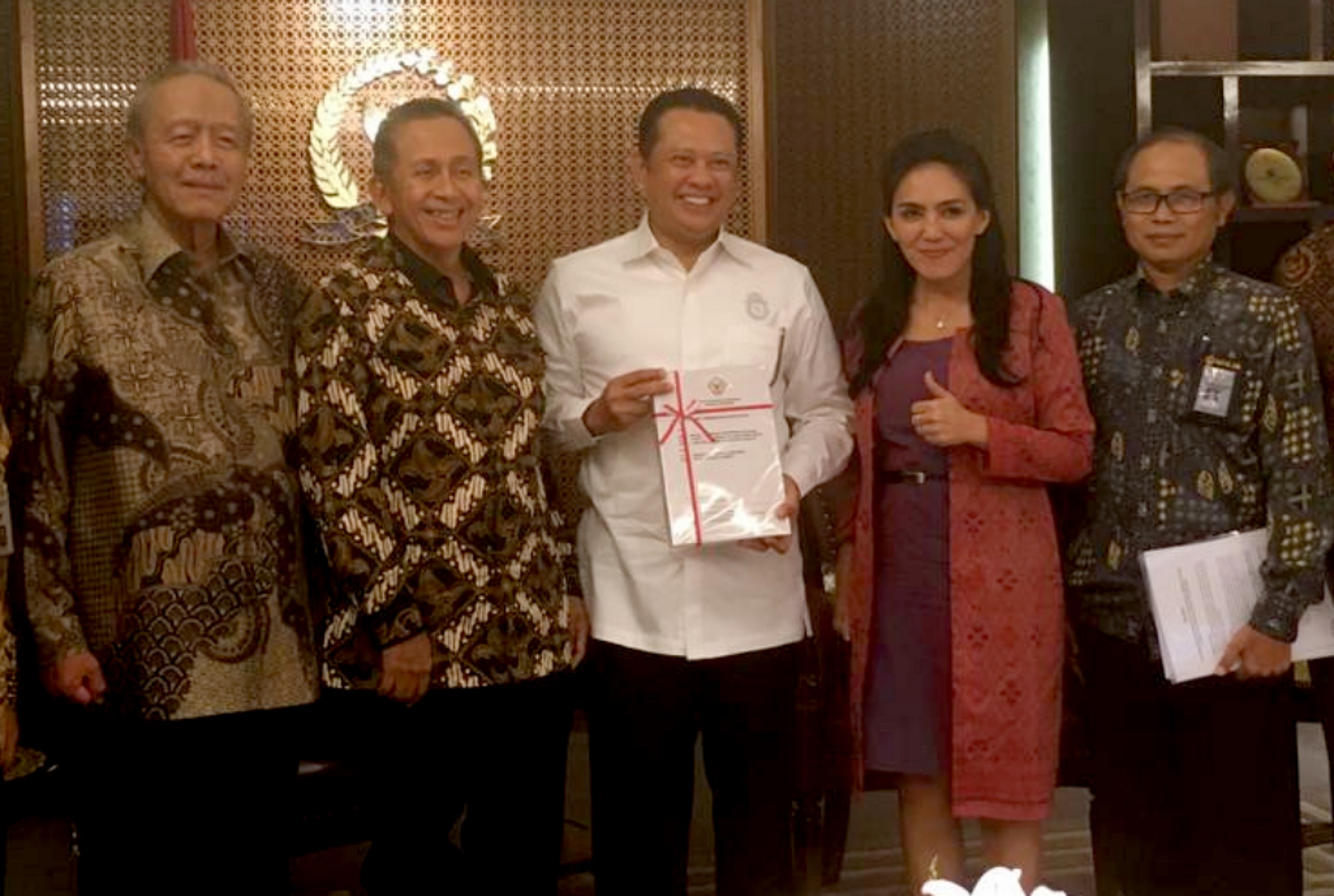 Ketua DPR RI Bambang Soesatyo foto bersama usai menerima audit investigatif terkait pembangunan Kalibaru (NPCT) Pelindo II (IPC) bersama Ketua BPK RI Moermahadi Soerja Djanegara dan Ketua Pansus Angket DPR-RI tentang Pelindo II Rieke Diah Pitaloka di ruang pimpinan DPR, gedung Parlemen, Senayan, Jakarta, Selasa (25/9/2018). Dalam laporan audit investigatif tersebut, BPK menyampaikan bahwa proyek pembangunan pelabuhan Kalibaru termasuk tahap 1 (NPCT-1) terindikasi merugikan negara Rp 1,4 trilyun. AKTUAL/Pool