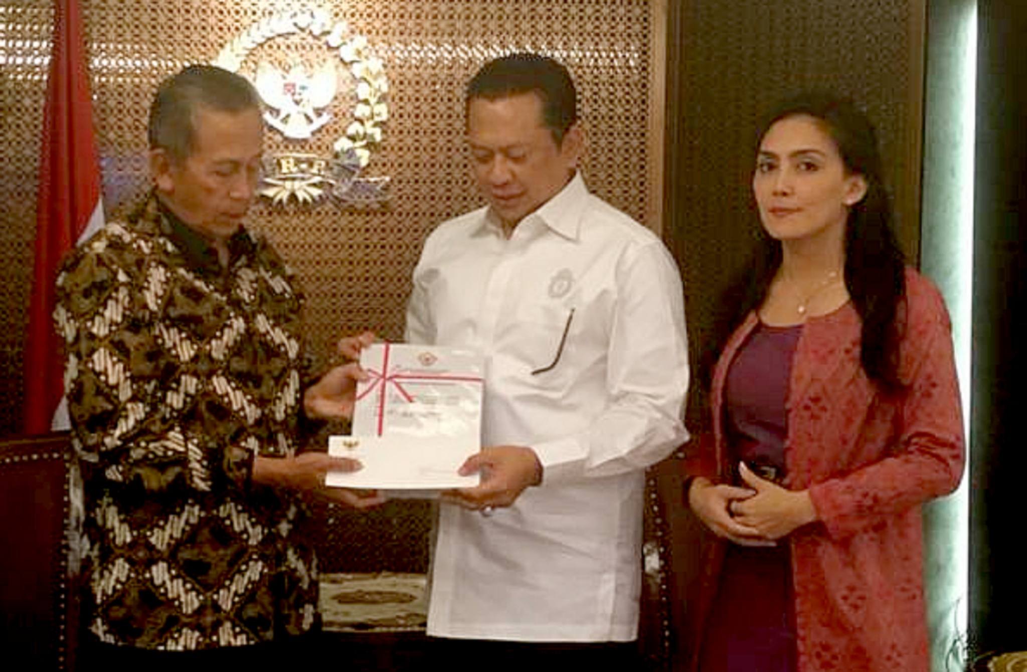 Ketua DPR RI Bambang Soesatyo (tengah) menerima audit investigatif terkait pembangunan Kalibaru (NPCT) Pelindo II (IPC) dari Ketua BPK RI Moermahadi Soerja Djanegara (kiri) didampingi Ketua Pansus Angket DPR-RI tentang Pelindo II Rieke Diah Pitaloka di ruang pimpinan DPR, gedung Parlemen, Senayan, Jakarta, Selasa (25/9/2018). Dalam laporan audit investigatif tersebut, BPK menyampaikan bahwa proyek pembangunan pelabuhan Kalibaru termasuk tahap 1 (NPCT-1) terindikasi merugikan negara Rp 1,4 trilyun. AKTUAL/Pool