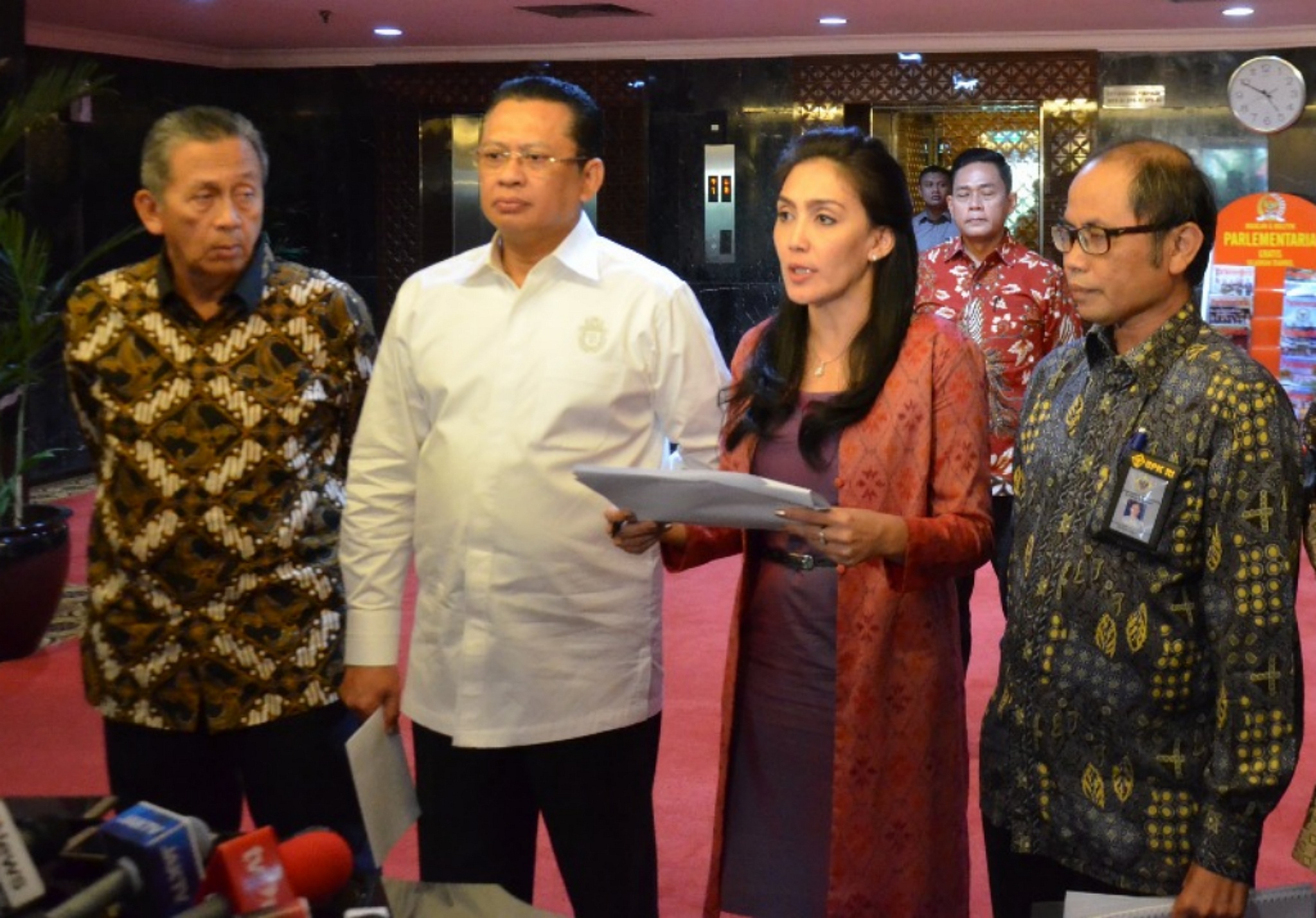 Ketua DPR RI Bambang Soesatyo bersama Ketua BPK RI Moermahadi Soerja Djanegara dan Ketua Pansus Angket DPR-RI tentang Pelindo II Rieke Diah Pitaloka menjawab pertanyaan wartawan usai menerima audit investigatif terkait pembangunan Kalibaru (NPCT) Pelindo II (IPC) bersama di ruang pimpinan DPR, gedung Parlemen, Senayan, Jakarta, Selasa (25/9/2018). Dalam laporan audit investigatif tersebut, BPK menyampaikan bahwa proyek pembangunan pelabuhan Kalibaru termasuk tahap 1 (NPCT-1) terindikasi merugikan negara Rp 1,4 trilyun. AKTUAL/Pool