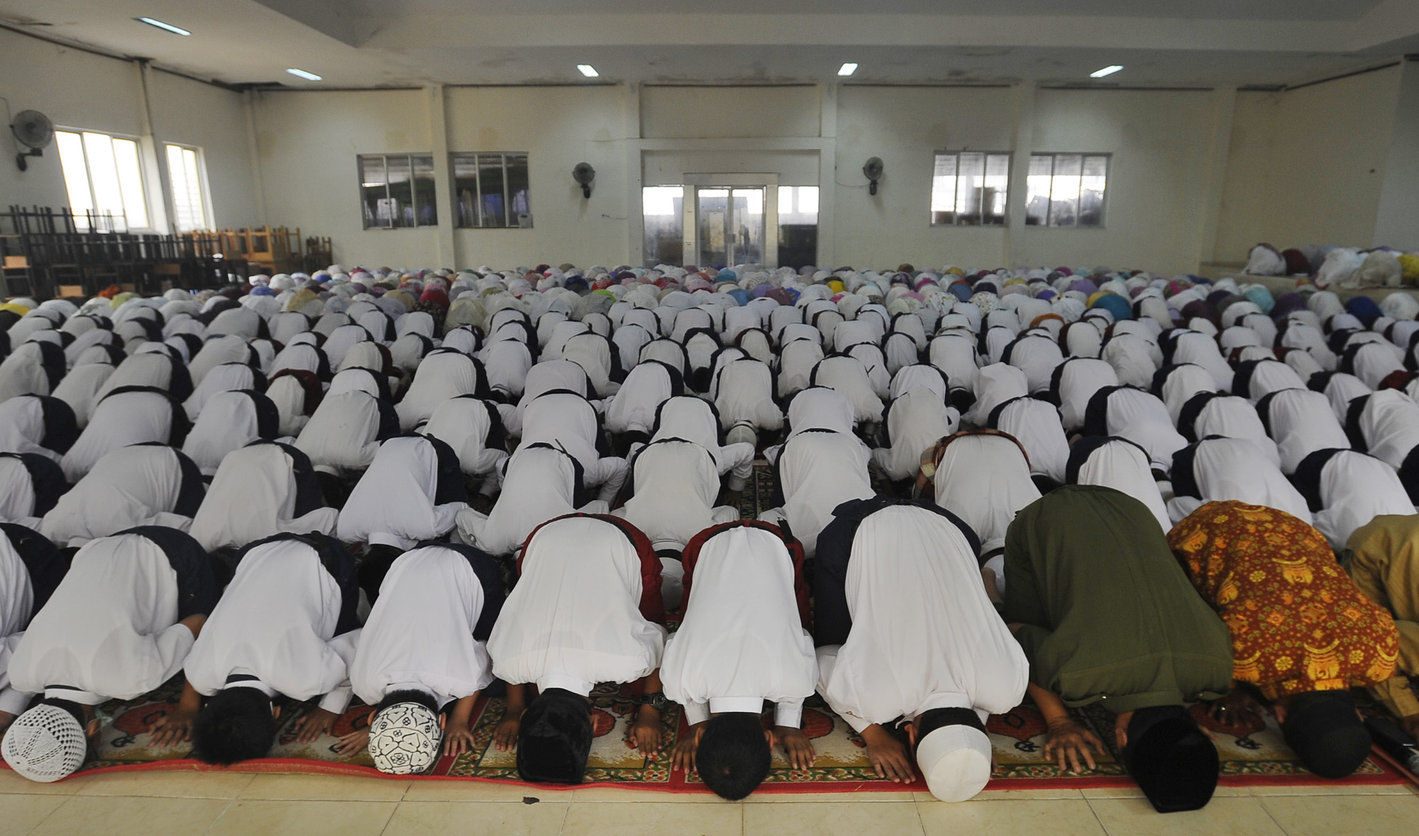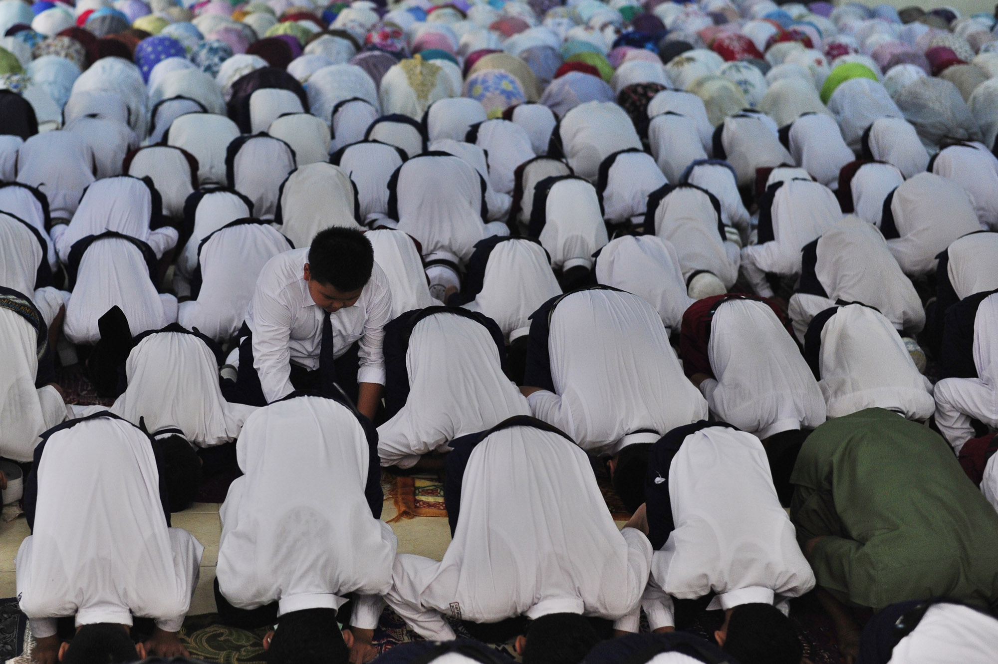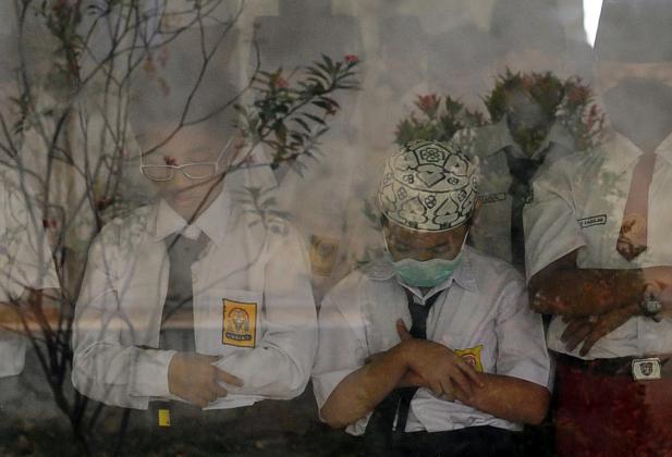 Ratusan siswa dan guru melaksanakan salat minta hujan (Istisqa) di SMPN 7 Jambi, Senin (14/9). Salat Istisqa dilakukan untuk meminta hujan agar kabut asap dan kekeringan dapat teratasi serta siswa dapat melakukan aktivitas belajar mengajar dengan normal. ANTARA FOTO/Wahyu Putro A/pd/15