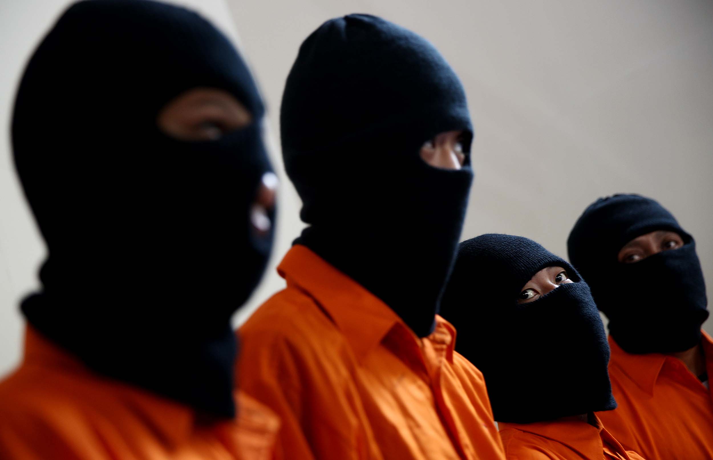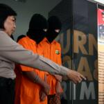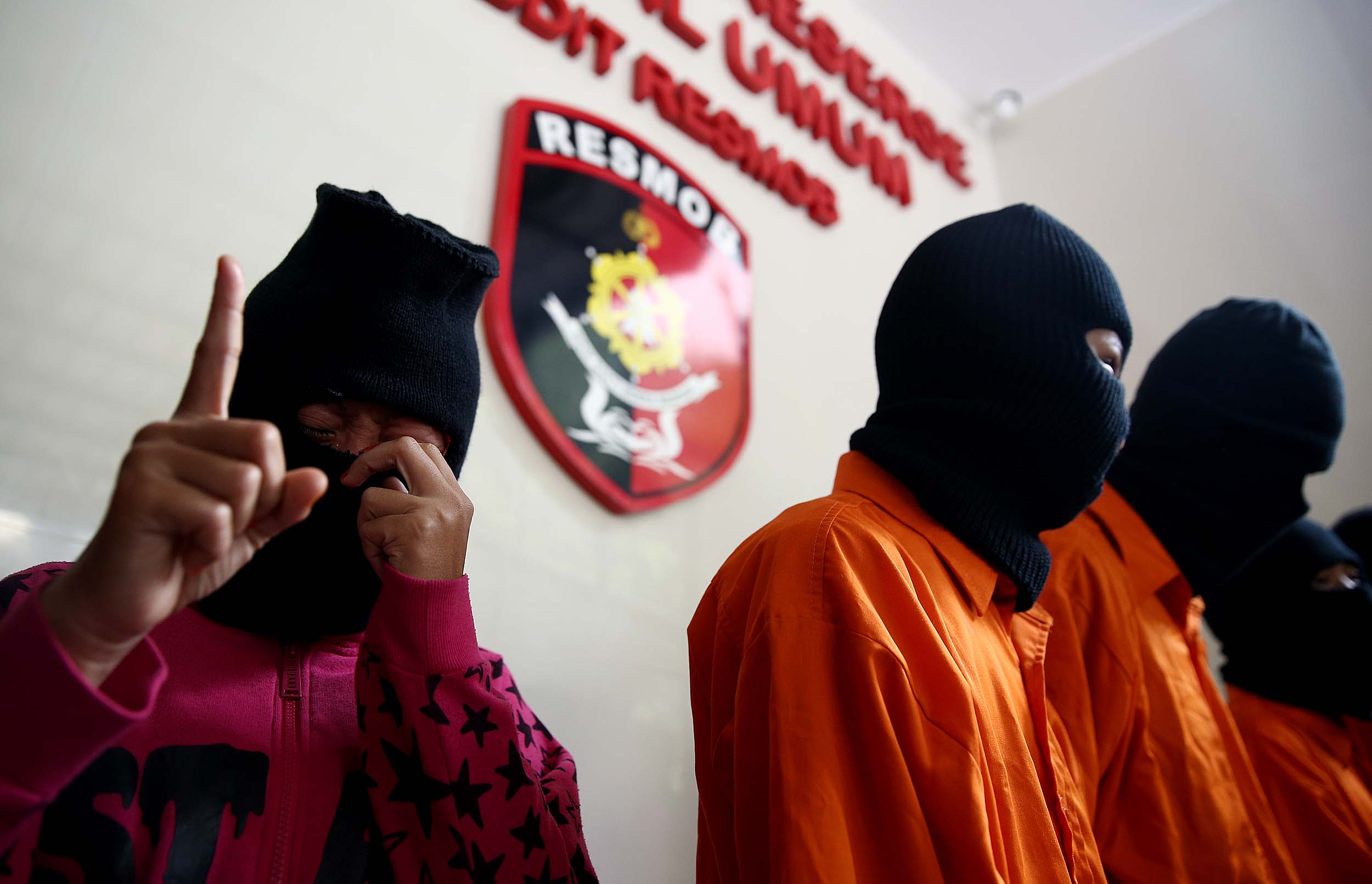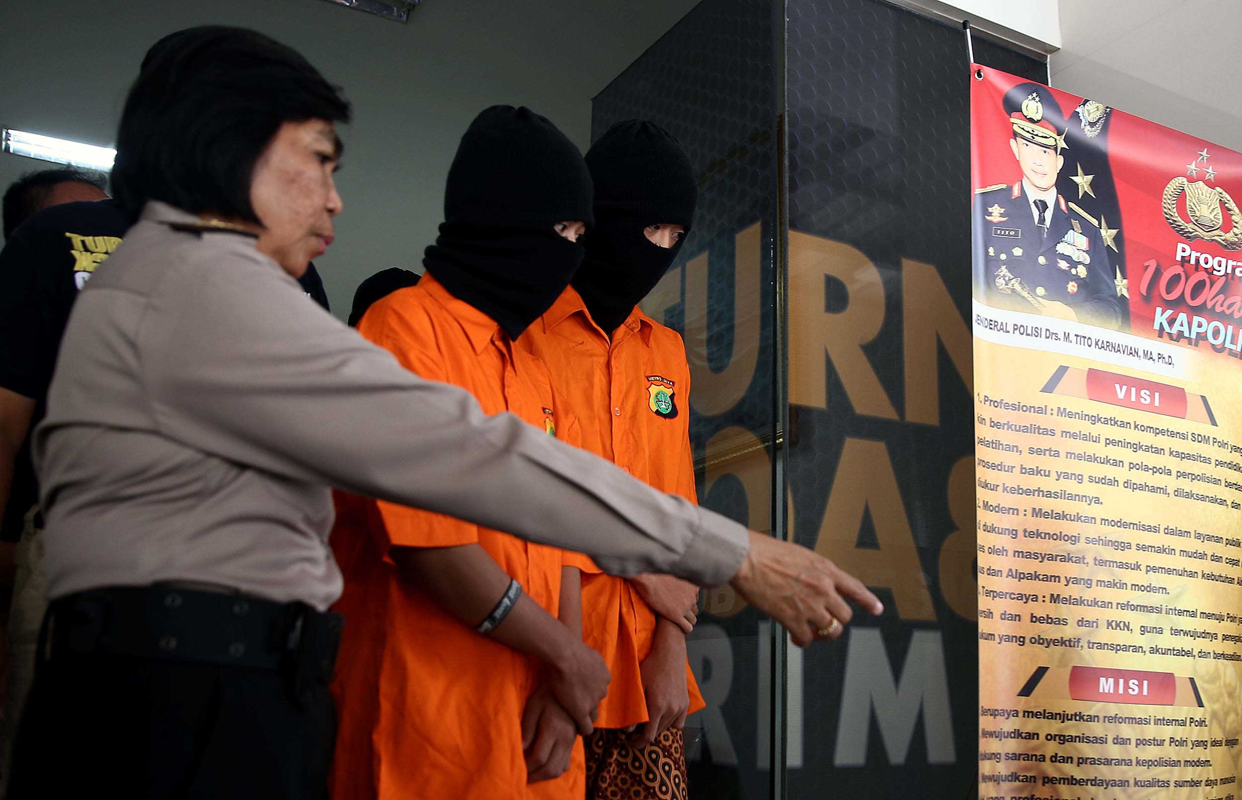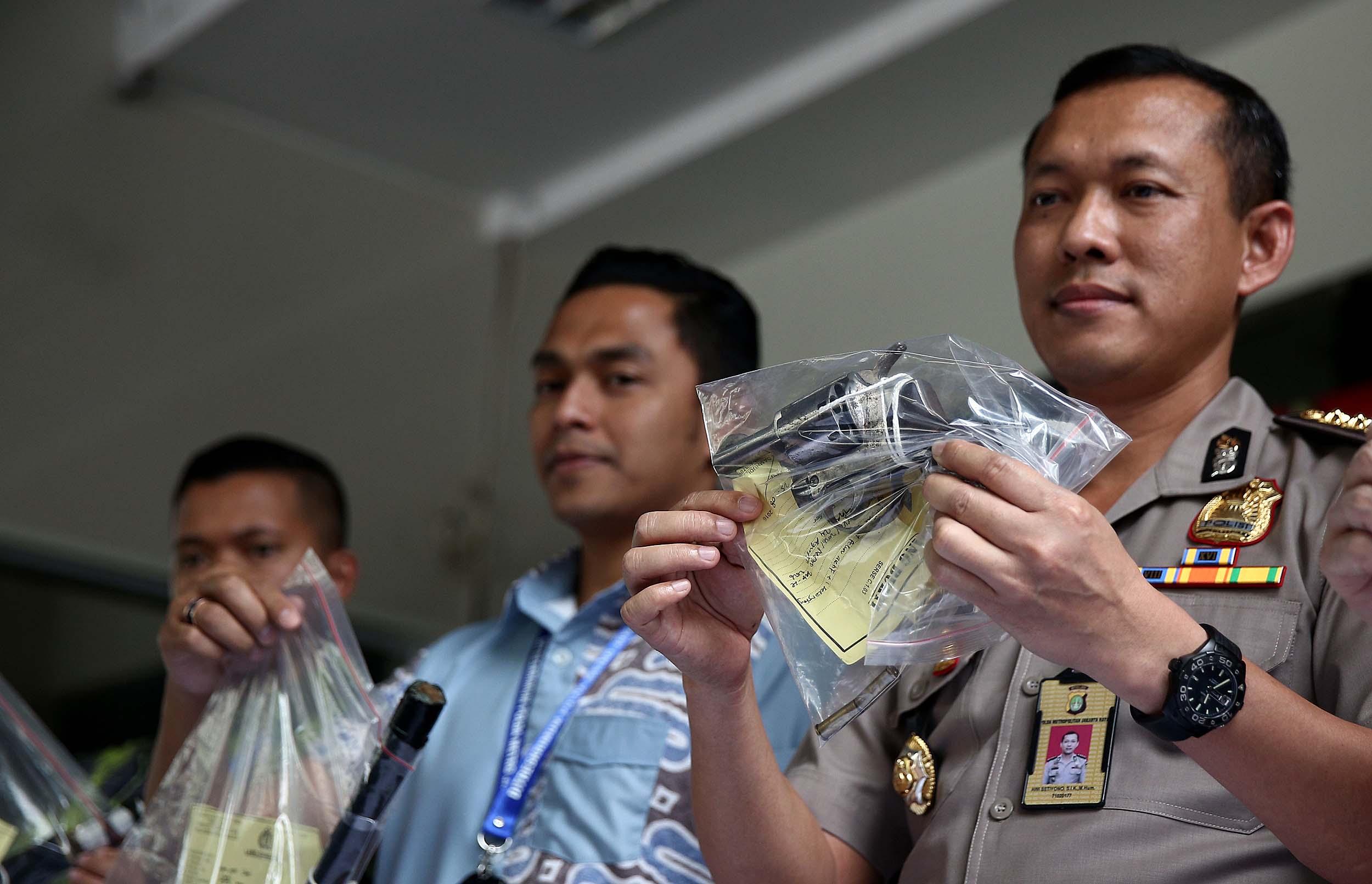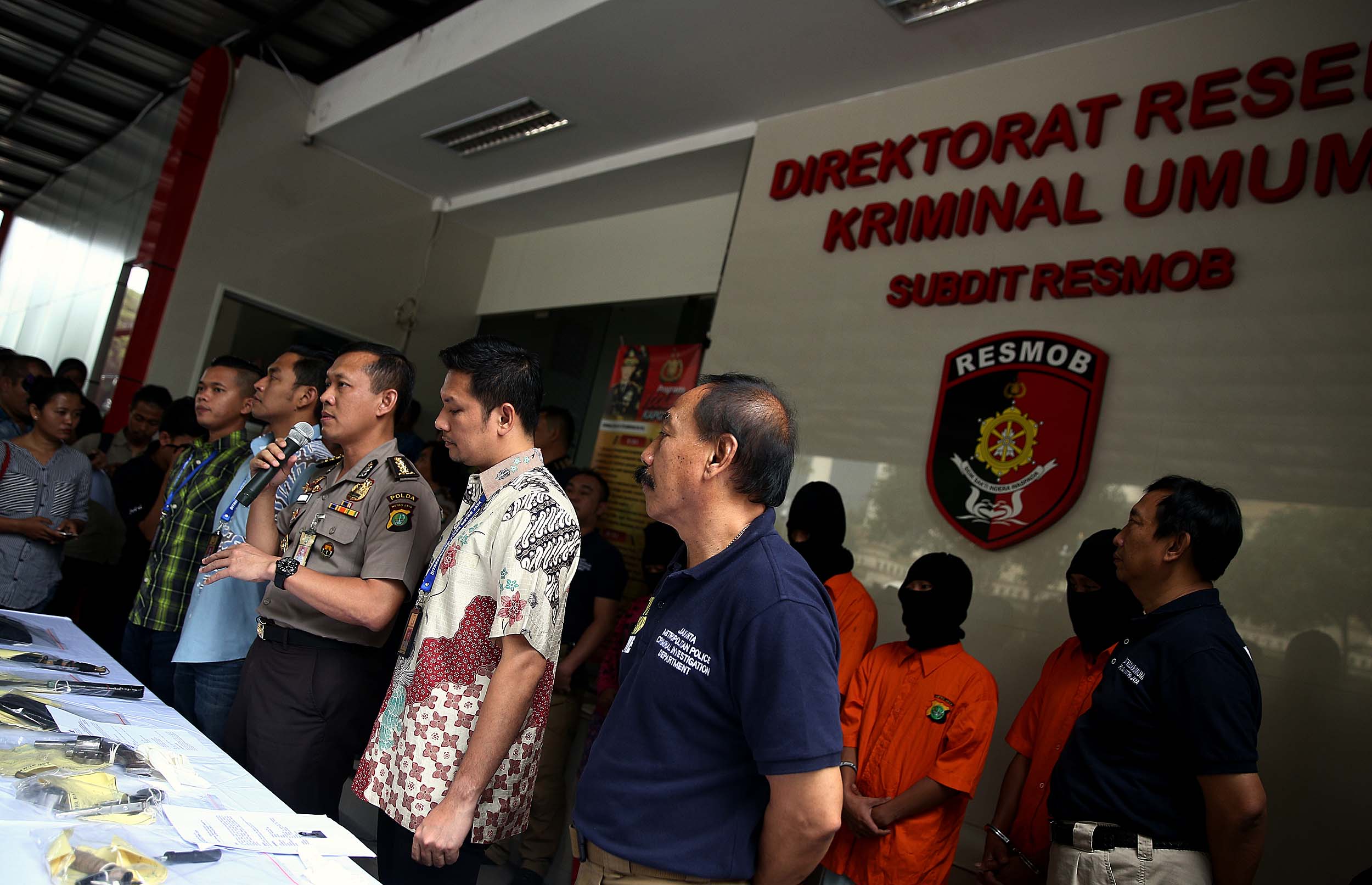Direktorat Reserse Kriminal Umum Subdit Resmob Polda Metro Jaya merilis pelaku tindak pidana pencurian dengan kekerasan dan penadahan (Begal) di Jakarta, Jumat (26/8/2016). polisi mengamankan lima orang tersangka termasuk seorang perempuan sebagai penadah yang sering beroperasi di kawasan Cakung dan Kalibata beserta sejumlah barang bukti 2 pucuk senjata api rakitan, 3 sepeda motor, dan sejumlah senjata tajam yang digunakan untuk melakukan pembegalan.
