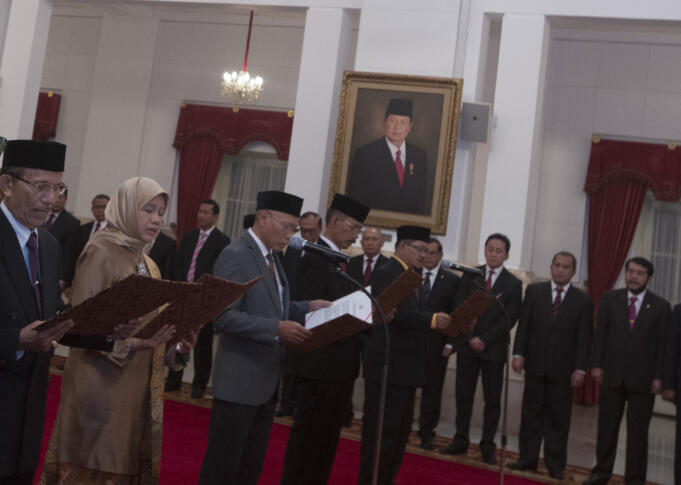 Anggota Komisi Yudisial (KY) (kiri kanan) Maradaman Harahap, Sukma Violetta, Sumartoyo, Joko Sasmito, dan Farij Wajdi mengikuti pengambilan sumpah pelantikan anggota KY di Istana Negara, Jakarta, Jumat (18/12). Presiden Joko Widodo resmi melantik lima anggota KY periode 2015-2020 yang sudah ditetapkan melalui sidang paripurna DPR. ANTARA FOTO/Rosa Panggabean/kye/15.