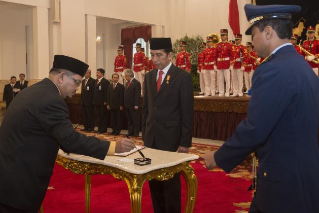 Presiden Joko Widodo (tengah) menyaksikan anggota Komisi Yudisial (KY) Farid Wajdi (kiri) menandatangani dokumen berita acara saat pelantikan anggota KY di Istana Negara, Jakarta, Jumat (18/12). Presiden Joko Widodo resmi melantik lima anggota KY periode 2015-2020 yang sudah ditetapkan melalui sidang paripurna DPR. ANTARA FOTO/Rosa Panggabean/kye/15.