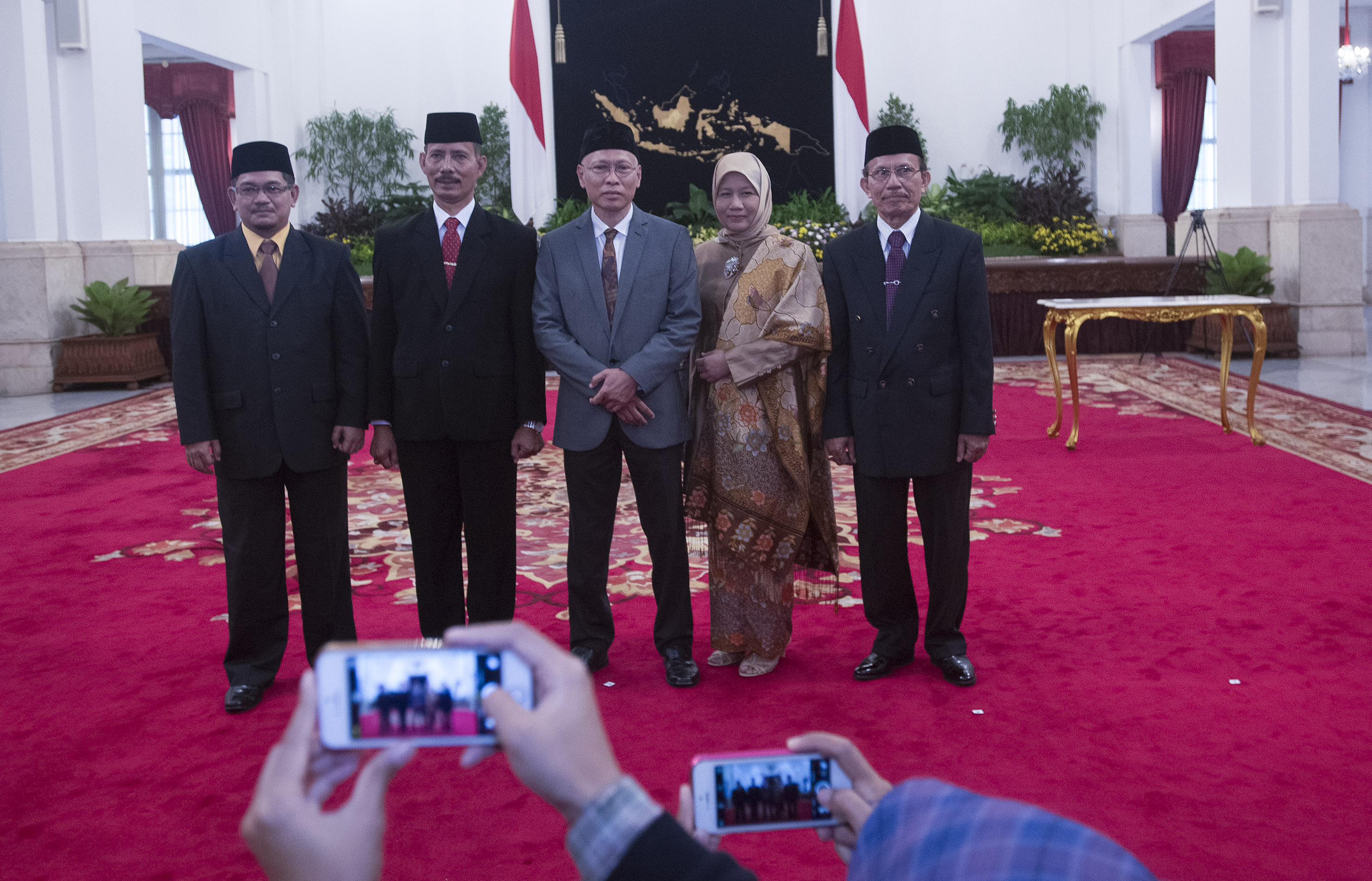 Anggota Komisi Yudisial (KY) (kiri kanan) Farij Wajdi, Joko Sasmito, Sumartoyo, Sukma Violetta, dan Maradaman Harahap berfoto bersama seusai pelantikan anggota KY di Istana Negara, Jakarta, Jumat (18/12). Presiden Joko Widodo resmi melantik lima anggota KY periode 2015-2020 yang sudah ditetapkan melalui sidang paripurna DPR. ANTARA FOTO/Rosa Panggabean/kye/15.